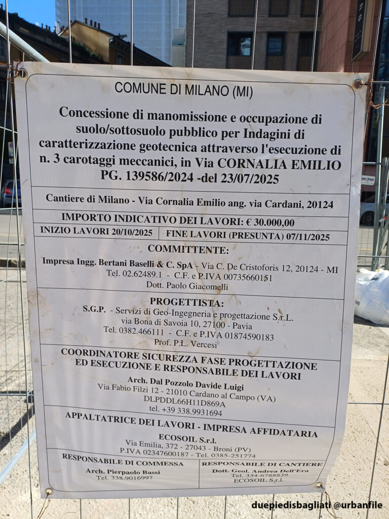 Nel piazzale (decisamente brutto) adibito a parcheggio tra via Emilio Cornalia, via Cardano e le torri di Gioia 22 e i nuovi Portali, sono in corso i lavori per delle indagini di caratterizzazione geotecnica attraverso l’esecuzione di 3 carotaggi meccanici per l’Impresa Ingg. Bertani Baselli & C. SpA. NOn ne conosciamo ancora le motivazioni.