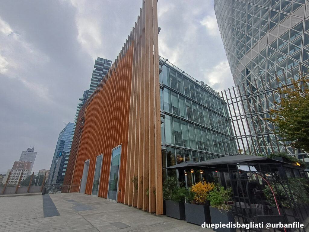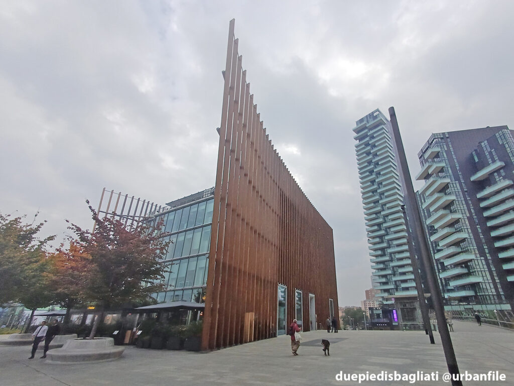 L’edificio, con una superficie lorda di pavimento di circa 2.400 mq, è stato inaugurato nel 2017 e progettato dall’architetto Mario Cucinella. Conceputo come un unicum architettonico, il ritmo dei grandi portali crea un’ampia pergola che si affaccia sul parco, in un dialogo costante tra interno ed esterno. L’obiettivo del progetto era quello di offrire uno spazio flessibile e riconfigurabile, capace di adattarsi a funzioni differenti — da uffici a spazi commerciali — valorizzando al contempo la relazione con il contesto urbano, in particolare con la graziosa porzione di piazza Gae Aulenti che funge da “terrazza pubblica” dell’edificio.