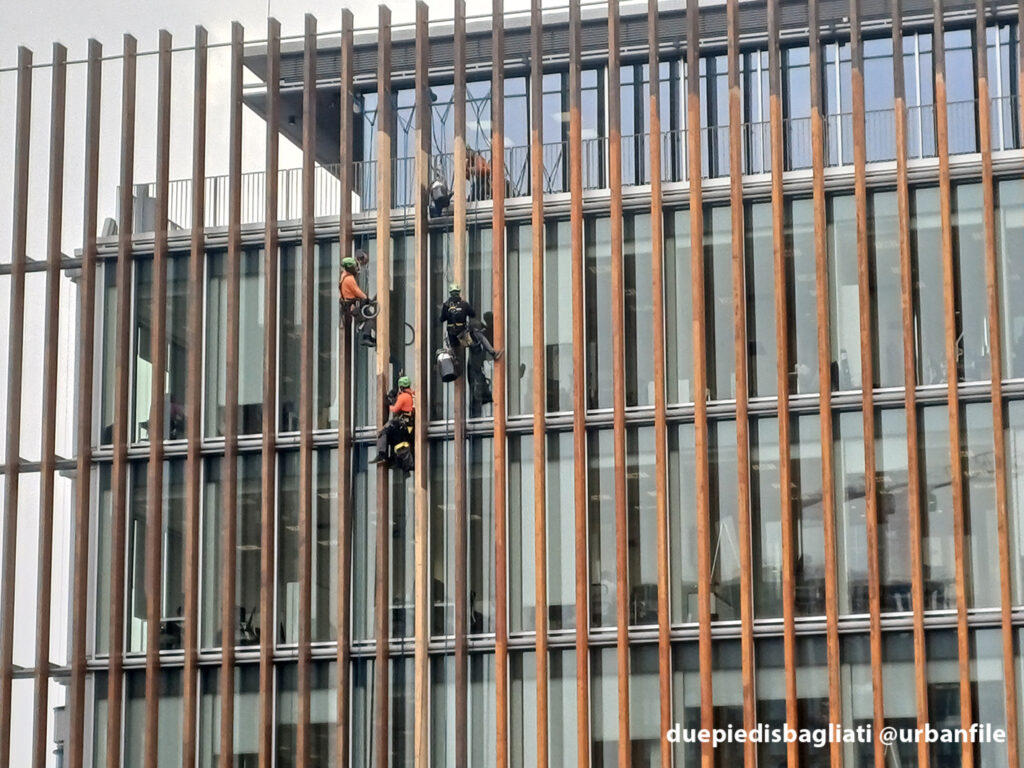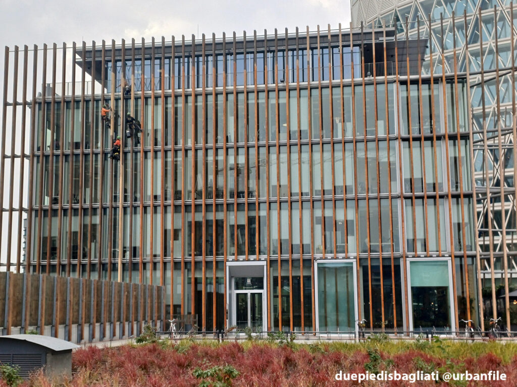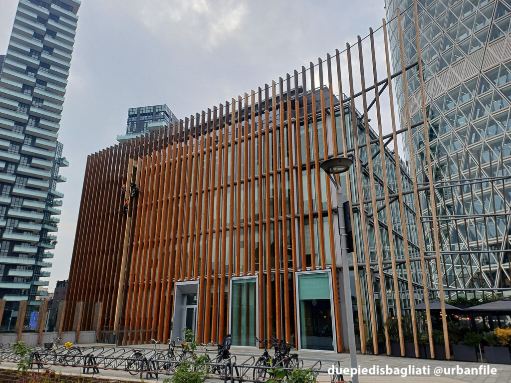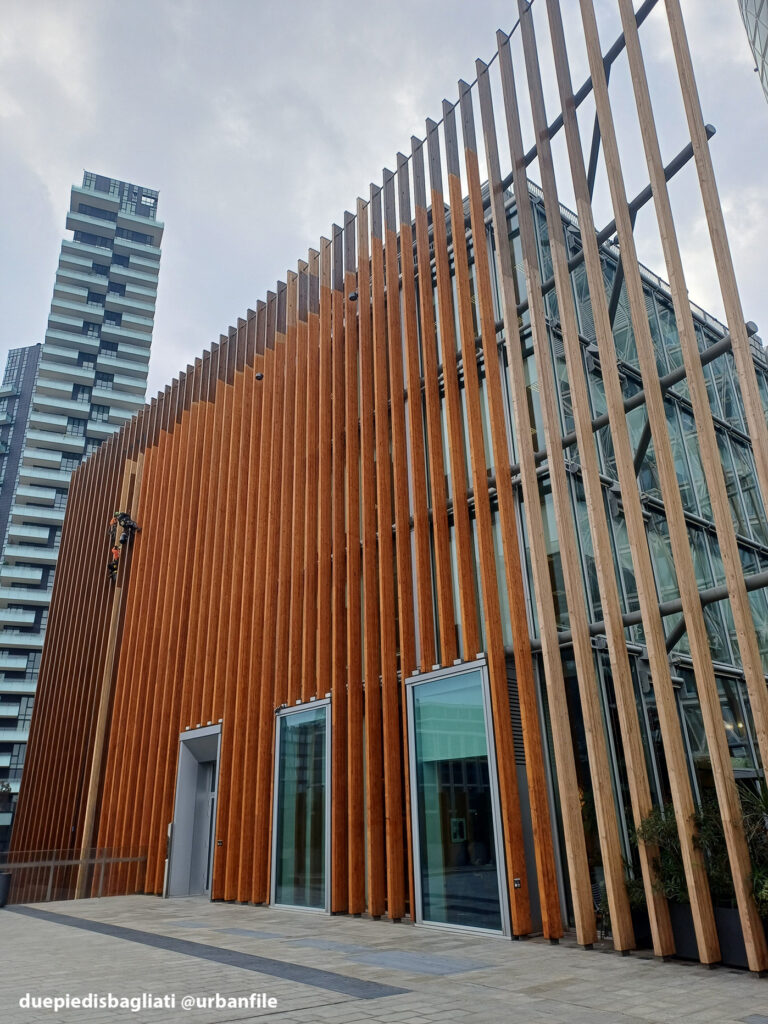 Ottobre 2025. Affacciato da un lato su piazza Gae Aulenti e dall’altro sul Giardino di Porta Nuova – la Biblioteca degli Alberi – l’edificio sede di COIMA, circa 2.000 metri quadrati di vetro e acciaio avvolti da due grandi ali lignee, è sottoposto ad un piccolo “lifting” da qualche settimana. La struttura, che ospita gli uffici e le sale riunioni dei vertici della società artefice del quartiere sviluppatosi attorno alla Biblioteca degli Alberi, necessita infatti di un intervento di manutenzione: le superfici lignee, dopo quasi dieci anni dalla realizzazione, mostrano i segni del tempo e le listarelle di legno composito saranno oggetto di restauro e trattamento conservativo.