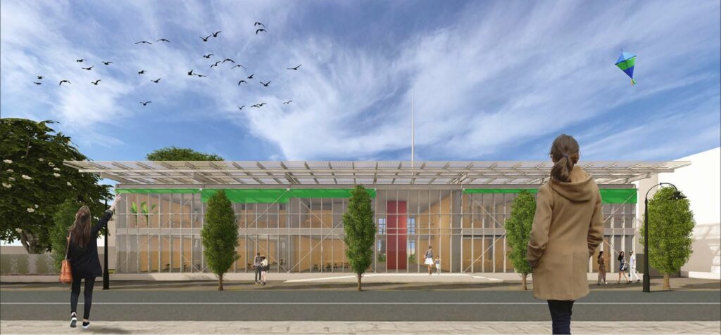 L’ingresso principale avverrà in corrispondenza della terza campata da Ovest che si immette nella hall a doppia altezza, da cui si snodano i percorsi verso gli ambienti del piano terra e del piano primo, raggiungibili mediante una scala e una piattaforma elevatrice. I locali del piano terra ospiteranno principalmente attività collettive e polifunzionali. In particolare, saranno realizzate tre sale polivalenti di diverse dimensioni in cui svolgere workshop, incontri ed esposizioni.