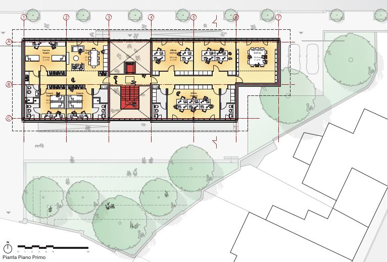 Il piano primo accoglierà invece spazi più riservati e destinati a funzioni direzionali e residenziali. Nell’ala Est è prevista la realizzazione di quattro uffici di circa 30 metri quadrati ciascuno, dotati di due servizi igienici e di due disimpegni tecnici.