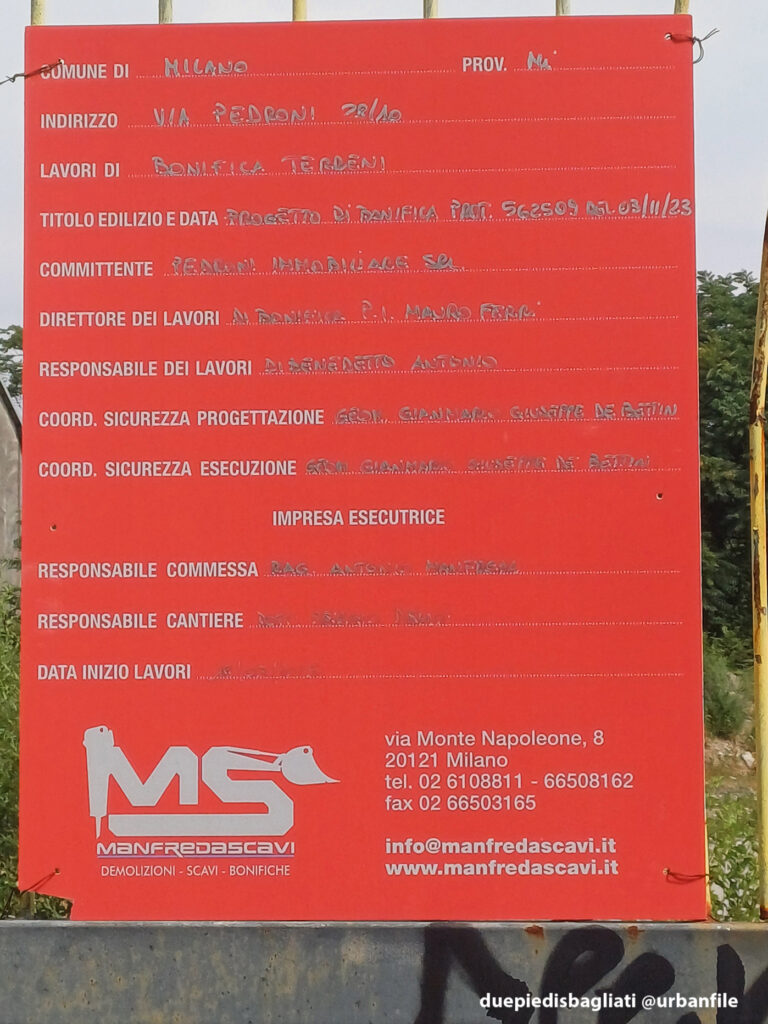 Via Lisiade Pedroni è una strada che separa idealmente Affori dalla Bovisa e sino agli anni Sessanta vi era ancora, dismesso da tempo, il vecchio cimitero dell’antico comune afforese. Corre parallela a via Cialdini e, ad un certo punto, all’altezza del civico 28 si apre il vicolo dallo stesso nome che la unisce a via Cialdini. Qui troviamo una serie di capannoni produttivi e abbandonati, tutti col civico 28. Dalla scorsa primavera il terreno al civico 28/10 è stato spianato. Per il momento non sappiamo altro.