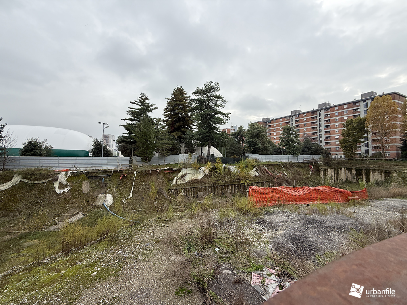 Dietro i palazzoni si trova, in via Ettore Ciccotti 5 il cantiere mai completato del parcheggio di interscambio aperto nel giugno del 2024.