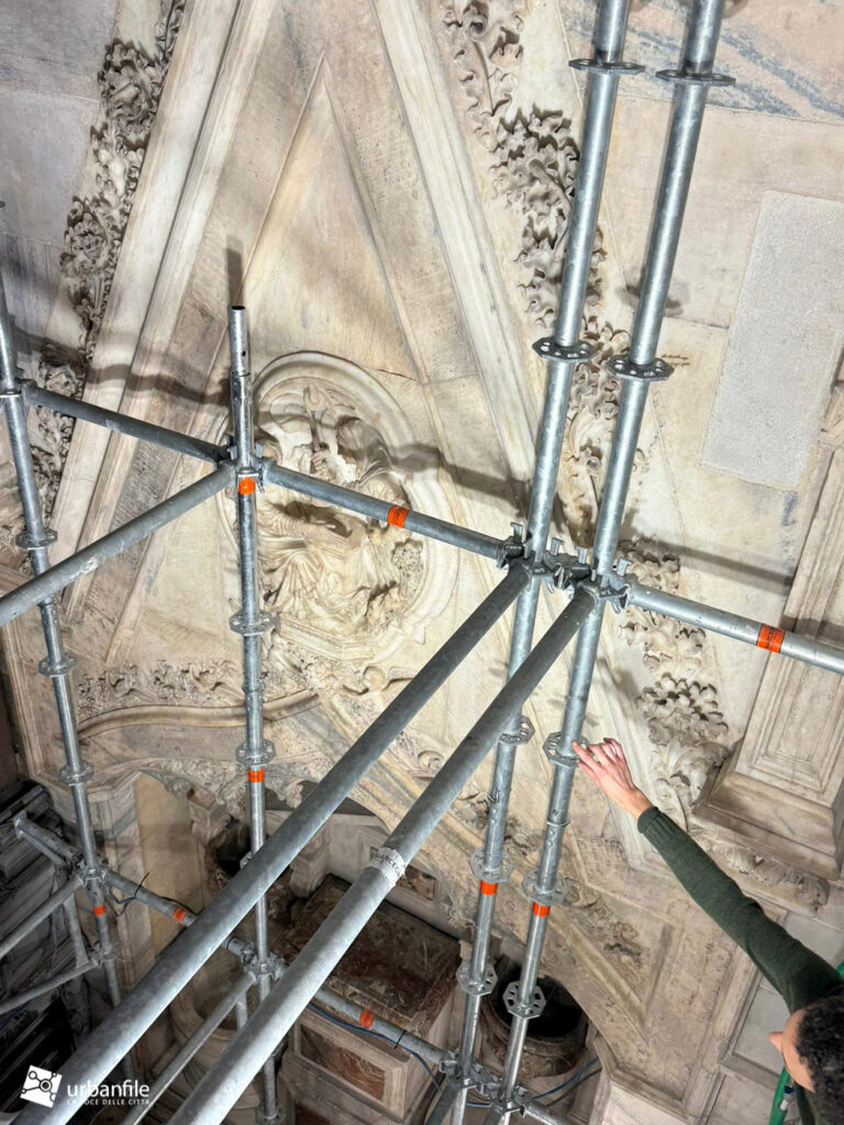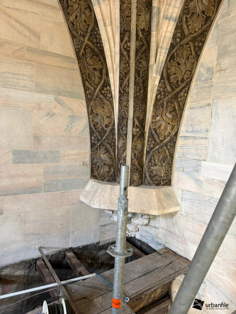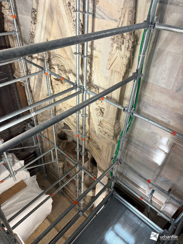 All’interno della Sacrestia, di fronte al portale, si trova il lavabo di Giovannino de’ Grassi, un capolavoro che fonde la precisione dello scultore con la raffinatezza del miniatore. Il recente restauro, curato da Lucchini Restauri srl con Francesca Siena, ha restituito alla superficie marmorea la sua leggerezza cromatica originaria, grazie a un delicato lavoro di pulitura con gel di agar-agar e laser controllati.
