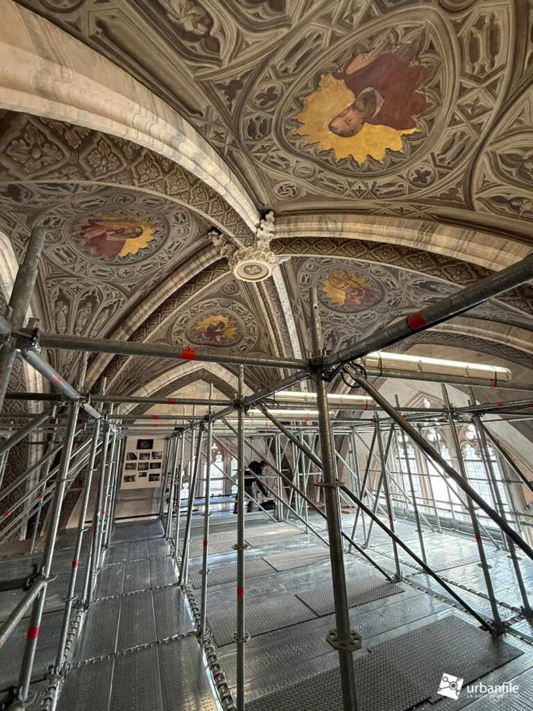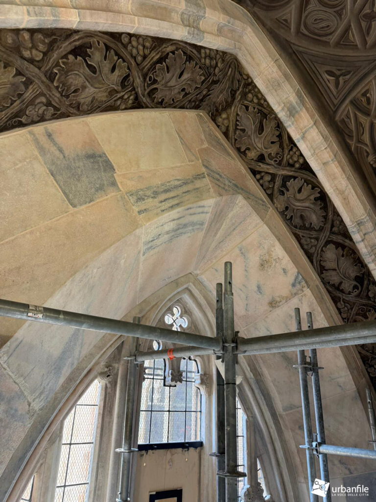 Le volte, decorate nell’Ottocento da Giuseppe Knoller e Gustavo Noyer, sono state oggetto di un intervento particolarmente complesso. Gli esperti hanno dovuto rimuovere strati di resina acrilica (Paraloid) applicati nel Novecento, che avevano alterato la leggibilità dei dipinti, restituendo trasparenza e profondità alle decorazioni. Il lavoro, condotto con impacchi assorbenti, solventi mirati e persino nanotecnologie, ha permesso di far riemergere le figure originali dei santi e di armonizzare i successivi rifacimenti storicizzati.