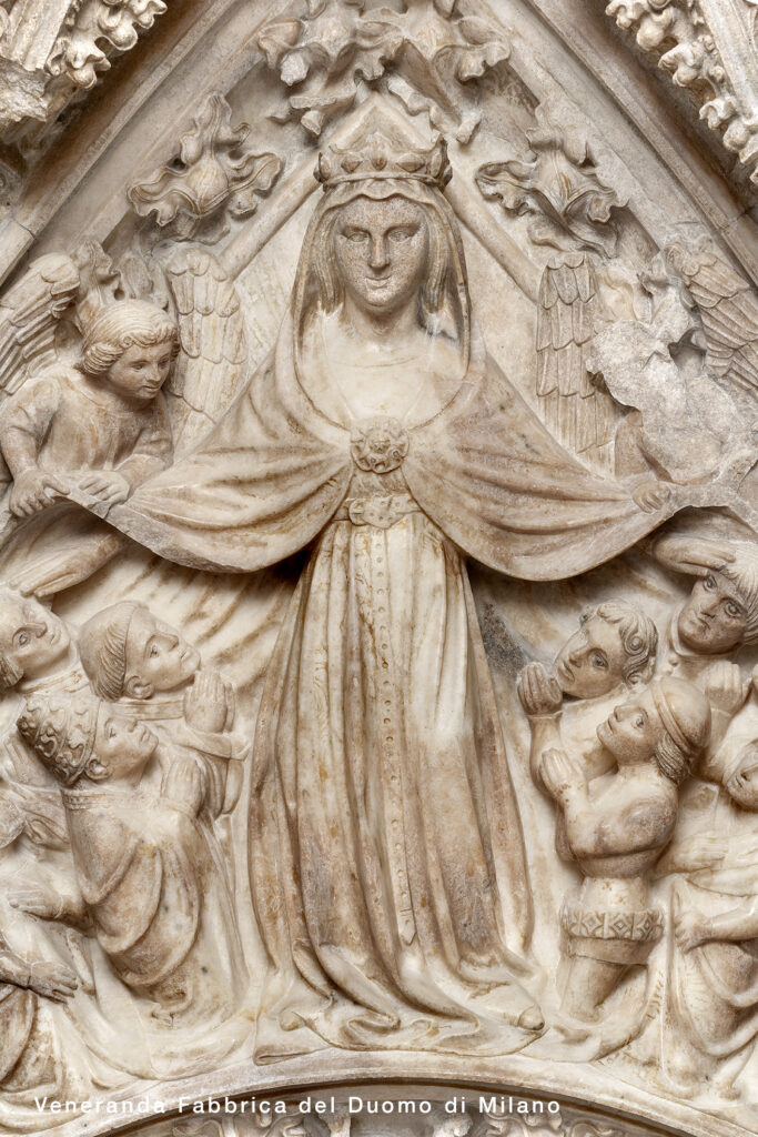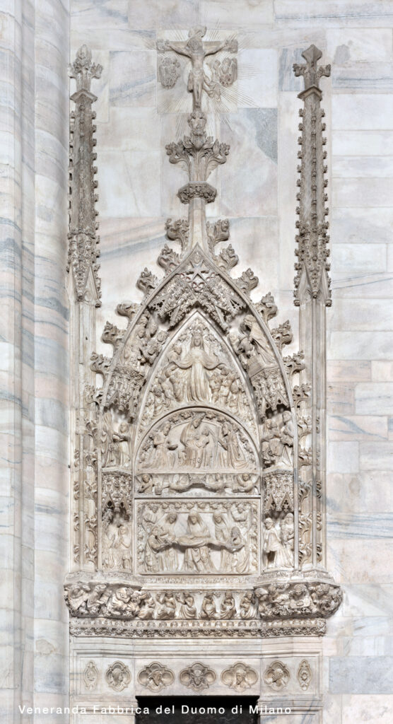 A dominare l’ingresso è il portale monumentale di Hans von Fernach, realizzato alla fine del XIV secolo. Dedicato agli episodi della vita della Vergine Maria, rappresenta uno dei vertici della scultura gotica lombarda. Oggi, grazie a un intervento di restauro accurato e rispettoso, il portale ha ritrovato l’intensità originaria delle sue forme e cromie.