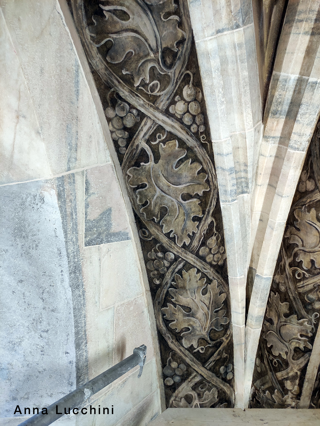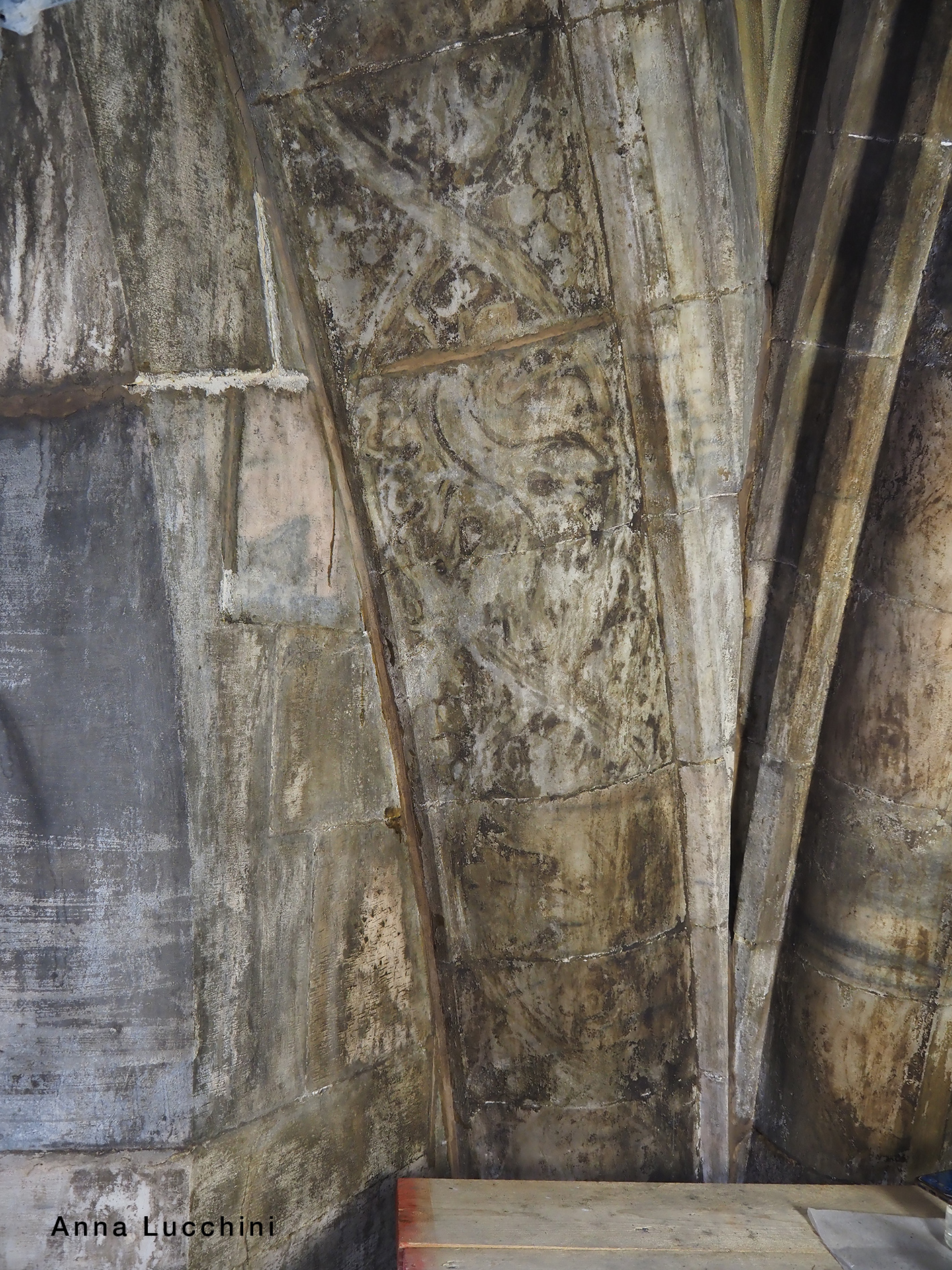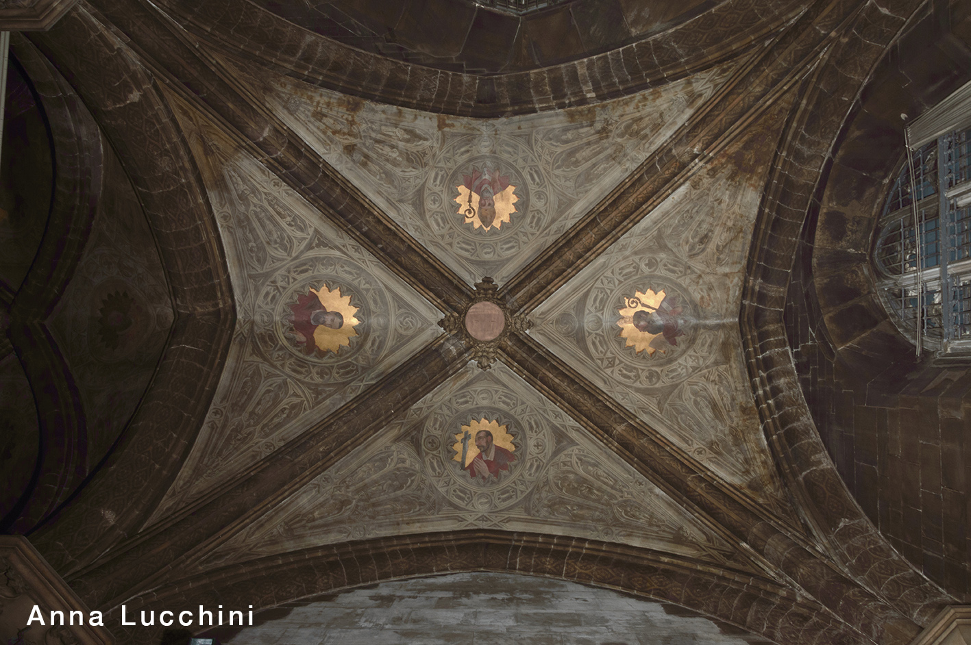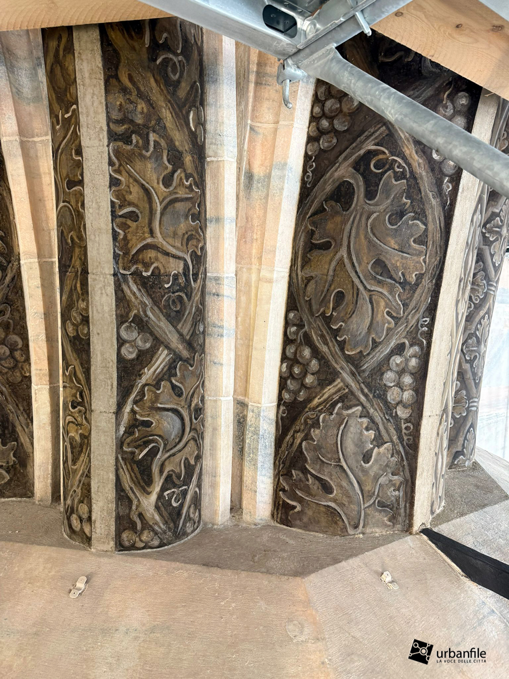 Le volte, decorate nell’Ottocento da Giuseppe Knoller e Gustavo Noyer, sono state oggetto di un intervento particolarmente complesso. Gli esperti hanno dovuto rimuovere strati di resina acrilica (Paraloid) applicati nel Novecento, che avevano alterato la leggibilità dei dipinti, restituendo trasparenza e profondità alle decorazioni. Il lavoro, condotto con impacchi assorbenti, solventi mirati e persino nanotecnologie, ha permesso di far riemergere le figure originali dei santi e di armonizzare i successivi rifacimenti storicizzati.
