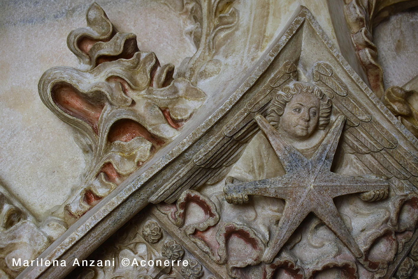 All’interno della Sacrestia, di fronte al portale, si trova il lavabo di Giovannino de’ Grassi, un capolavoro che fonde la precisione dello scultore con la raffinatezza del miniatore. Il recente restauro, curato da Lucchini Restauri srl con Francesca Siena, ha restituito alla superficie marmorea la sua leggerezza cromatica originaria, grazie a un delicato lavoro di pulitura con gel di agar-agar e laser controllati.