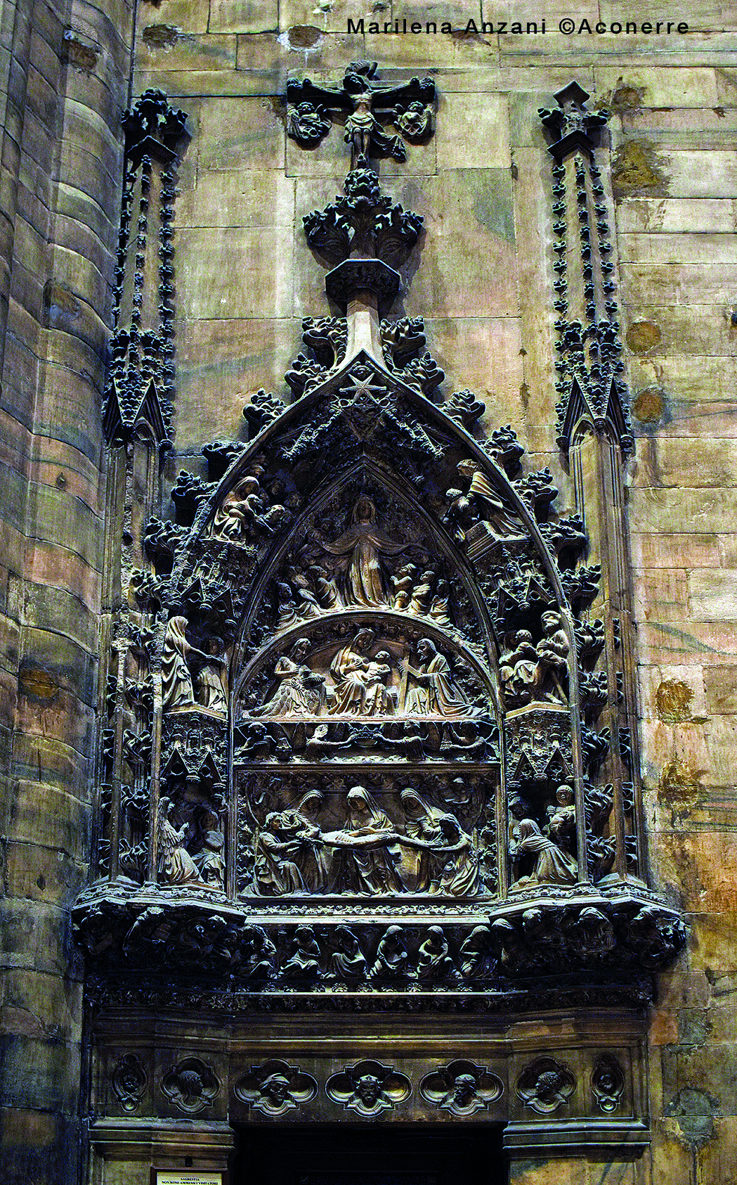 A dominare l’ingresso è il portale monumentale di Hans von Fernach, realizzato alla fine del XIV secolo. Dedicato agli episodi della vita della Vergine Maria, rappresenta uno dei vertici della scultura gotica lombarda. Oggi, grazie a un intervento di restauro accurato e rispettoso, il portale ha ritrovato l’intensità originaria delle sue forme e cromie.