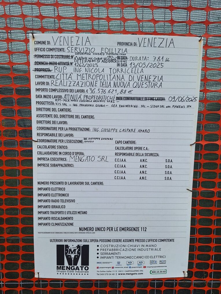 Venezia. Nel quartiere di Marghera a Mestre è in fase di realizzazione la nuova sede della questura di Venezia. Il progetto deriva da un accordo tra il Ministero dell’Interno il quale ha garantito i finanziamenti, il Comune di Venezia che ha messo a disposizione il lotto e la Città metropolitana individuata come stazione appaltante, per un importo economico complessivo di 48milioni di euro circa.