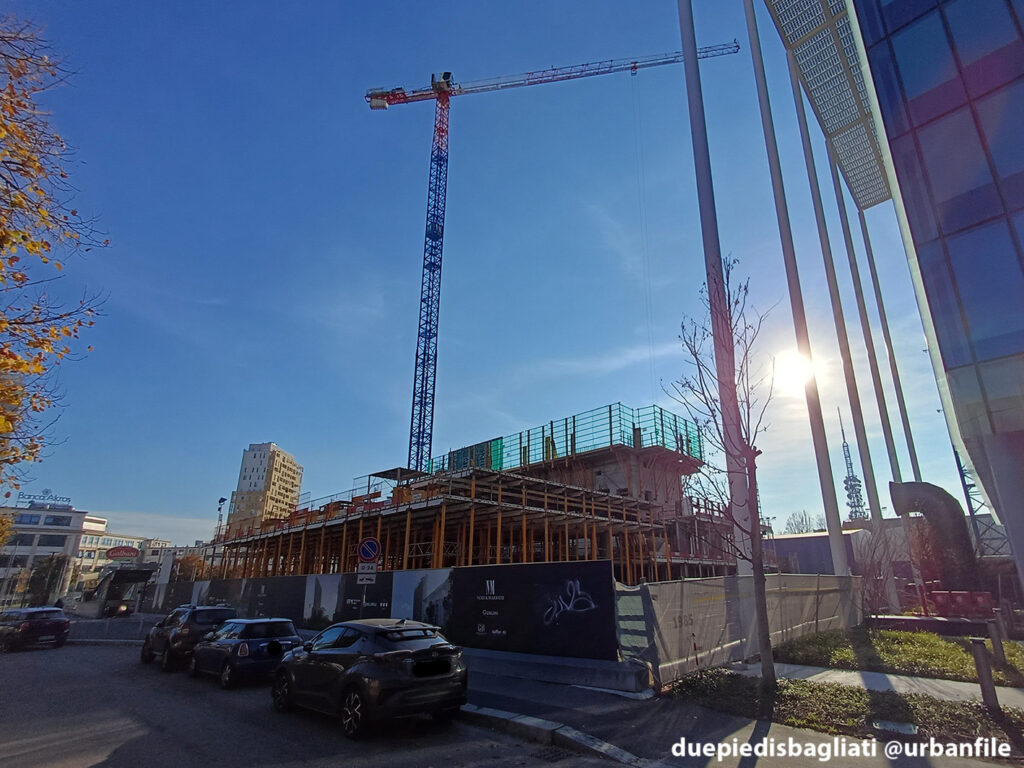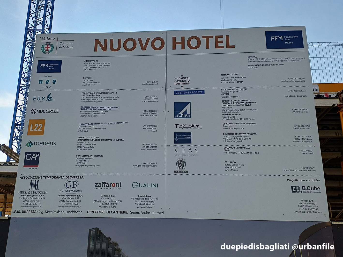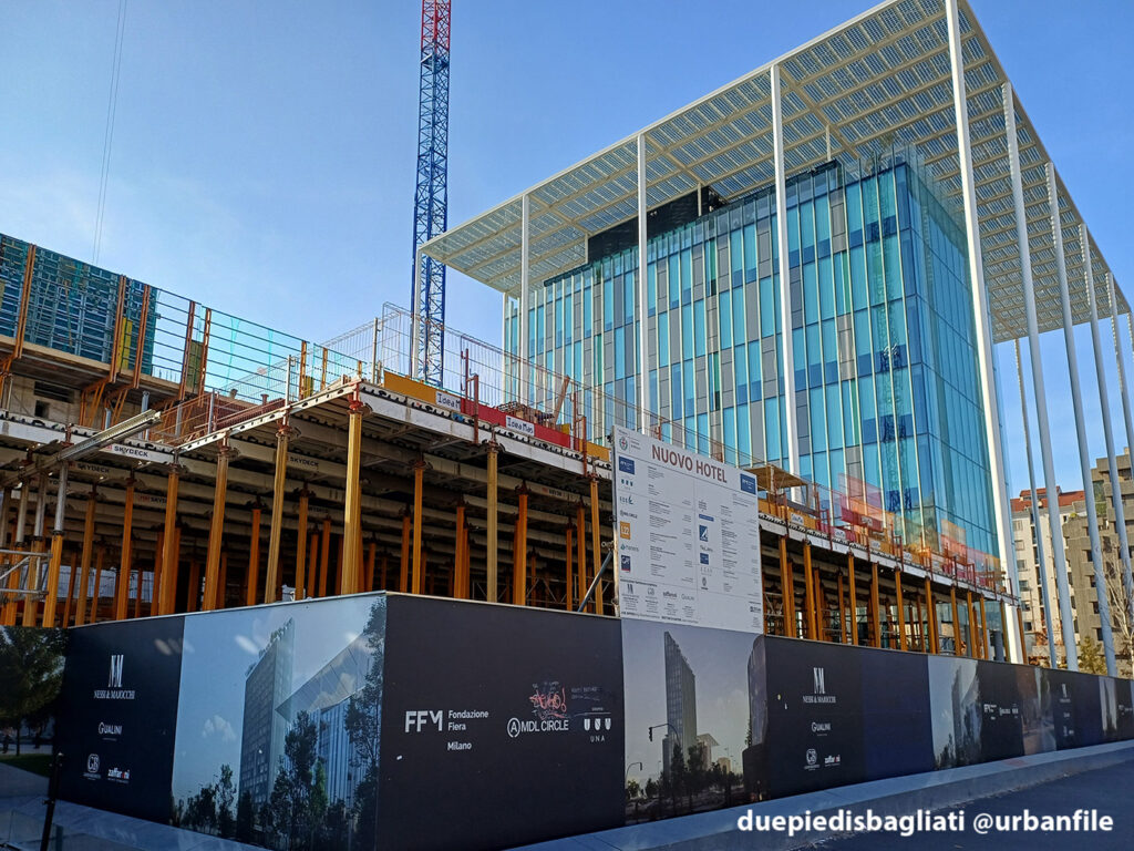 Si tratta del cantiere per la realizzazione di un nuovo albergo da 176 camere distribuite su 22 piani, progettato per supportare anche le attività espositive e congressuali dell’Allianz MiCo. Il concept architettonico è firmato dallo studio Amdl Circle e da Michele De Lucchi, mentre i disegni esecutivi sono a cura dello studio Lombardini22. L’hotel avrebbe dovuto essere completato in tempo per le Olimpiadi Invernali Milano-Cortina 2026, ma tale obiettivo appare ormai difficilmente raggiungibile.