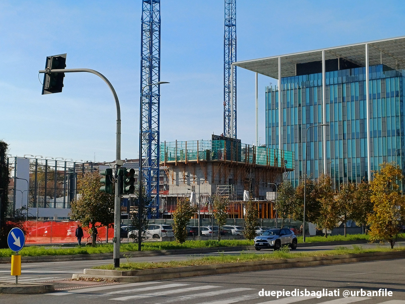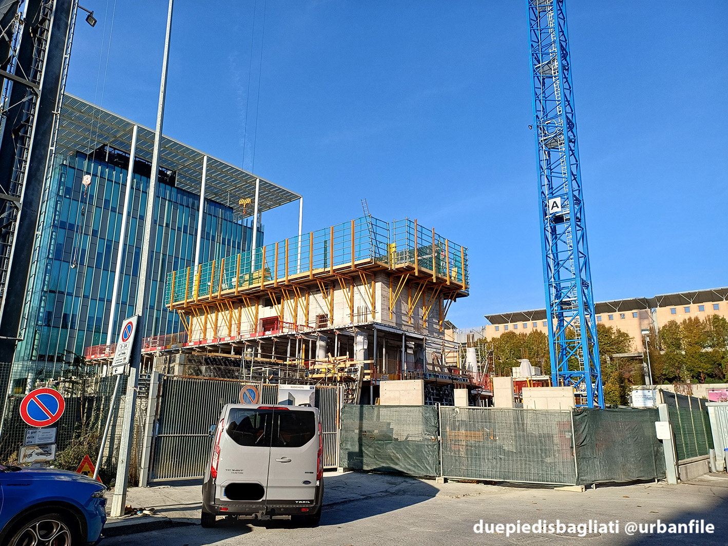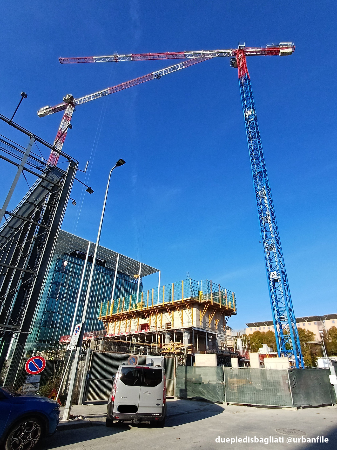 Novembre 2025. Ci siamo: da alcuni giorni le strutture del nuovo grattacielo di viale Scarampo, al Portello, hanno superato il livello del terreno. Il core, destinato a ospitare ascensori e vani scala, inizia già a emergere sopra la prima soletta, affiancato dai primi pilastri.