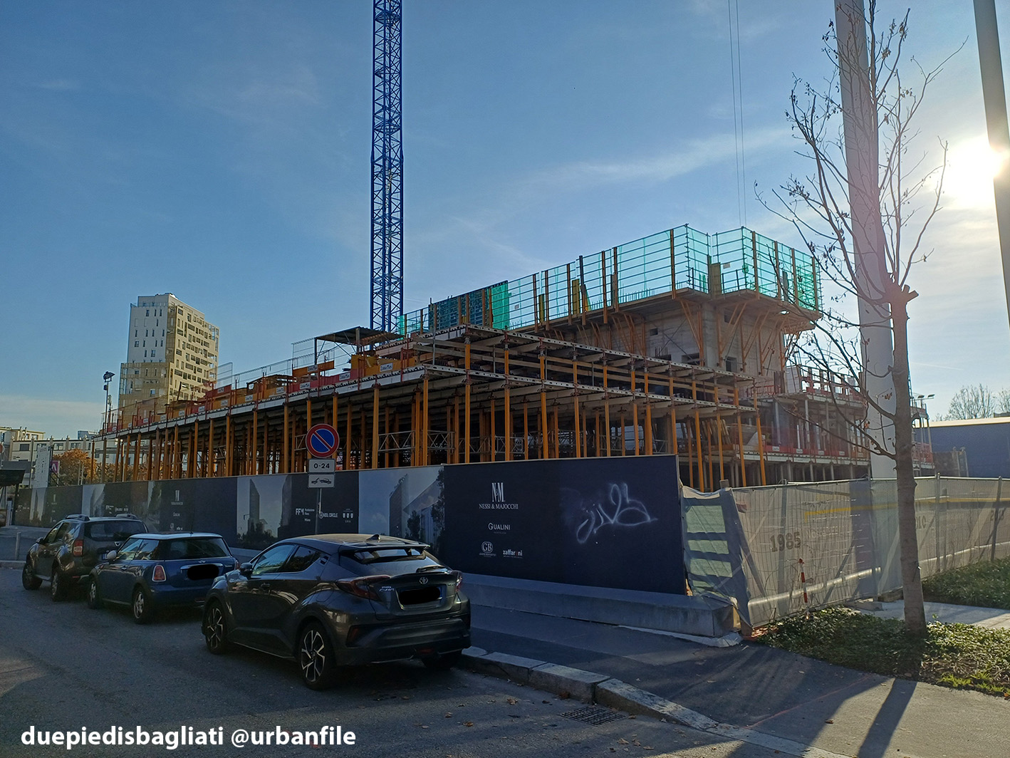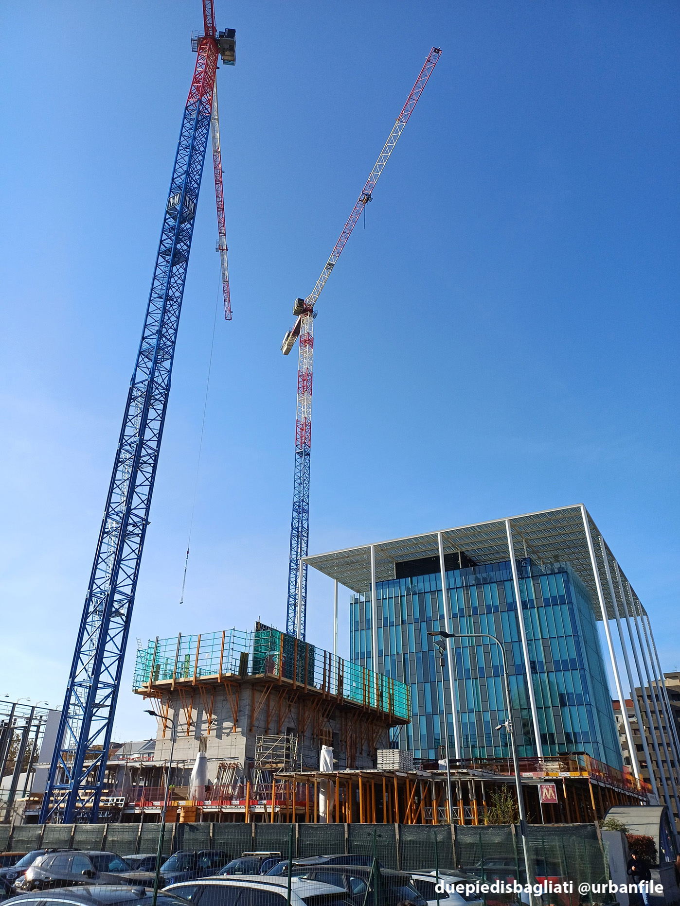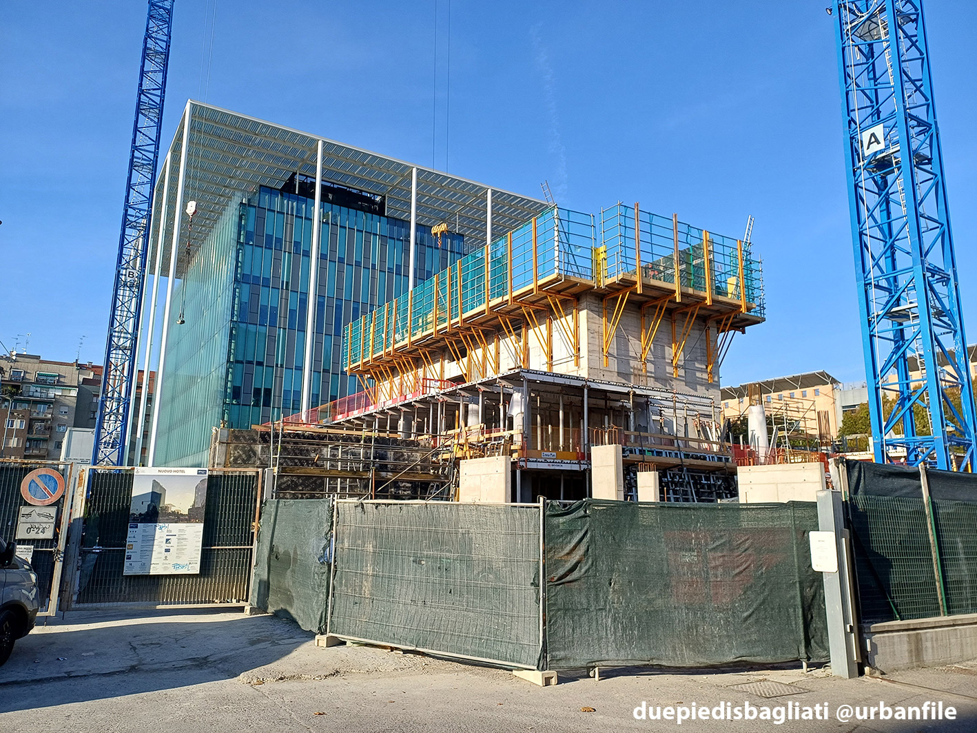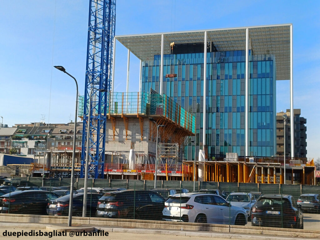 Novembre 2025. Ci siamo: da alcuni giorni le strutture del nuovo grattacielo di viale Scarampo, al Portello, hanno superato il livello del terreno. Il core, destinato a ospitare ascensori e vani scala, inizia già a emergere sopra la prima soletta, affiancato dai primi pilastri.