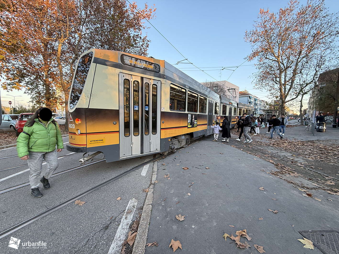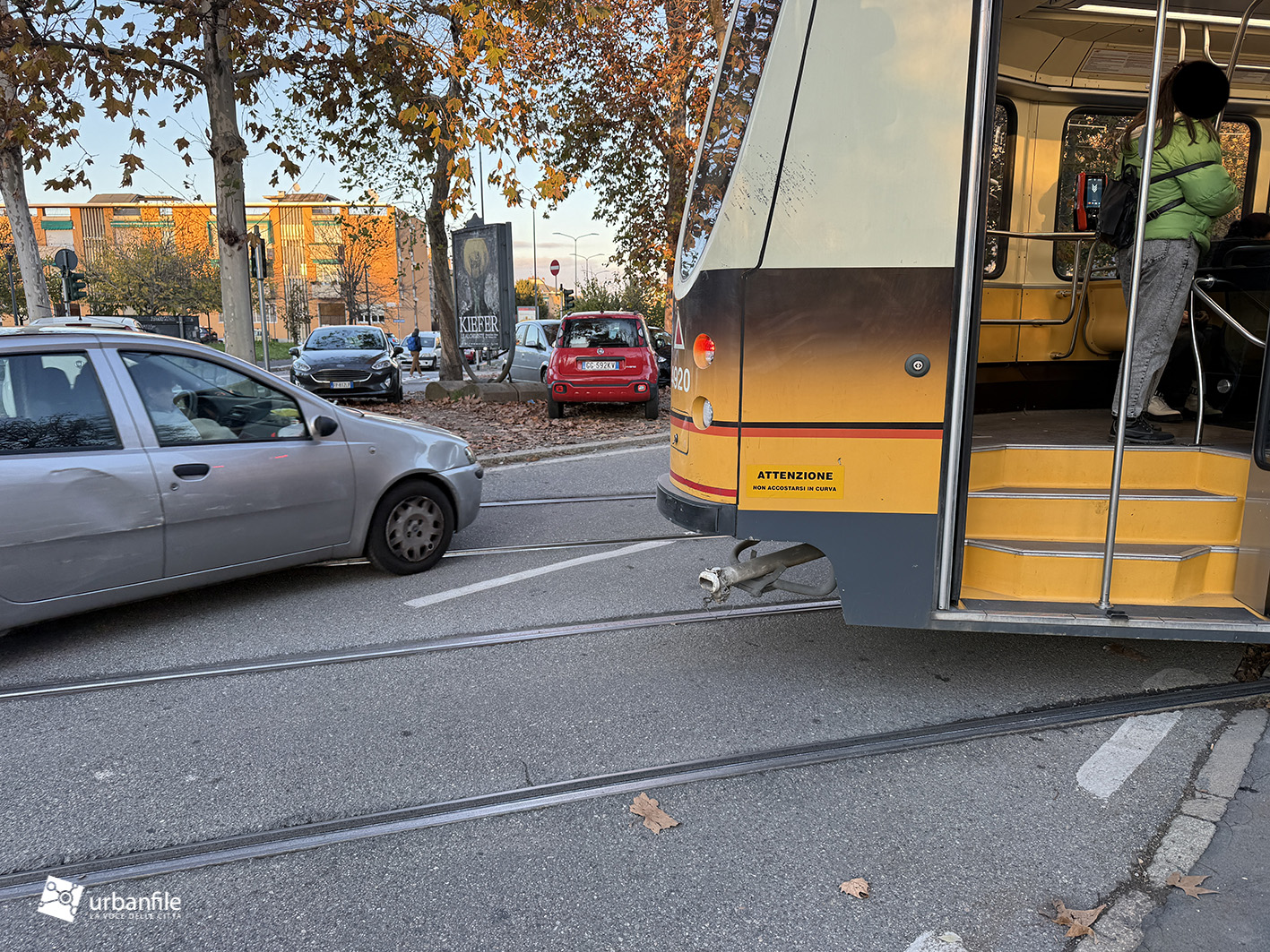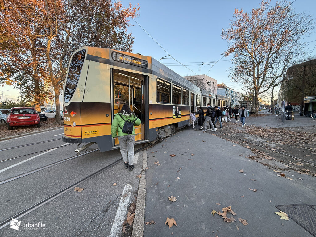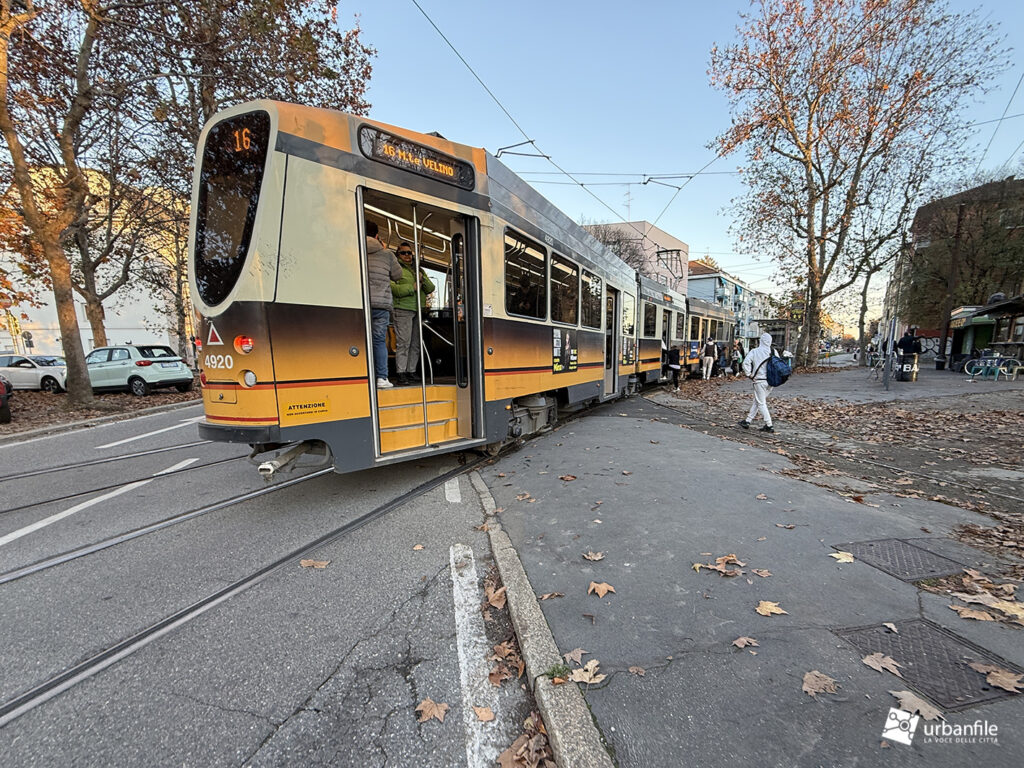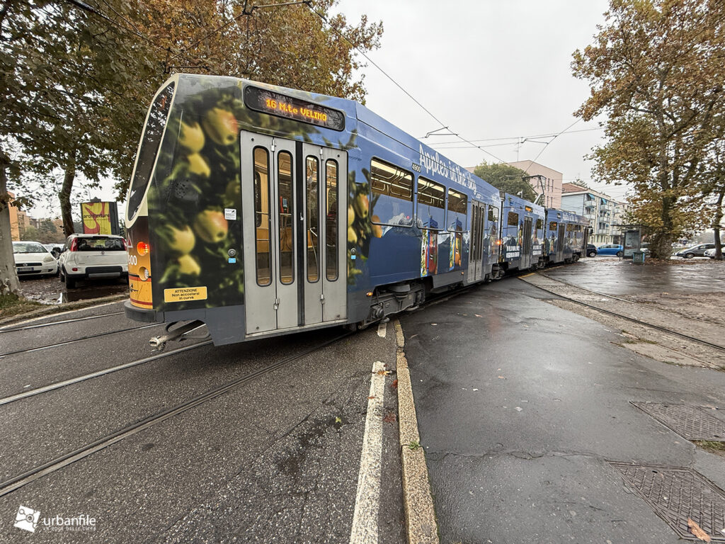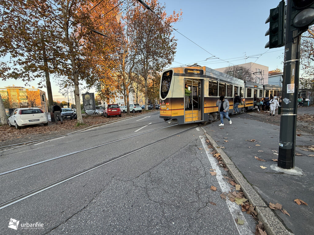Novembre 2025. Il tram della linea 16 che ferma in piazzale Segesta, a San Siro, risulta chiaramente troppo lungo per la fermata attuale: la vettura misura circa 30 metri, mentre la banchina non supera i 27–28 metri ed è per di più situata in curva.