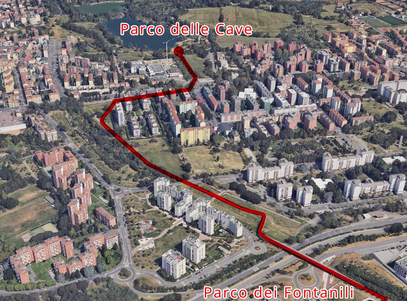Il nuovo percorso ciclo-pedonale si unirà alla passerella di via Parri che proviene dal Parco dei Fontanili e, giungendo in via Cividale del Friuli, attraversando via delle Forze Armate, penetrerà nel percorso di via Cancano collegandosi ai percorsi del Parco delle Cave.