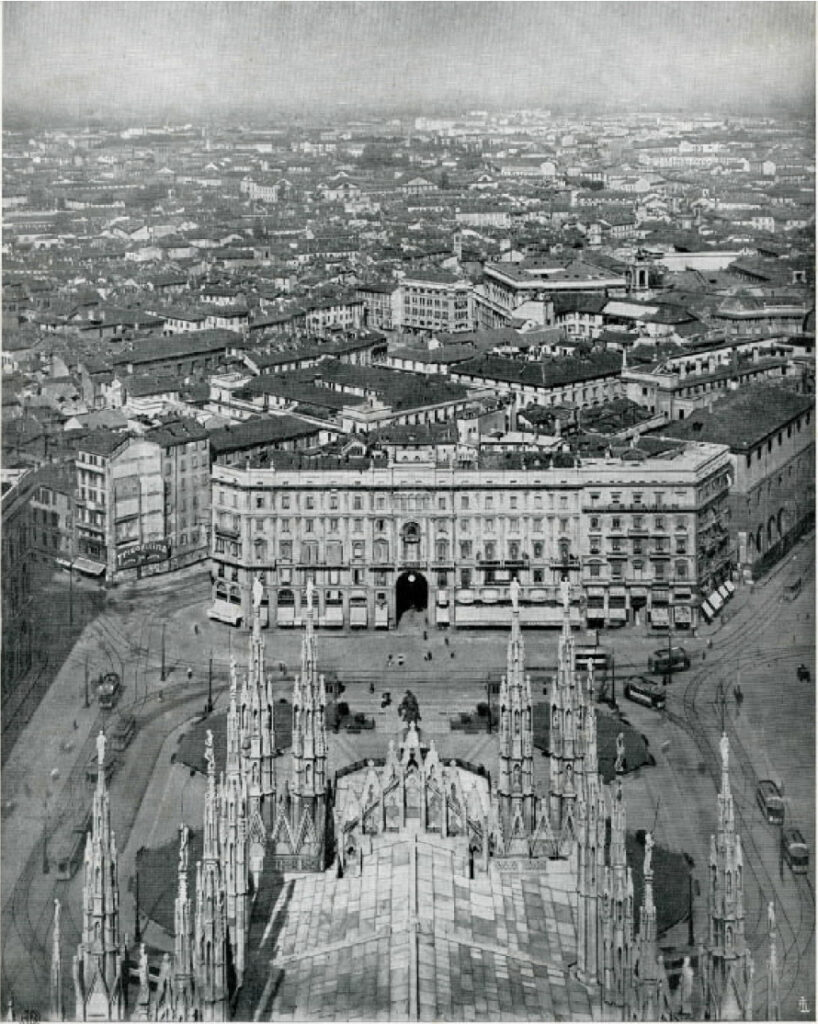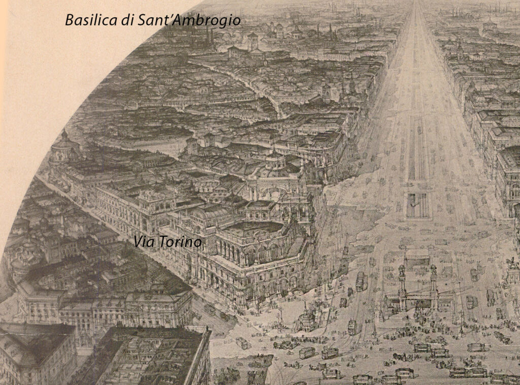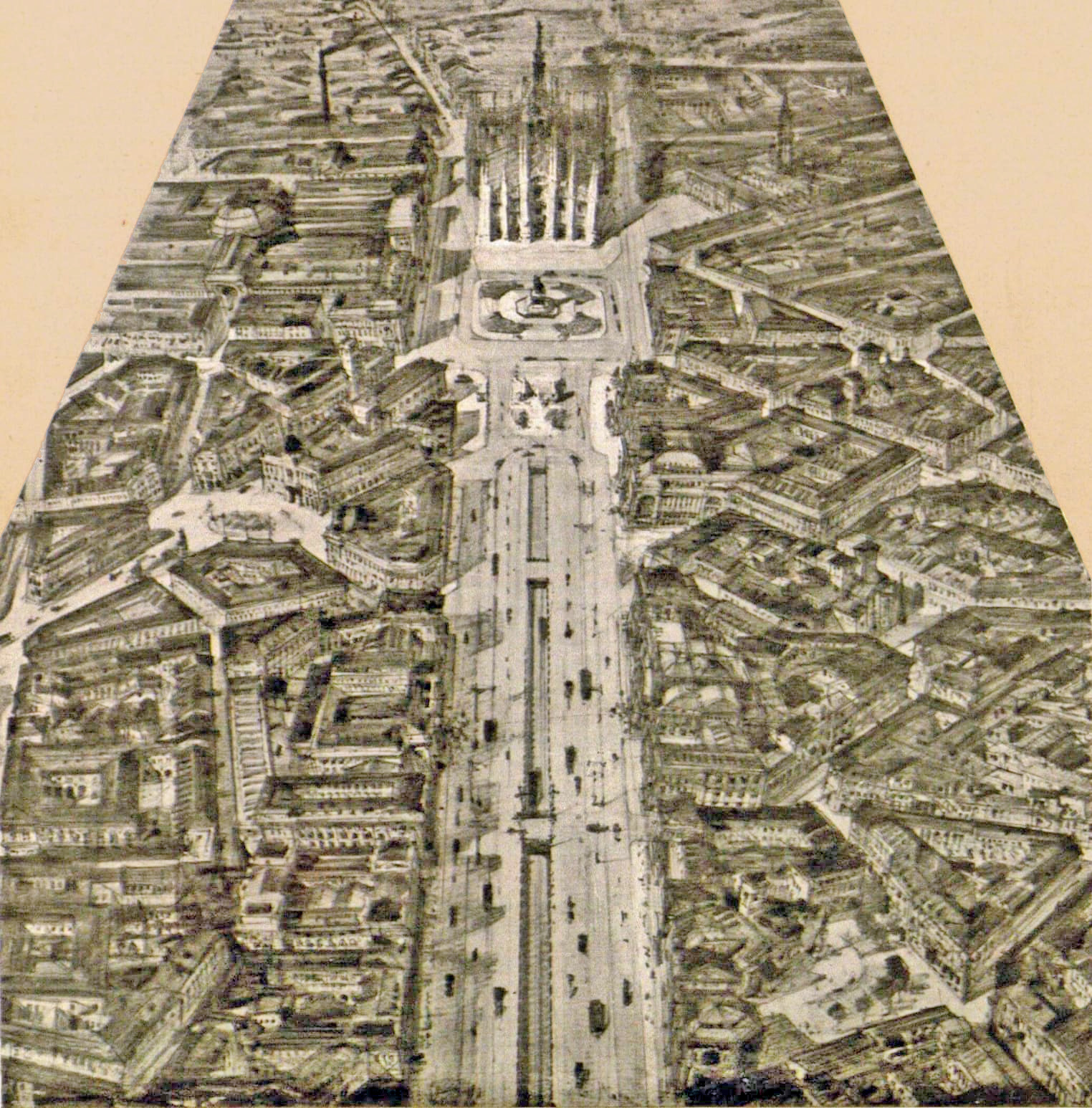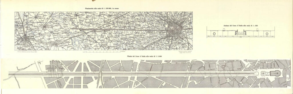 Per comprendere il fascino esercitato dal “Corso d’Italia” bisogna calarsi nella Milano dei primi del Novecento: una città in rapida crescita ma ancora imprigionata nella sua struttura medievale, fatta di strade tortuose e tram costretti a rallentare tra curve e strettoie, mentre il centro faticava a sostenere i ritmi di una metropoli moderna. In questo contesto, l’idea di un grande asse rettilineo che dal Duomo si spingesse verso ovest, fino alla campagna e al fiume Ticino, apparve come una proposta radicale e visionaria: una vera e propria “aorta” urbana capace di portare ordine e slancio alla città.