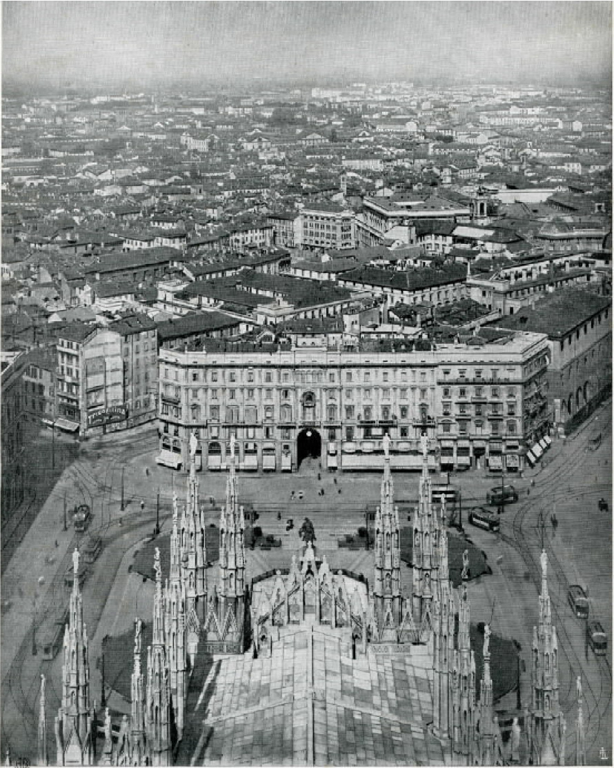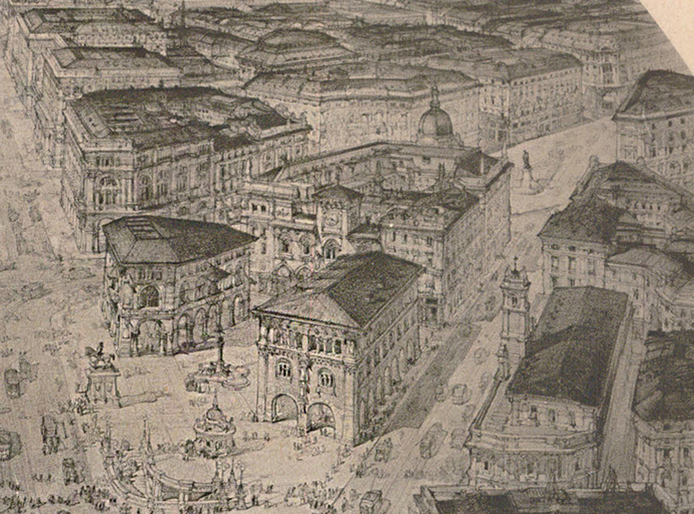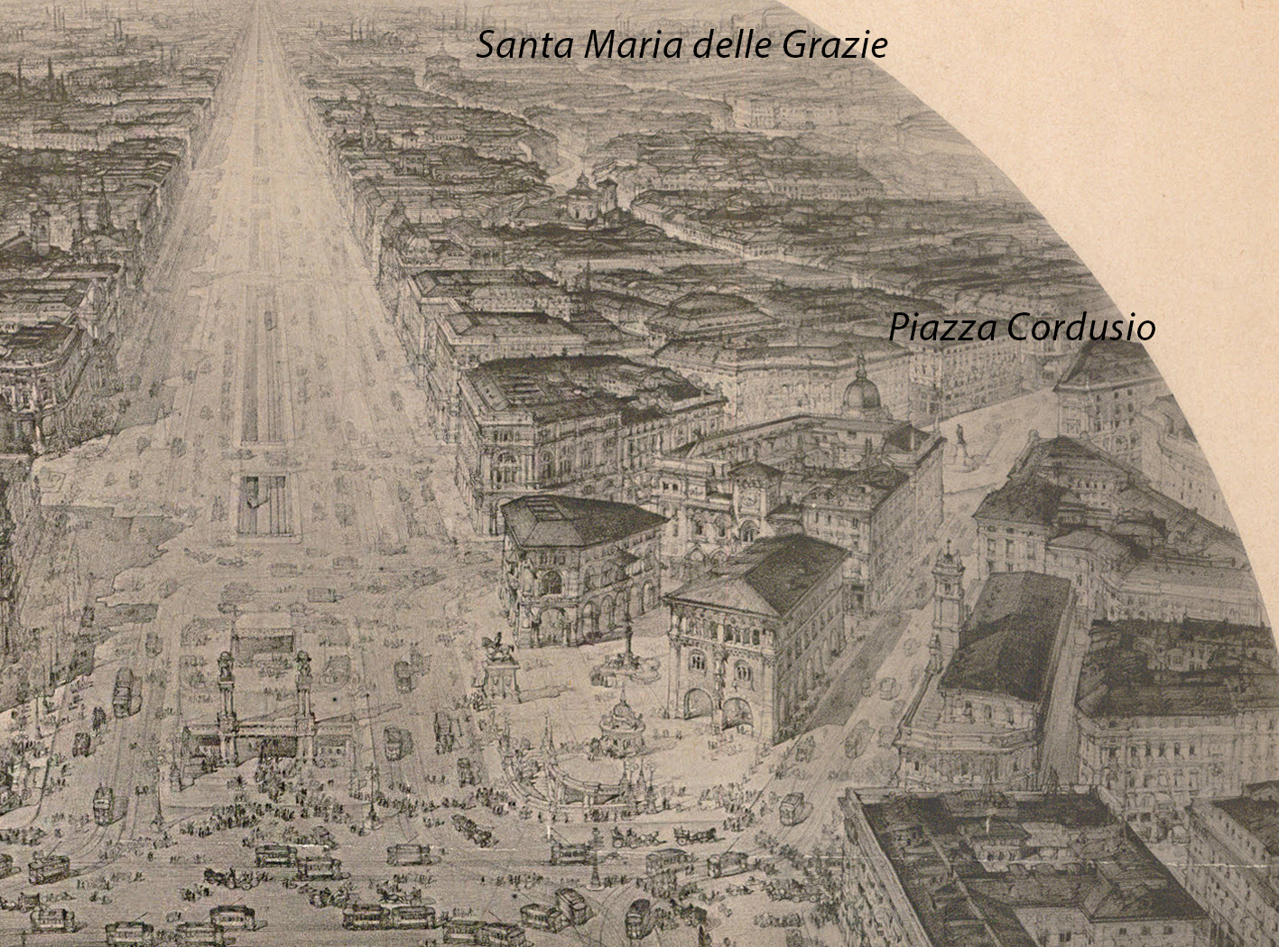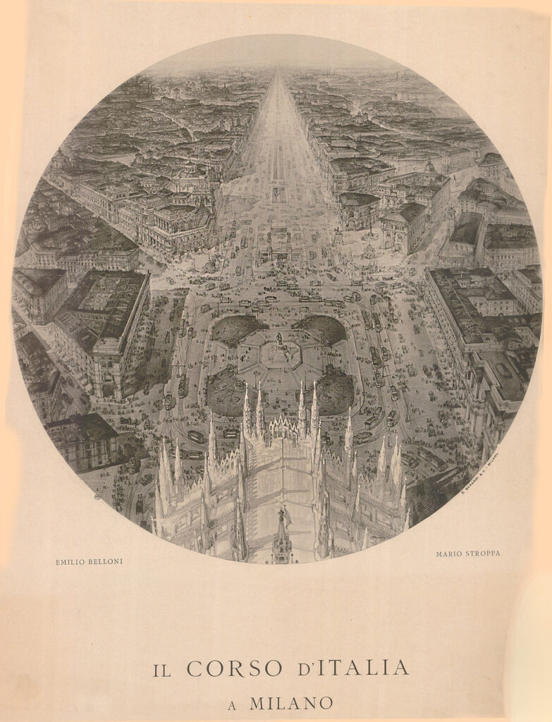 Il viale immaginato da Belloni non era un semplice ampliamento delle vie esistenti, ma un gesto urbanistico dirompente: un tracciato largo ottanta metri che avrebbe aperto una nuova prospettiva sulla piazza del Duomo, valorizzandone la monumentalità (punti di vista). Lontano dal timore di oscurare la cattedrale, il progetto intendeva esaltarla, offrendo a tutti una visione ampia e luminosa.