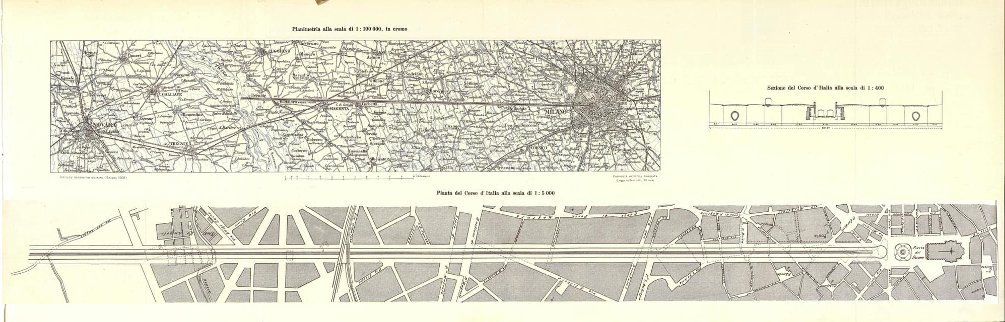 All’inizio del Novecento Belloni immaginò un’imponente arteria rettilinea, il Corso d’Italia, destinata a collegare il Duomo al fiume Ticino lungo una linea perfettamente diritta di 31 chilometri. L’asse, largo 80 metri, avrebbe ospitato tramvie elettriche — una locale e una veloce — piste ciclabili, corsie per automobili e camion, e persino tracciati separati per carrozze e carri. La sua realizzazione, però, avrebbe comportato la demolizione di centinaia di edifici, molti dei quali storici o di pregio: interi quartieri del centro, oltre a palazzi simbolici come Palazzo Carminati, la Loggia degli Osii, le Regie Poste, parte della Caserma Garibaldi e il recentissimo all’epoca, Pio Albergo Trivulzio. Perché il grande boulevard avrebbe attraversato l’antico borgo delle Cinque Vie, parte della zona di Porta Vercellina, passando per l’odierna piazza Sicilia sarebbe uscito dal comune di Milano all’altezza di Baggio.