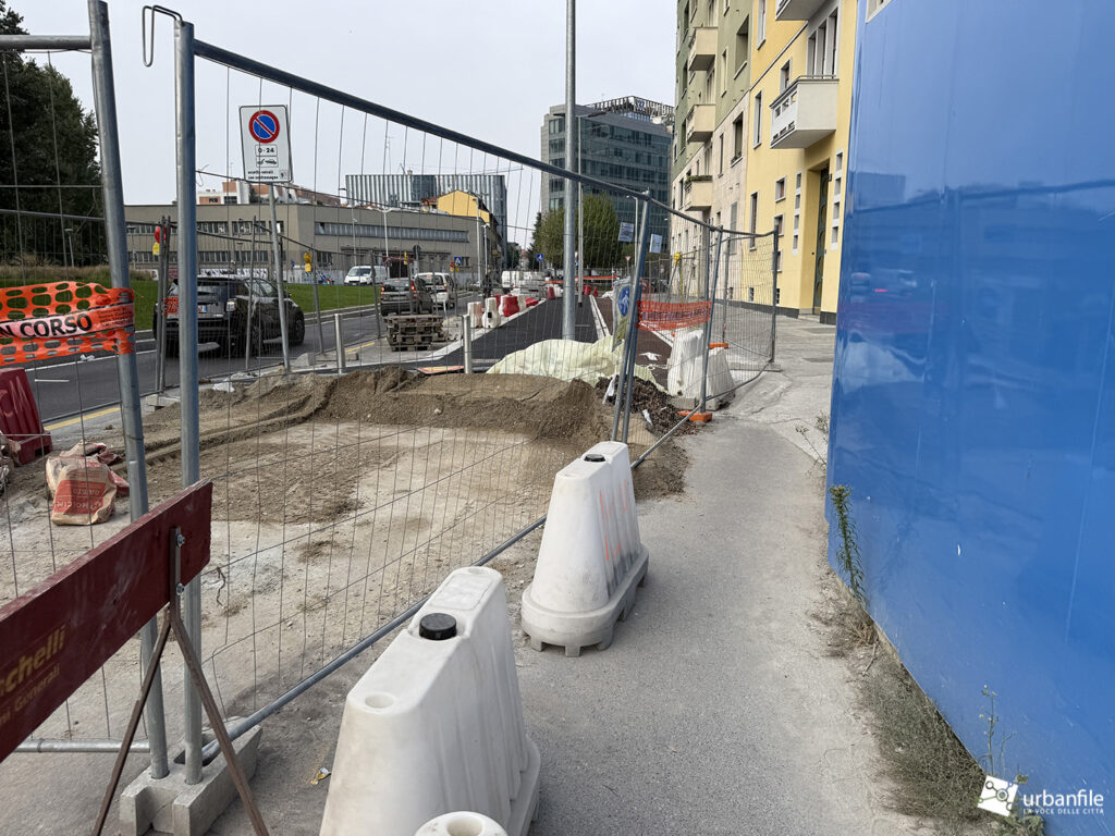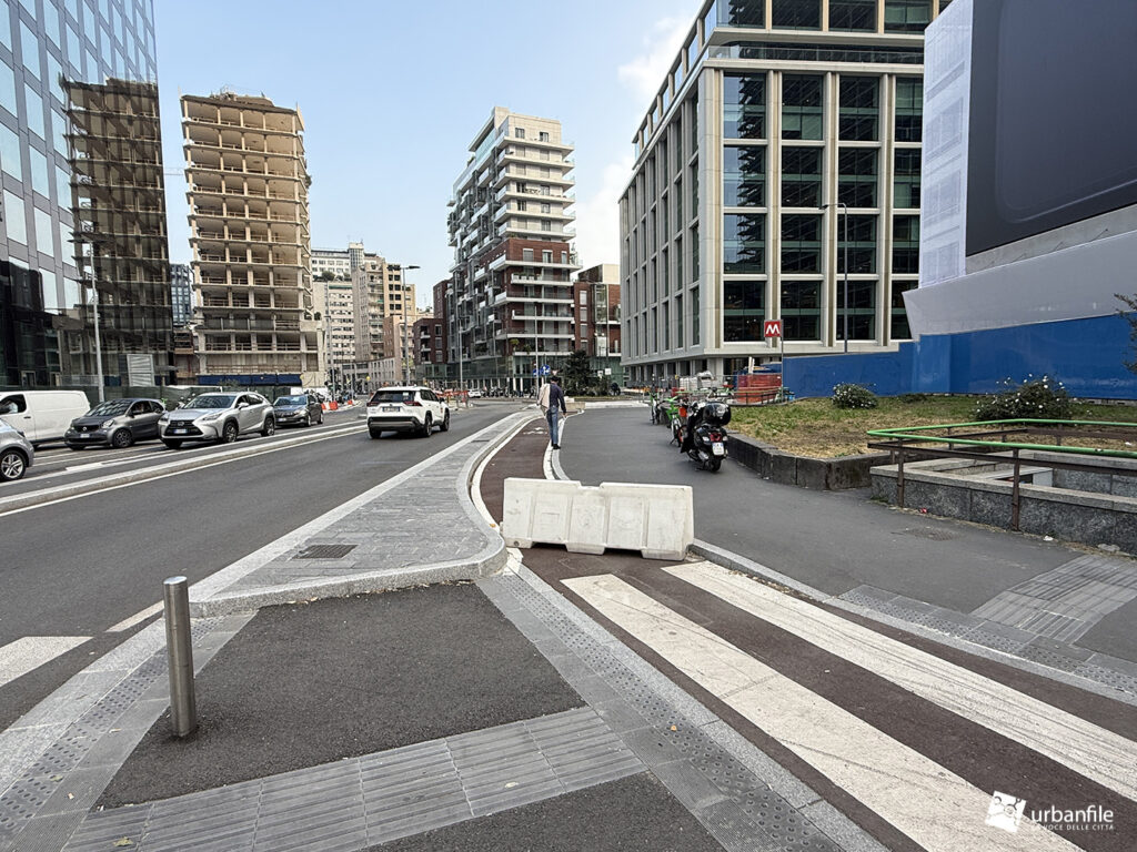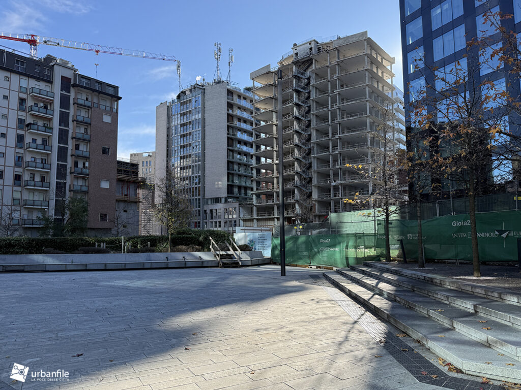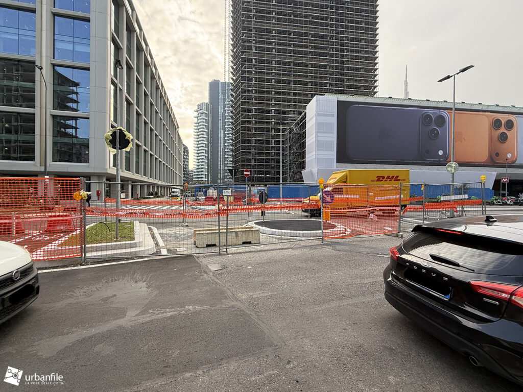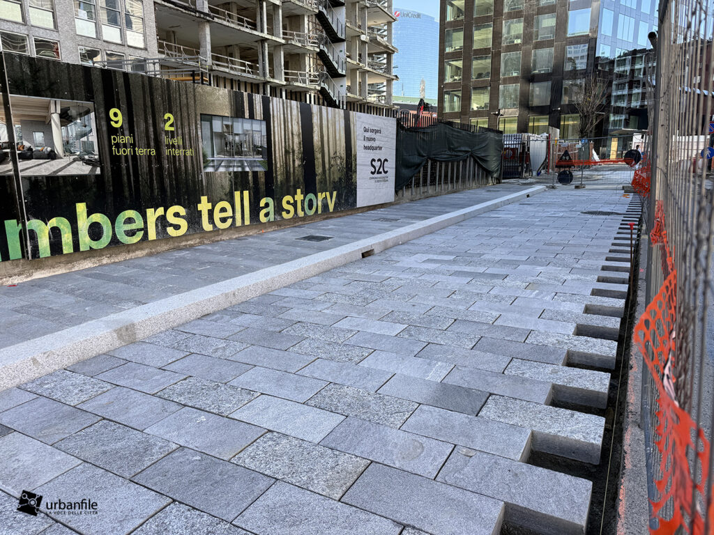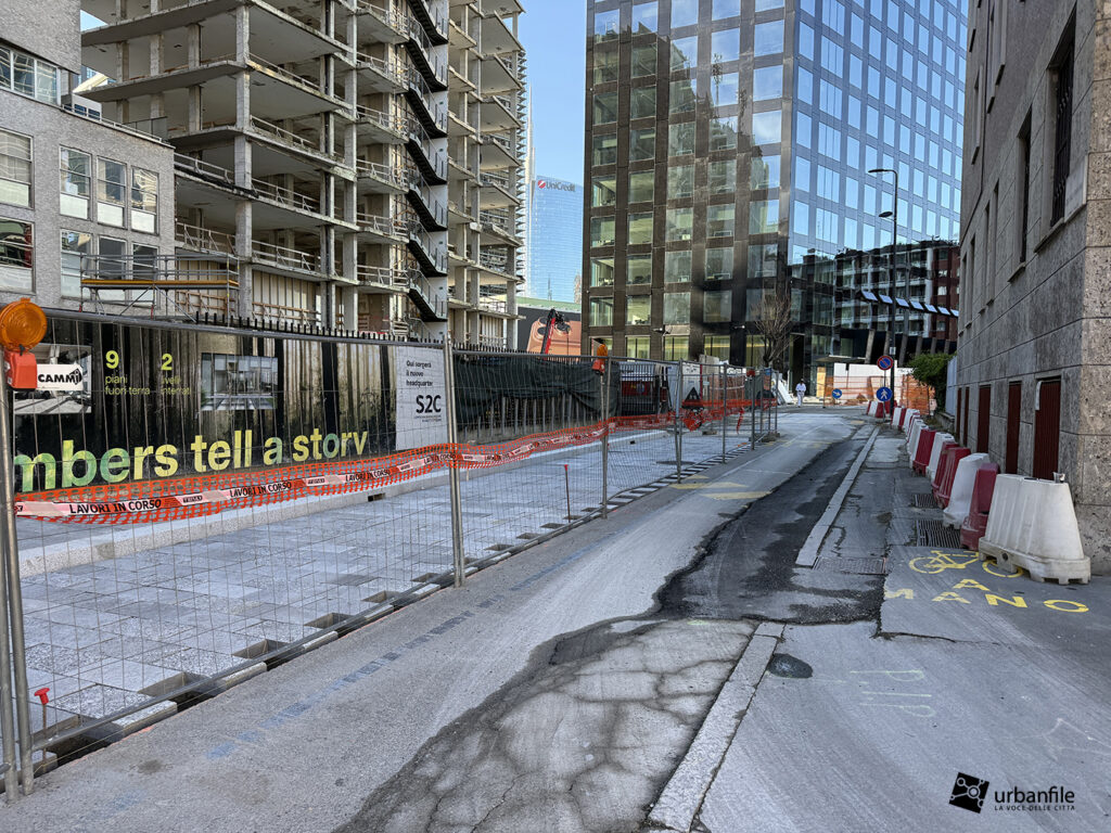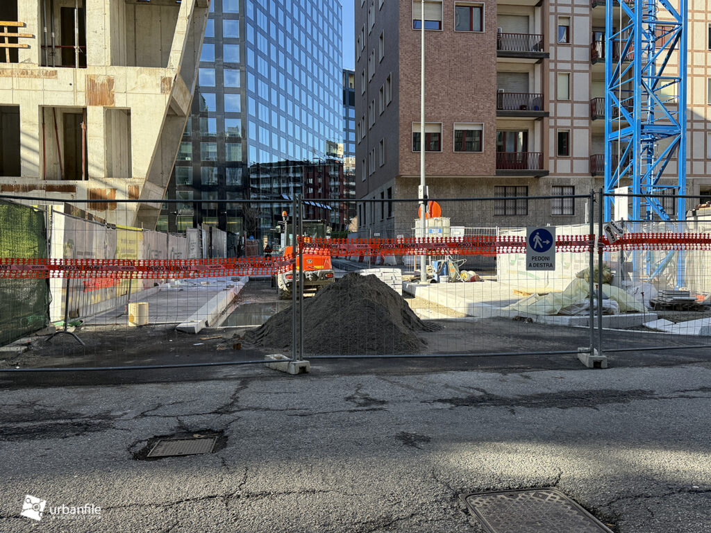 Novità la troviamo in via Clelia del Grillo Borromeo, la strada parallela a via Pirelli che costeggia le due torri di Pirelli 30 e 33 e porta alla “piazza” creata quando venne completato il palazzo di Gioia 22. A lavori completati il passaggio sarà aperto e connetterà via Cornalia con via Melchiorre Gioia attraverso questo passaggio, com’era in principio.