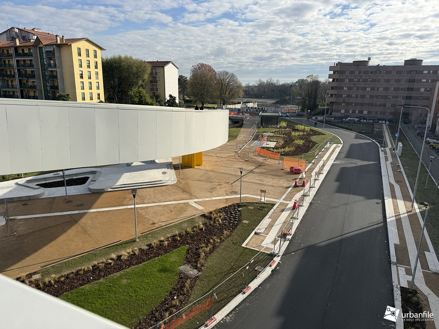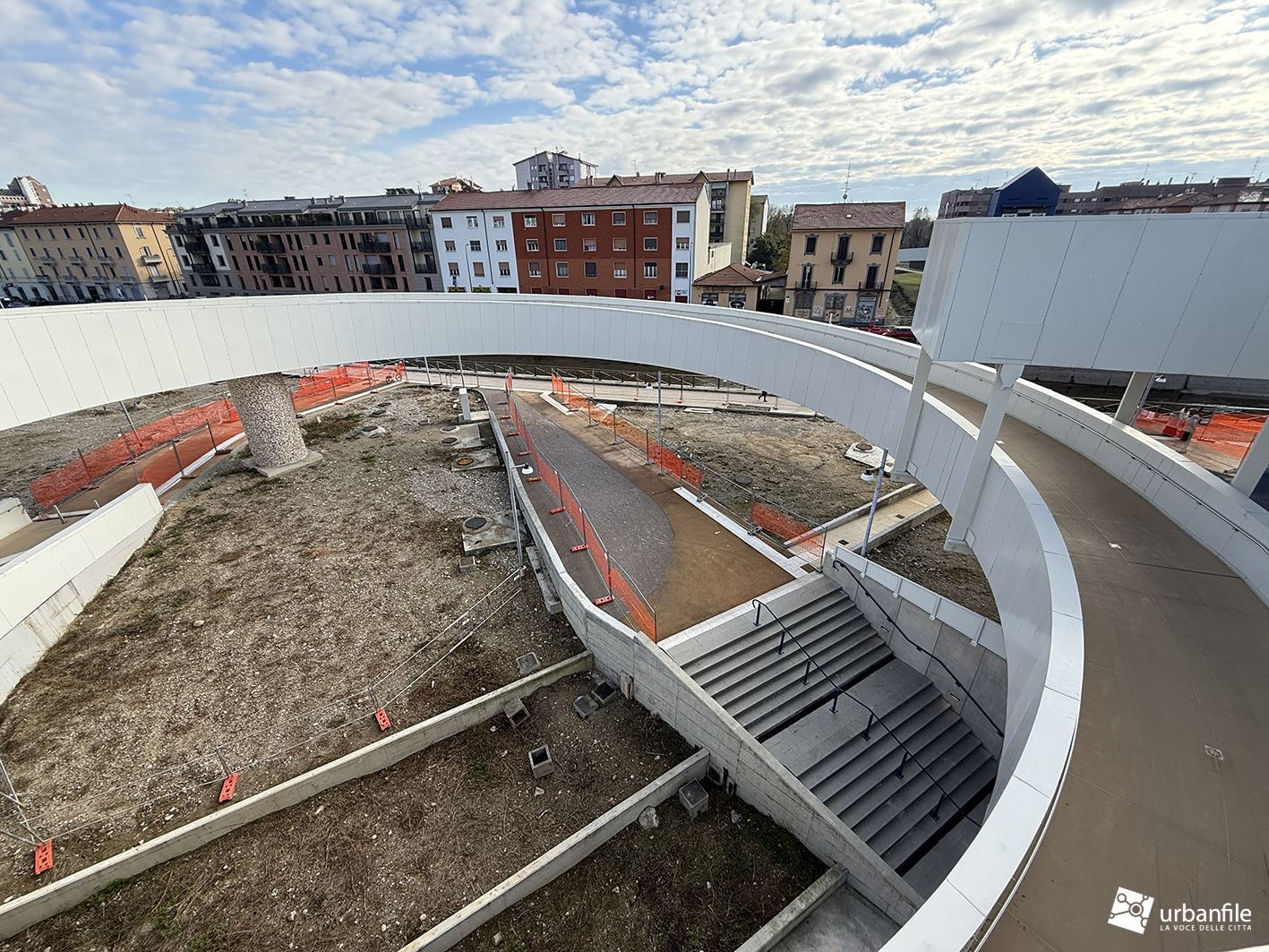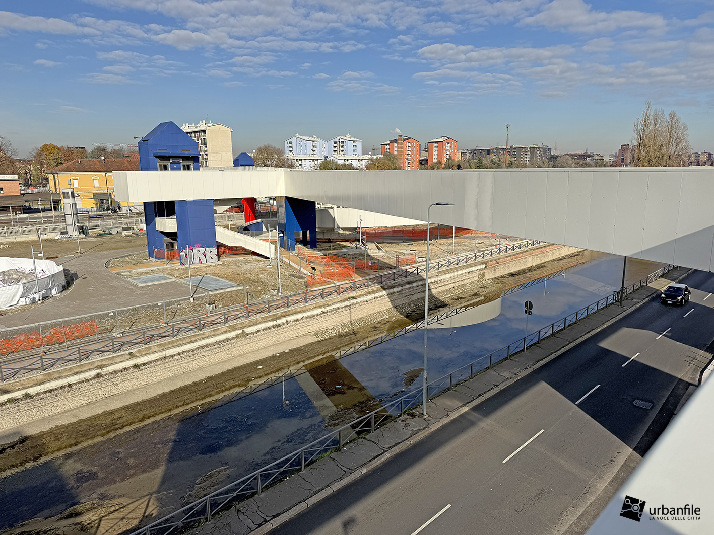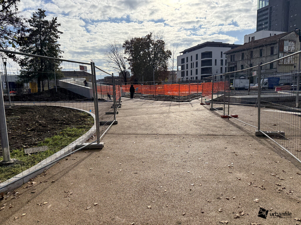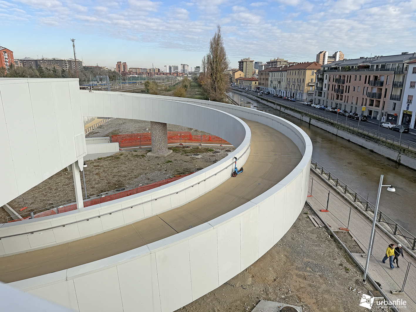 Di seguito la parte centrale col bivio per la rampa a chiocciola del percorso ciclo-pedoale che conduce all’alzaia Naviglio Grande e all’entrata della stazione M4 San Cristoforo.