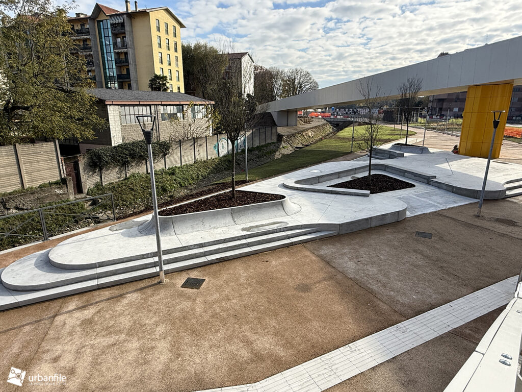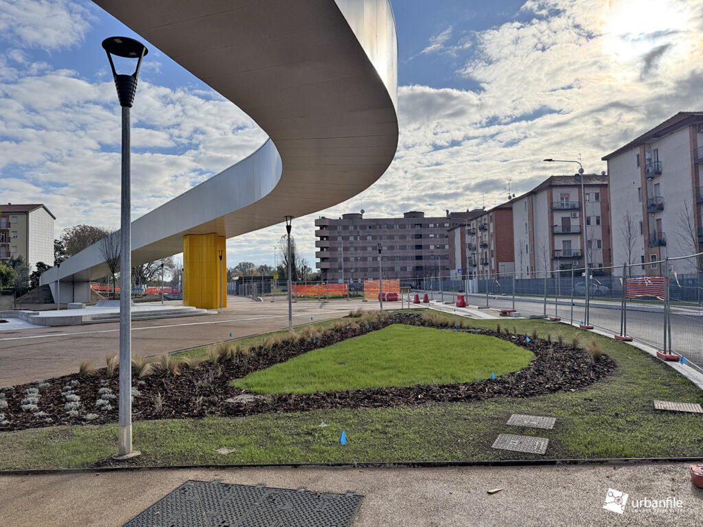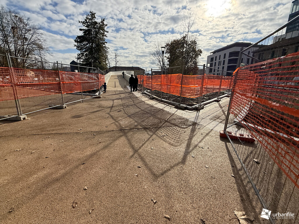 Inizia a essere meglio delineata la nuova disposizione della piazza coi nuovi percorsi pedonali che finalmente collegano i lati della grande piazza con giardino al centro all’imboccatura della passerella.