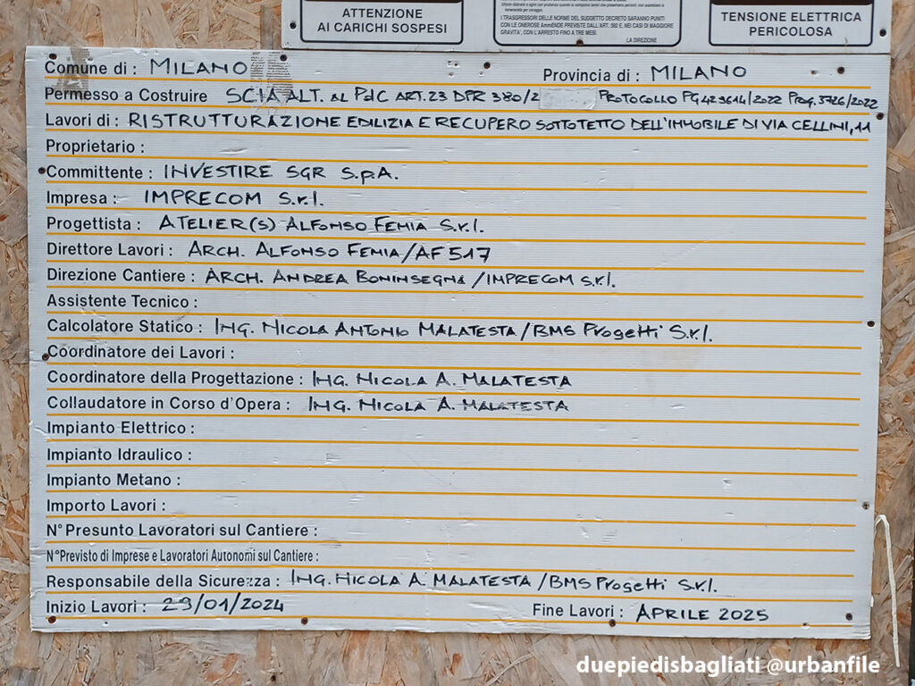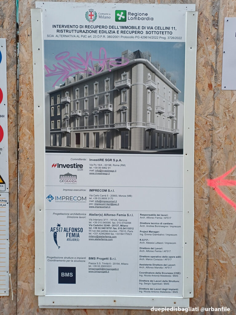 Novembre 2025. Una deliziosa palazzina a uso residenziale e commerciale di fine Ottocento/inizio Novecento, situata in Via Benvenuto Cellini 11 (angolo Via Marcona), è oggetto di una completa riqualificazione con recupero del sottotetto, secondo un progetto dello studio AF517* – Atelier(s) Alfonso Femia, che lascia il suo particolare “marchio” negli abbaini del nuovo piano sottotetto.