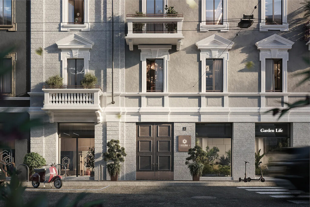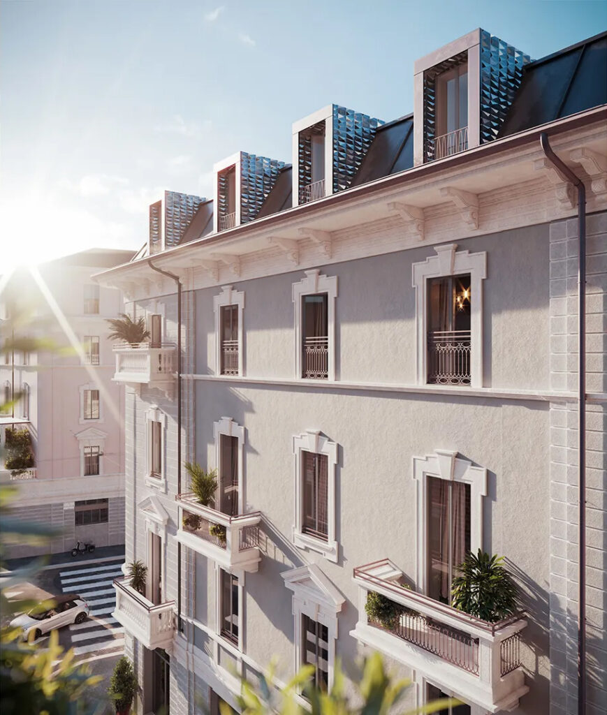 Un’altra novità è rappresentata dall’intervento sull’ala dell’edificio affacciata su Via Cellini: l’ampio spazio vuoto tra il palazzo e il confinante civico 7, attualmente occupato da un piccolo edificio di un solo piano, sarà completato con una nuova struttura di tre piani più un terrazzo a servizio dell’ultimo livello mansardato. Un intervento di notevole qualità.