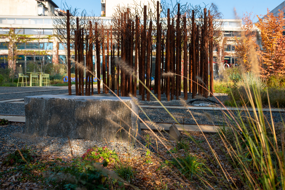 Elemento centrale dell’intervento è la scelta di recuperare e reimpiegare i materiali originari del sito come cubetti di porfido e autobloccanti recuperati dal lotto adiacente, traversine ferroviarie rigenerate usate come cordoli e percorsi, superfici in ghiaia e acciaio che richiamano la storia produttiva dell’area.