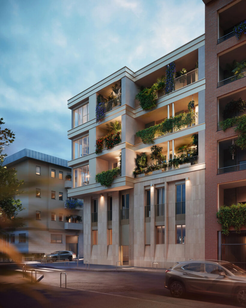Il progetto firmato dallo studio AA Architetti Associati, denominato Corner 43, valorizza proprio questa caratteristica distintiva: pur trasformando e aggiornando l’edificio, ne mantiene l’essenza originaria. La nuova struttura conserva infatti l’effetto aggettante del volume d’angolo, ora reinterpretato attraverso ampie vetrate e generose logge. È previsto anche l’inserimento di un piano aggiuntivo, che porterà l’edificio a un totale di quattro livelli.