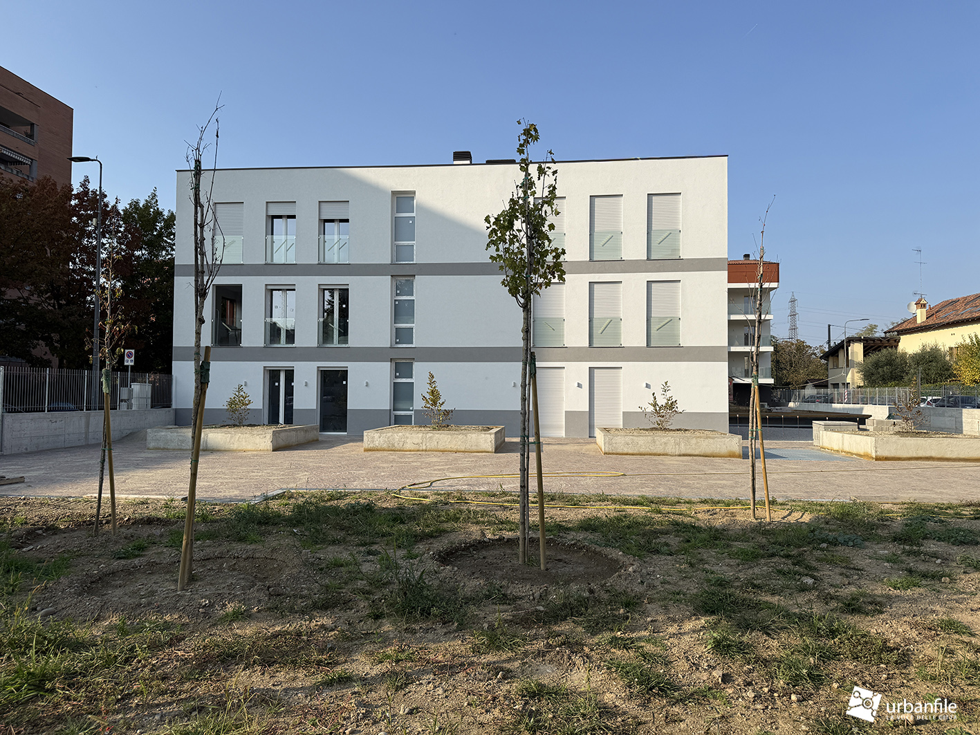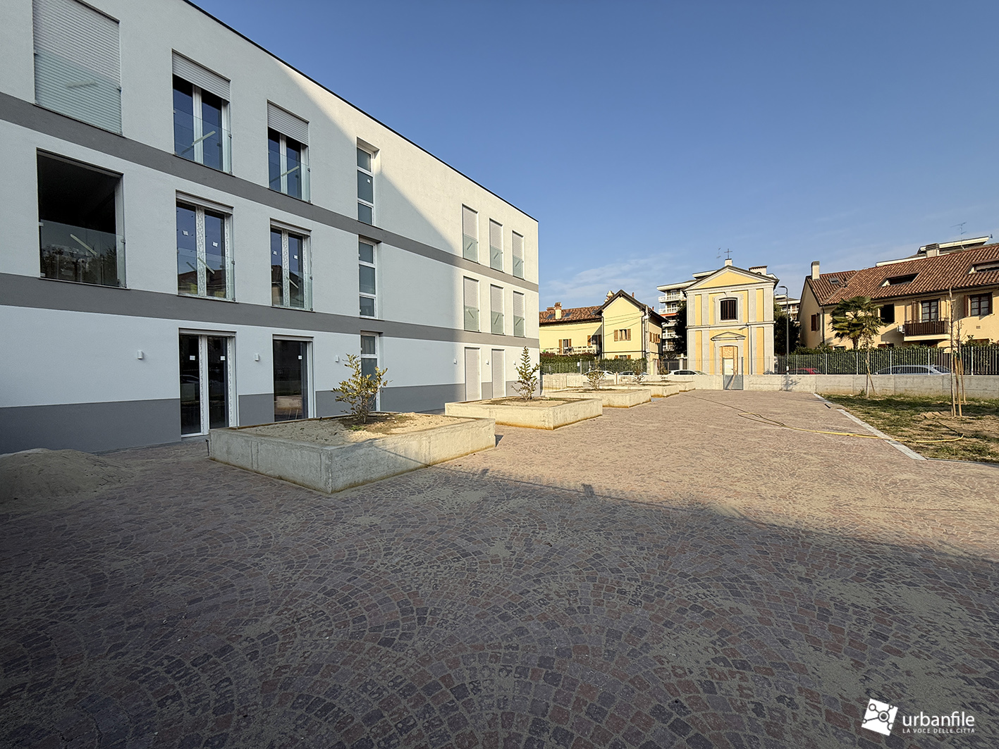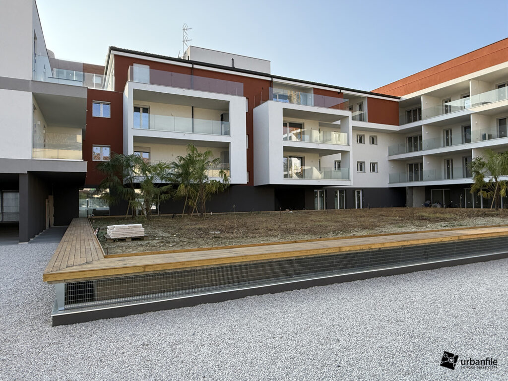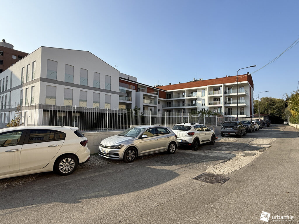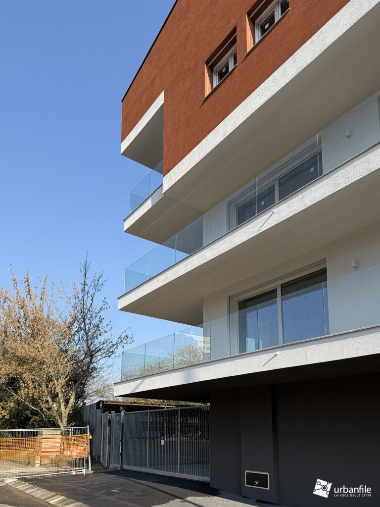 Siamo in via San Mamete 69, 71, 73 e 75, proprio di fronte al seicentesco oratorio, dove — dopo un lungo abbandono — i ruderi dei vecchi edifici hanno lasciato (purtroppo) il posto al nuovo palazzo. Si tratta di un edificio su tre livelli disposto a U attorno a una piazza privata e a un’area pedonale che si apre davanti alla vecchia chiesetta di San Mamete. Il giardino deve ancora prendere forma e appare un po’ spoglio, soprattutto sul fronte in cui la via compie una curva.