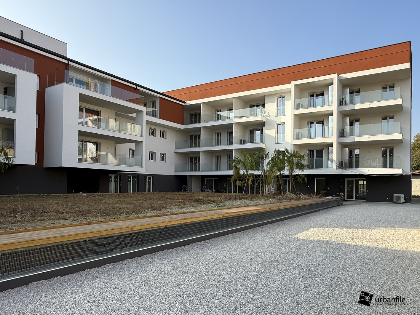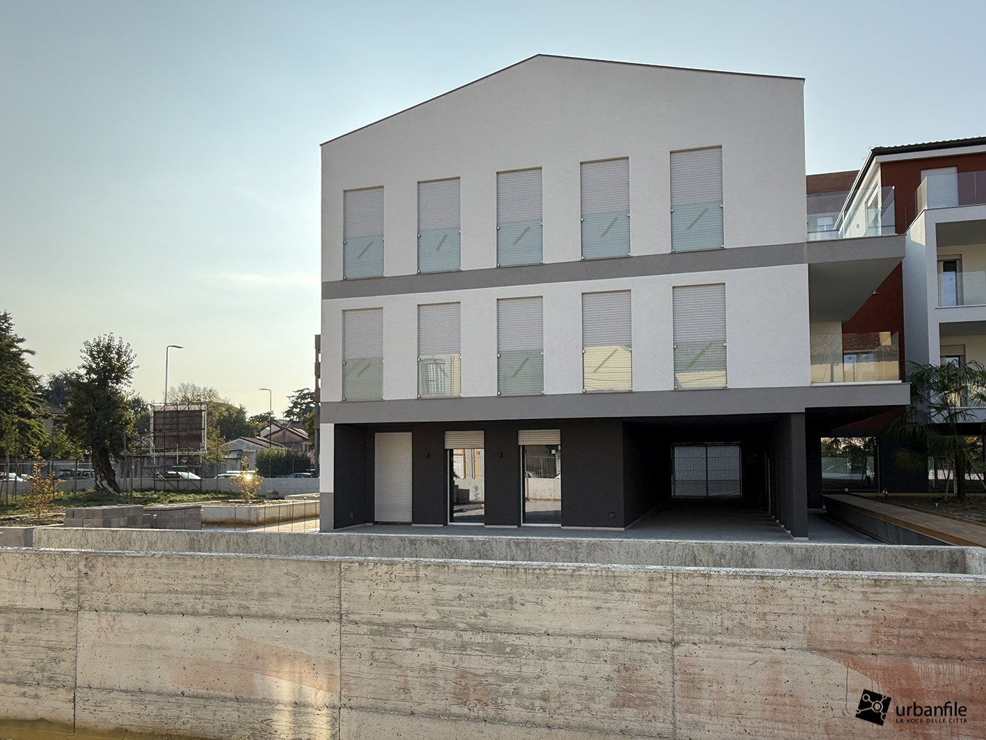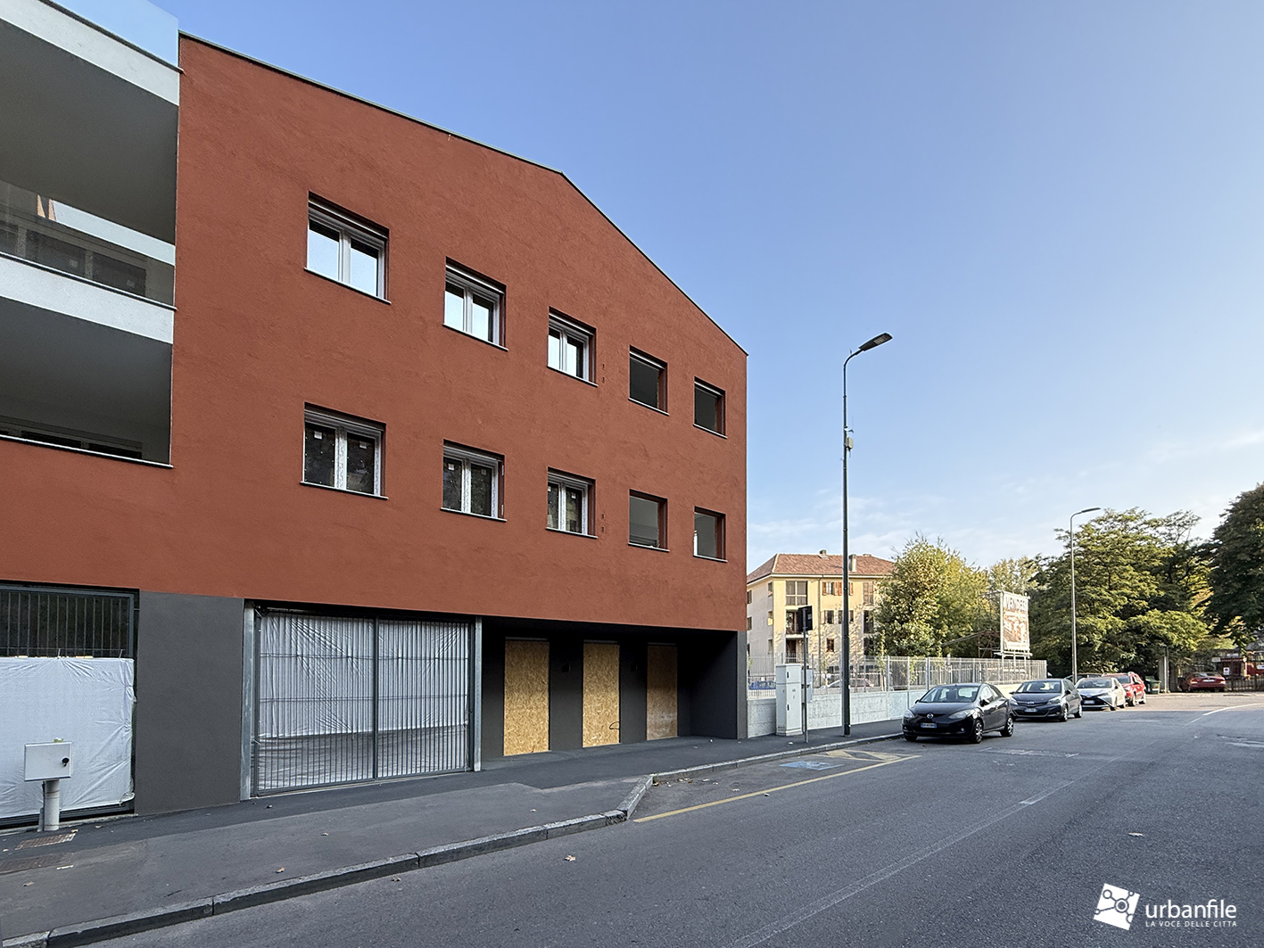 Siamo in via San Mamete 69, 71, 73 e 75, proprio di fronte al seicentesco oratorio, dove — dopo un lungo abbandono — i ruderi dei vecchi edifici hanno lasciato (purtroppo) il posto al nuovo palazzo. Si tratta di un edificio su tre livelli disposto a U attorno a una piazza privata e a un’area pedonale che si apre davanti alla vecchia chiesetta di San Mamete. Il giardino deve ancora prendere forma e appare un po’ spoglio, soprattutto sul fronte in cui la via compie una curva.