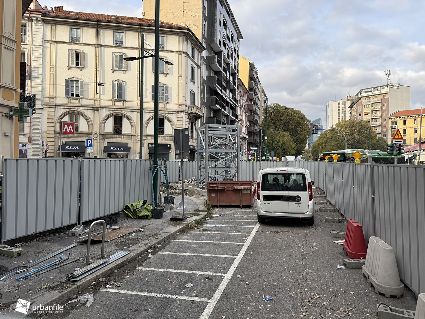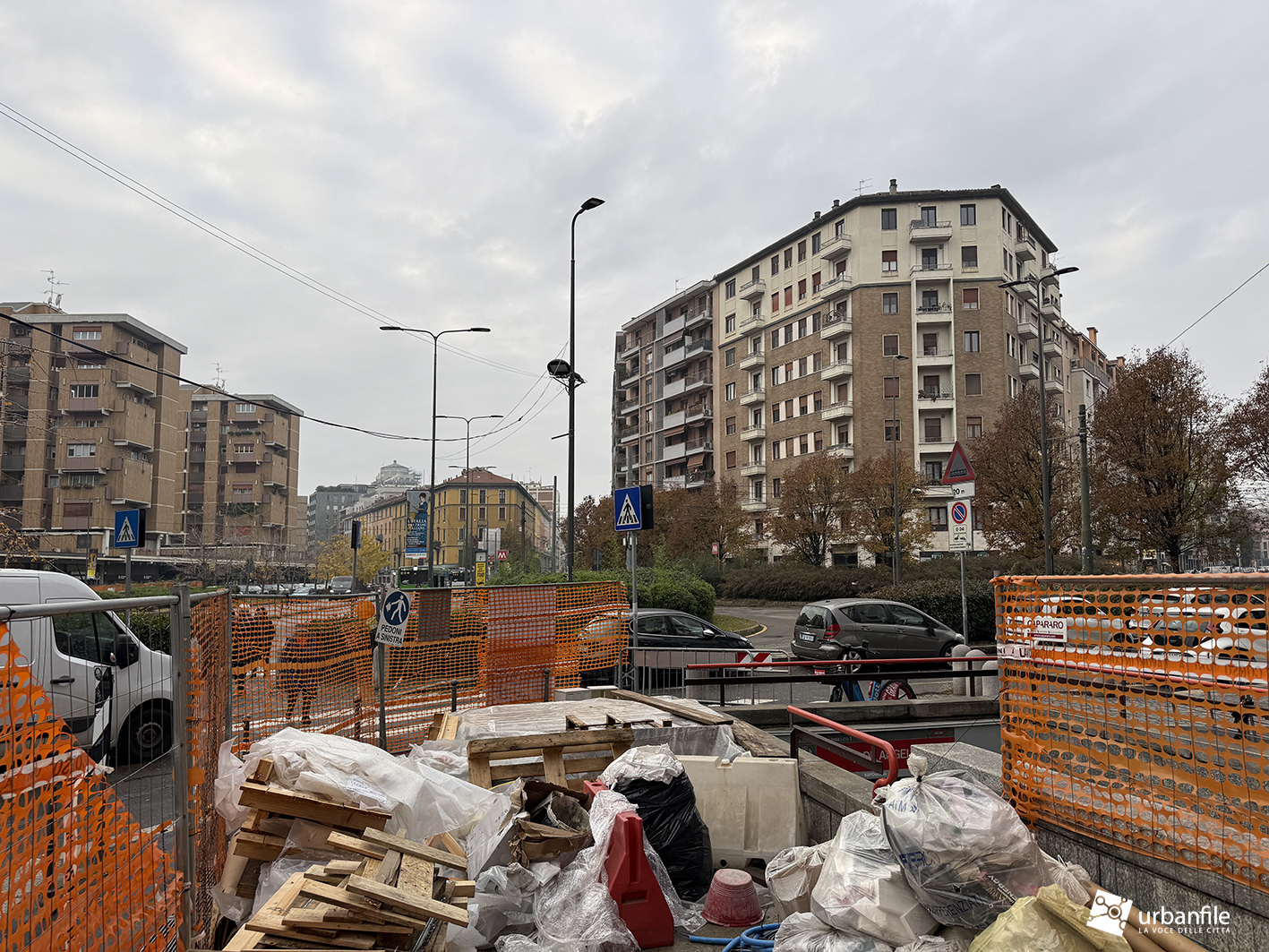Aggiungiamo anche qualche foto dal vicino cantiere della stazione M1 De Angeli. Mentre a Wagner la torretta ascensore è ben visibile in superficie, alla stazione di De Angeli il cantiere pare un po’ in ritardo.