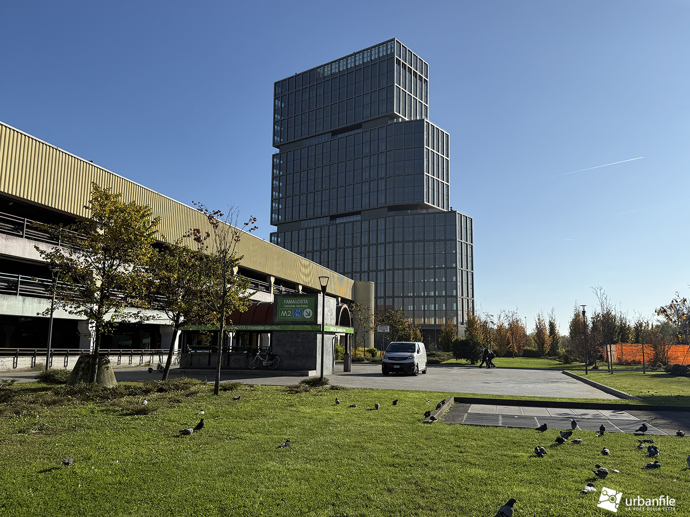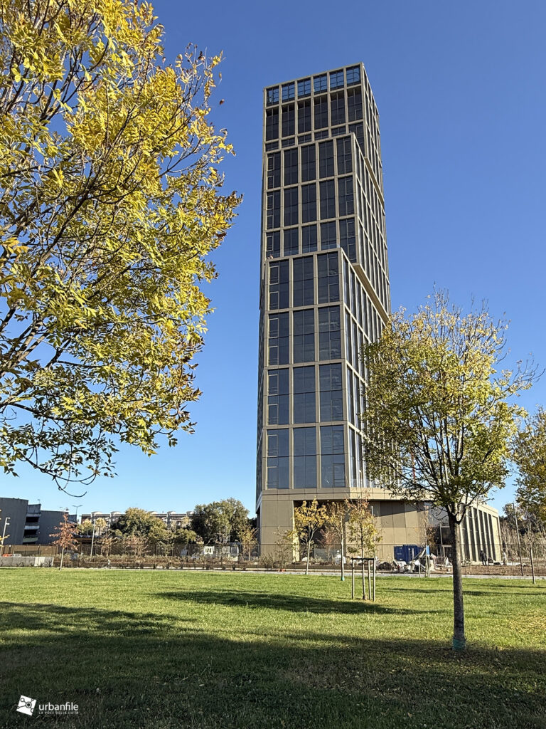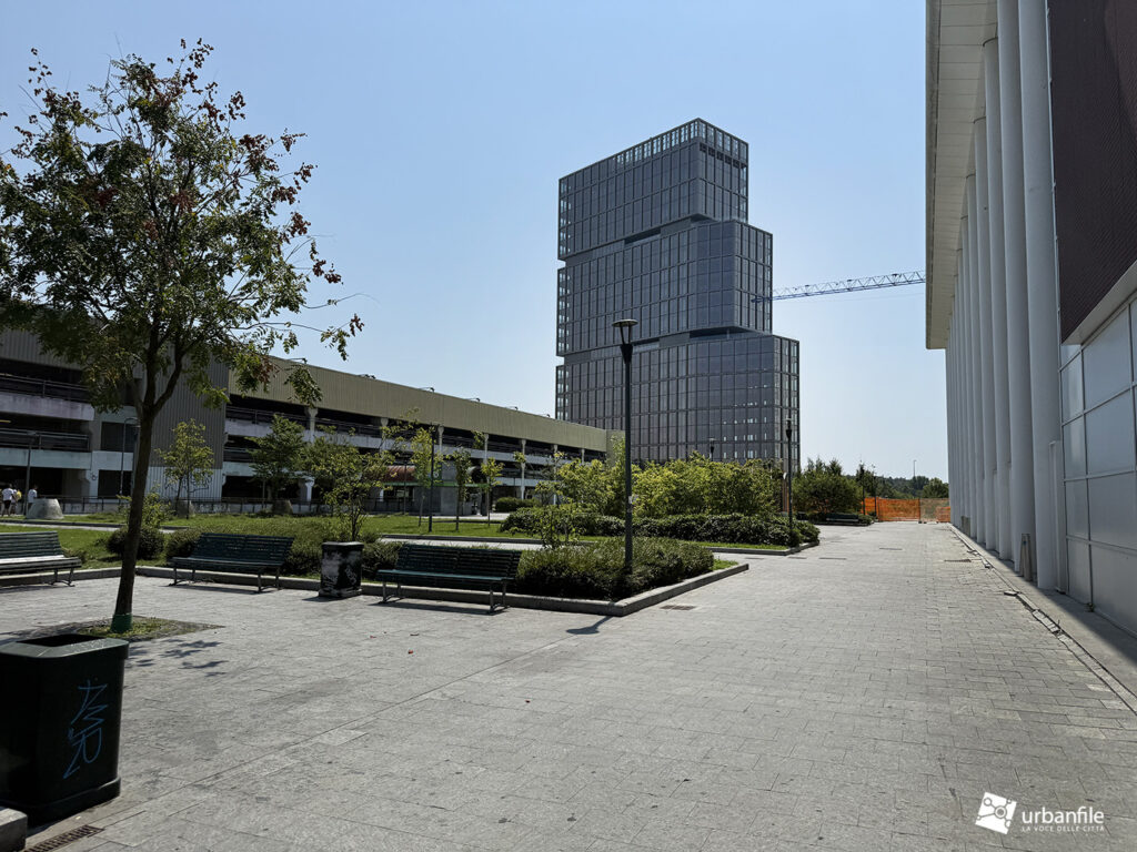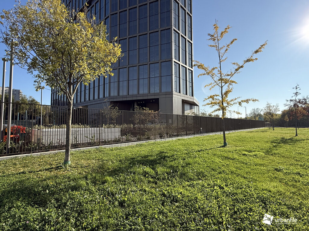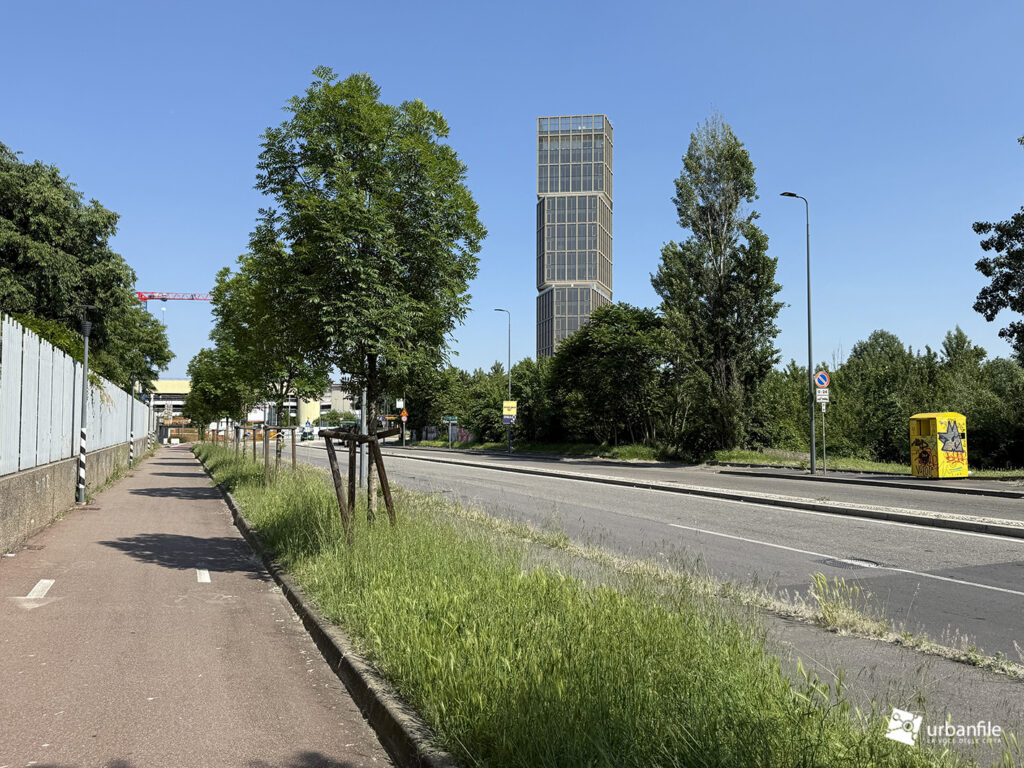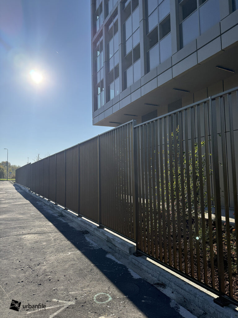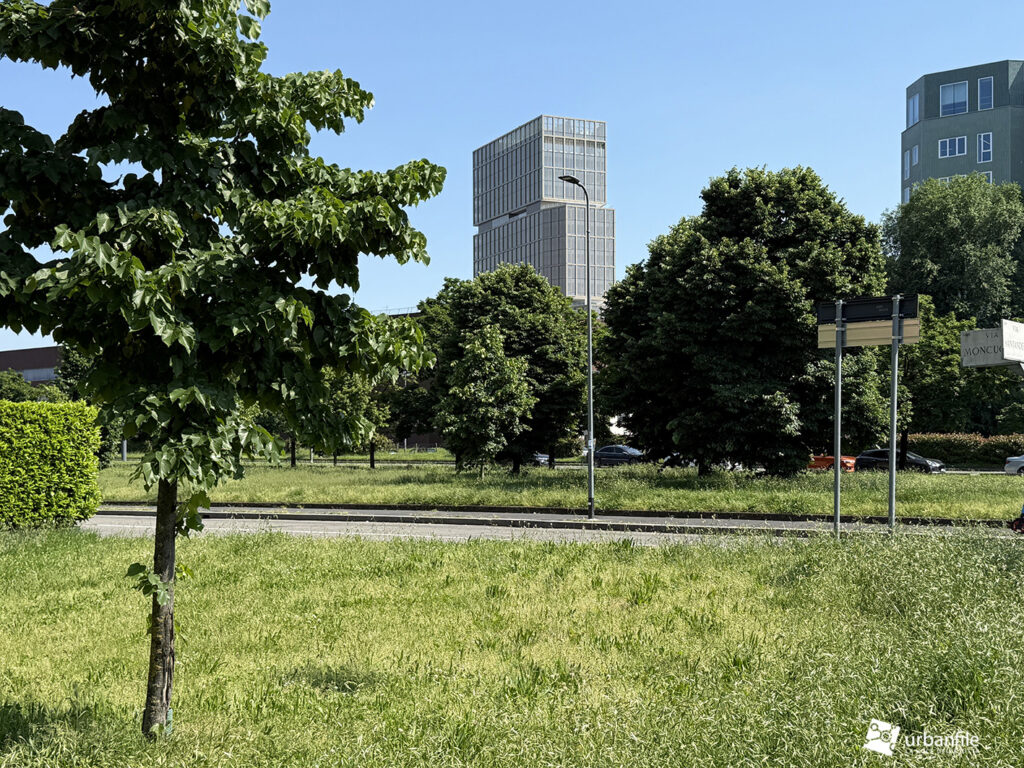 Dicembre 2025. Ormai da qualche settimana sono stati completati gli ultimi interventi al giardino e alle aree circostanti del nuovo edificio che accoglie chi arriva a Milano dall’autostrada dei Giovi, in zona M2 Famagosta, alla Barona.