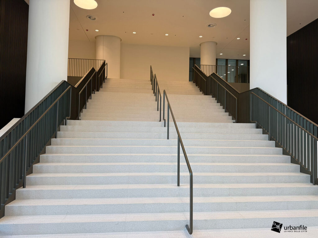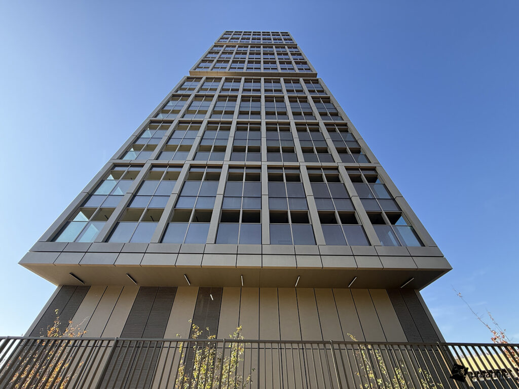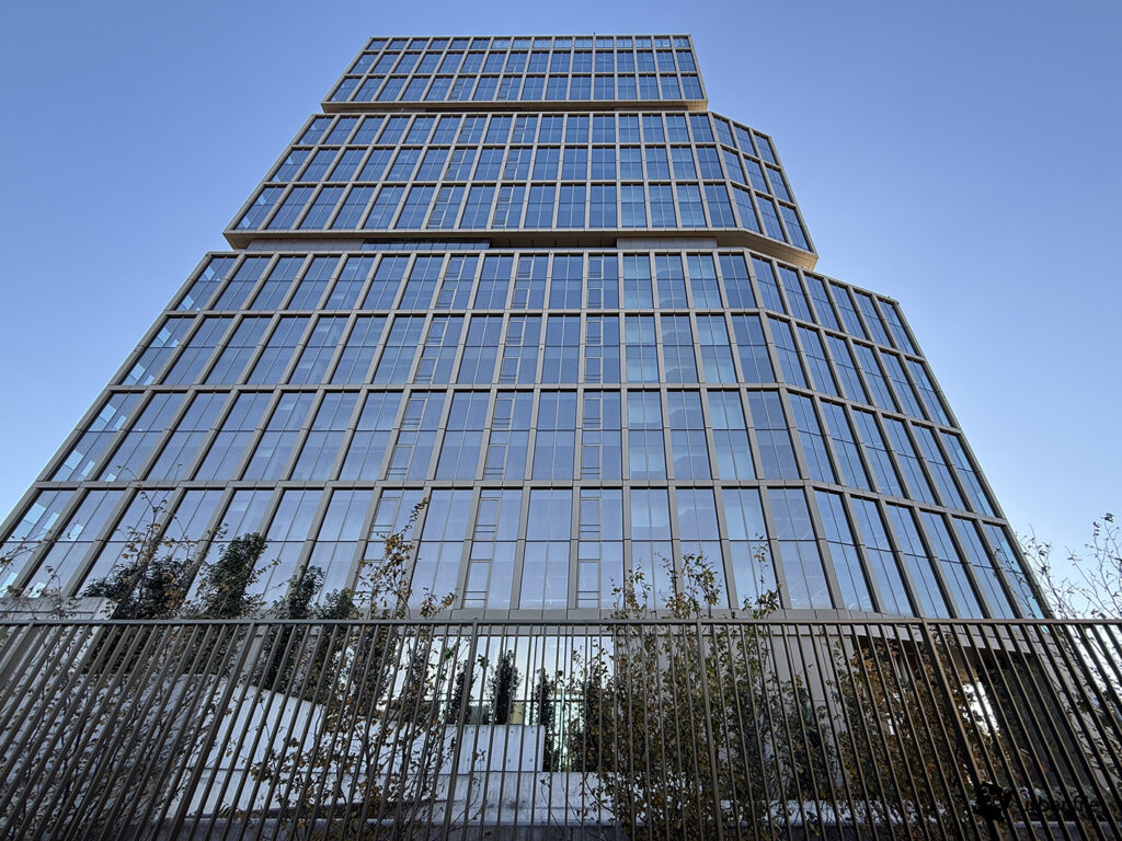 Ai piedi della torre è stato realizzato un giardino privato di circa 9.000 m², concepito come parte integrante della vita quotidiana: un’estensione naturale degli spazi di lavoro.
