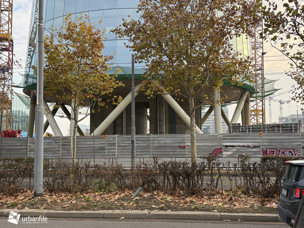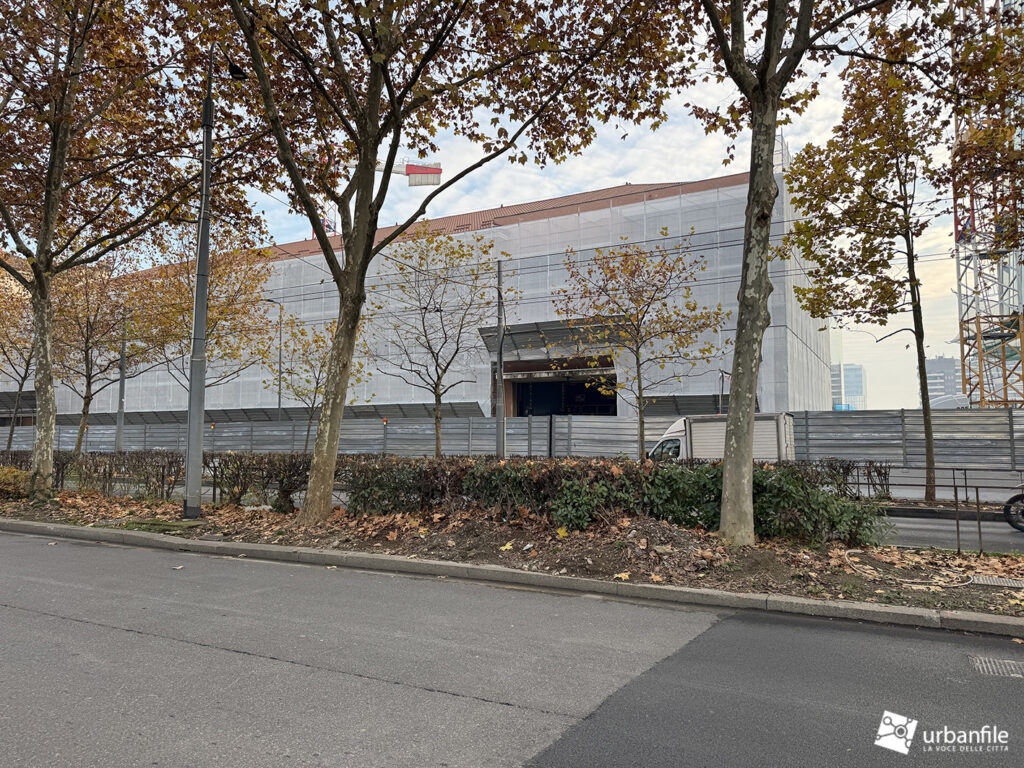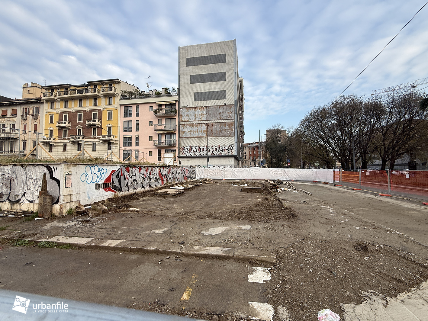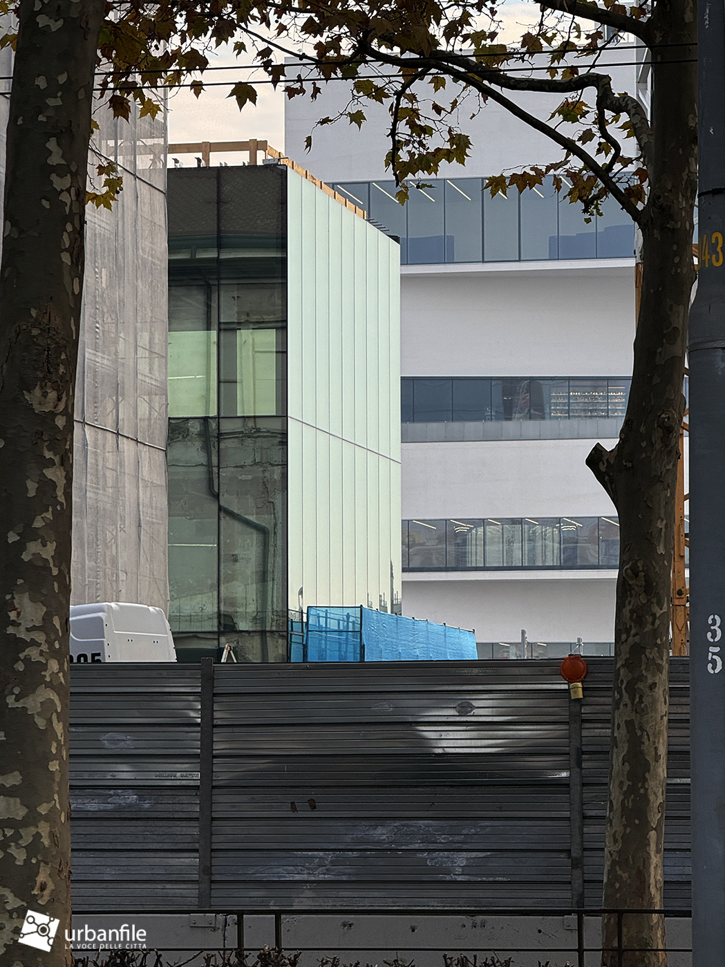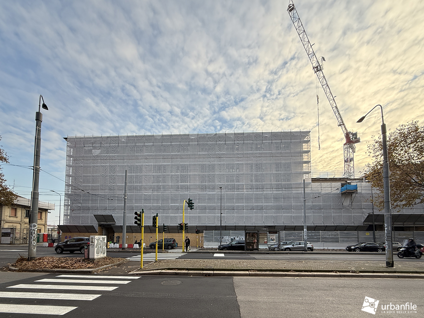Questa è la situazione nei primi giorni di dicembre. Da qualche giorno le vecchie palazzine industriali che saranno integrate e recuperate nel progetto, sono state impacchettate dalle impalcature.