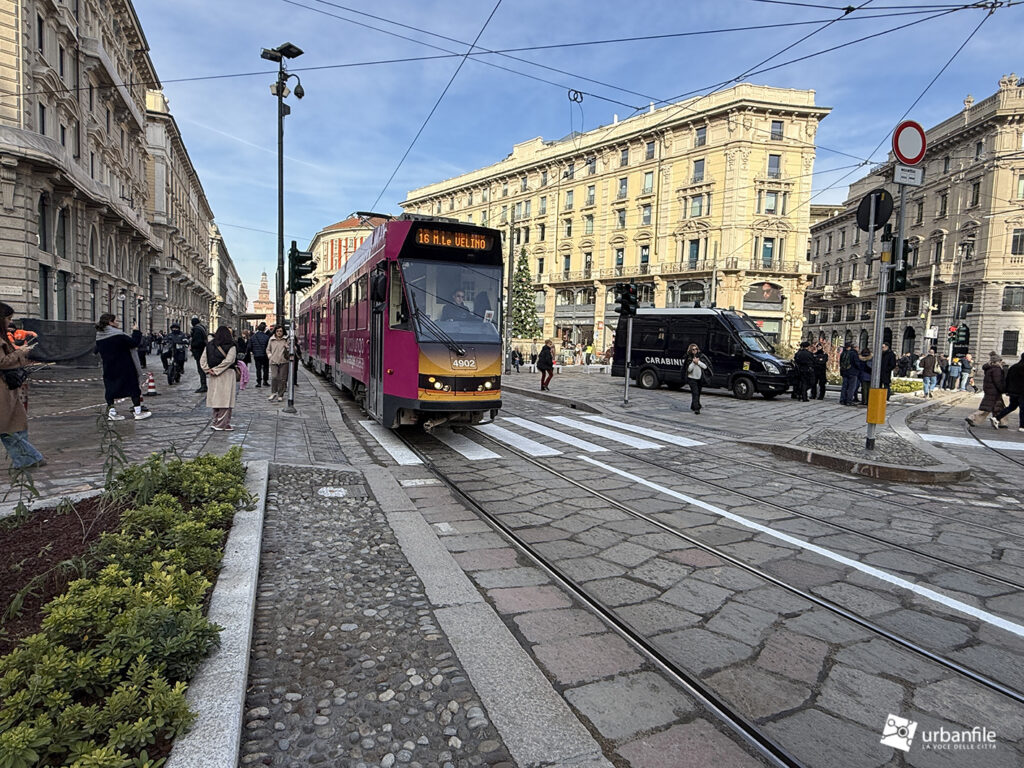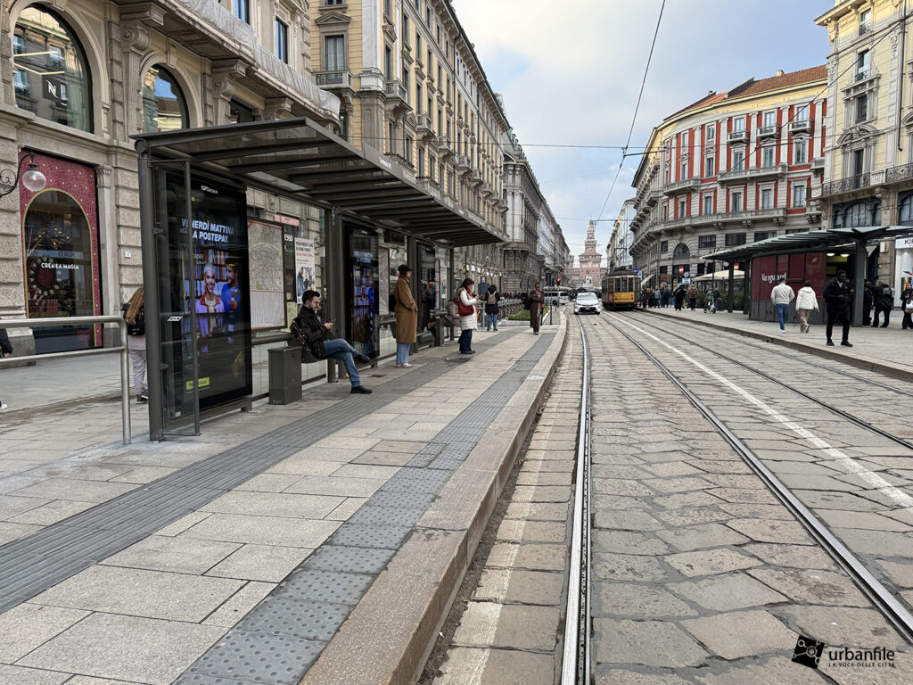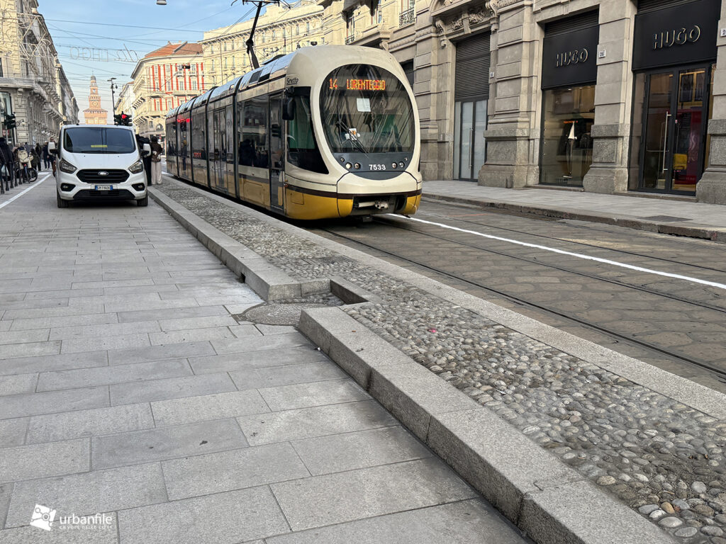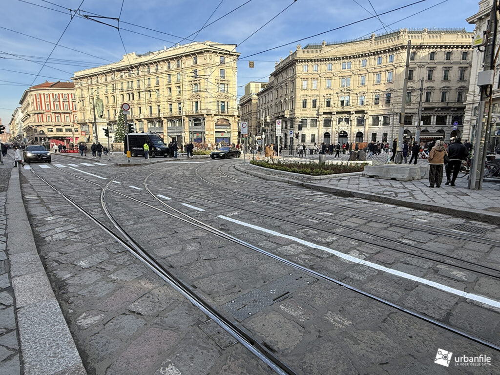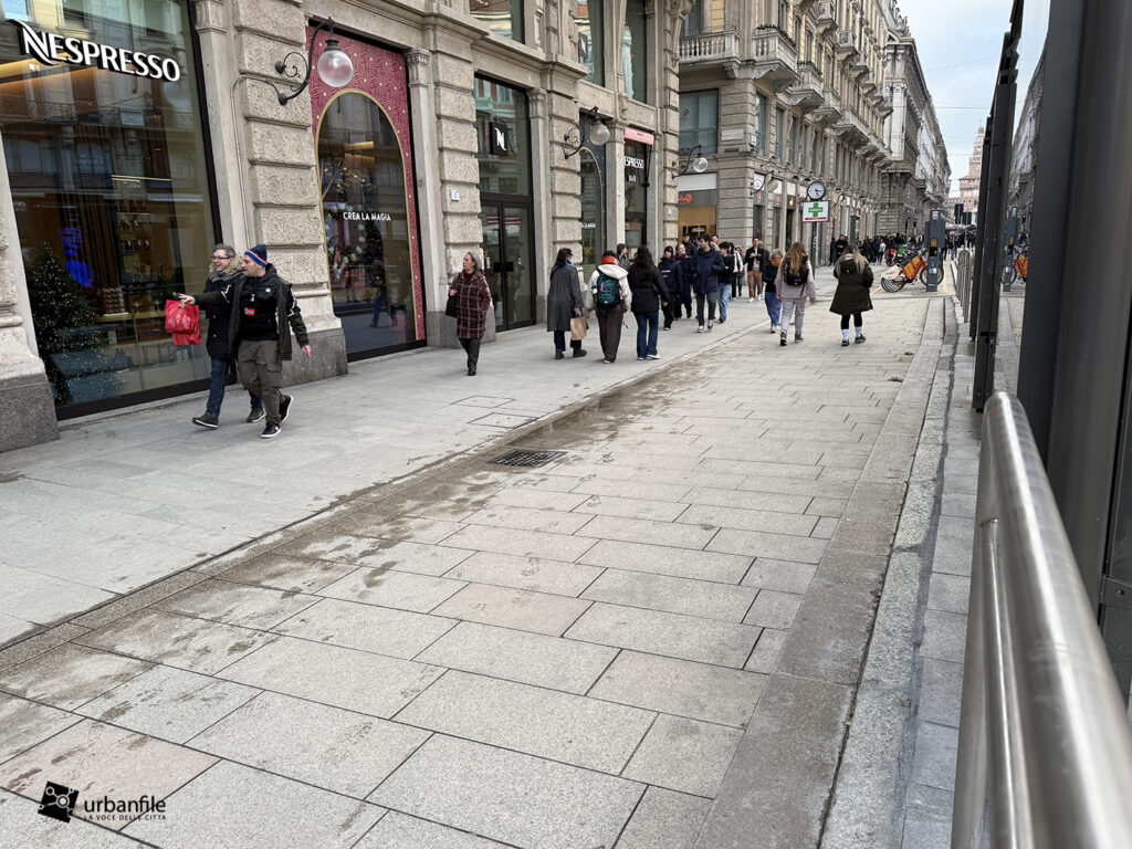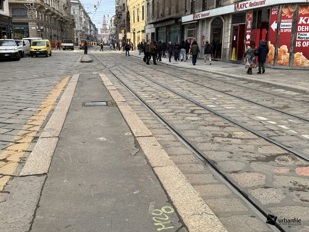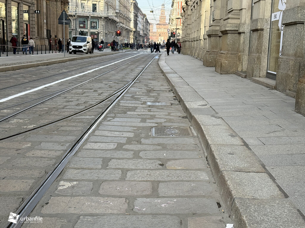 Partiamo proprio da via Orefici, che forse meritava qualcosa in più. Quantomeno una completa piastrellatura e una sistemazione definitiva dei marciapiedi. Il cantiere del lato dispari, infatti, è stato rinviato a dopo le Olimpiadi: oggi la pavimentazione in pietra interessa tutto il lato pari e solo parzialmente quello dispari, da piazza Cordusio a via Cesare Cantù. Peccato non siano stati spostati i binari secondo il progetto iniziale: ciò avrebbe consentito di allargare entrambi i marciapiedi, rendendo la via più ordinata e sicura. Le rotaie, invece, restano addossate al lato pari, dove il marciapiede, nel punto più stretto, misura circa un metro.