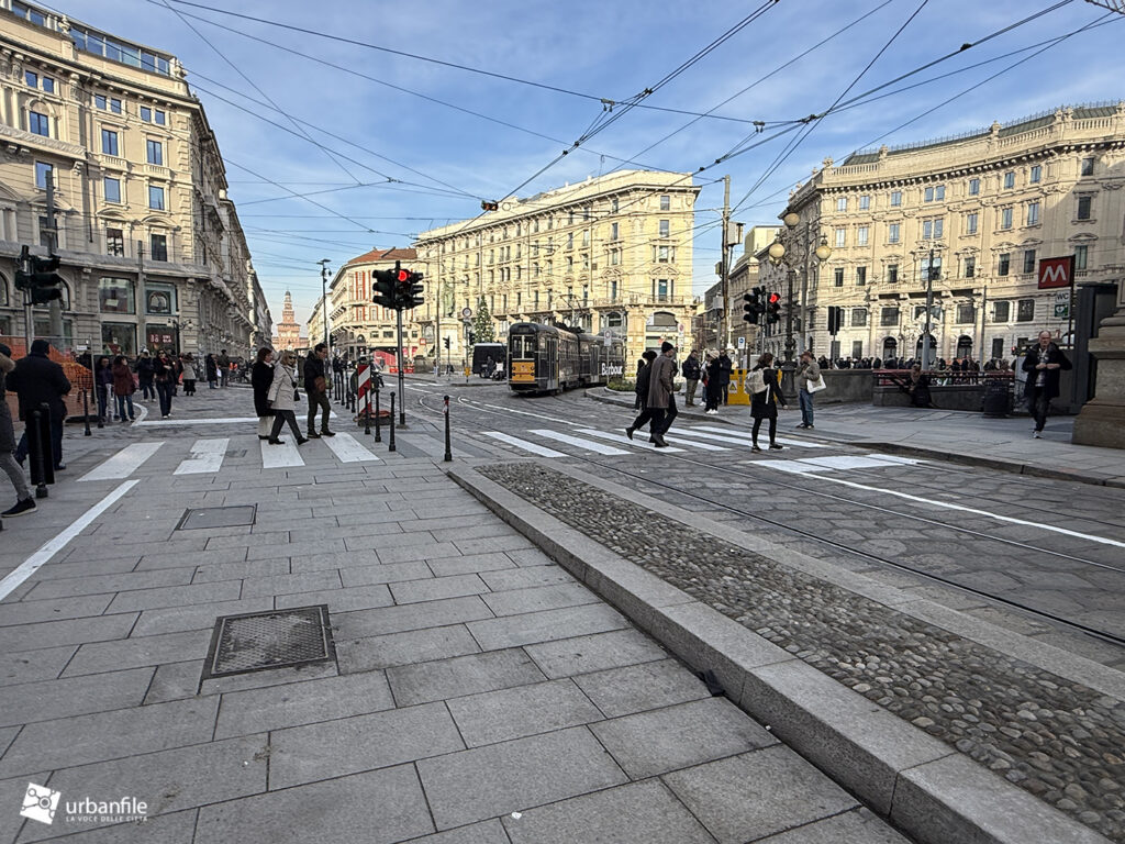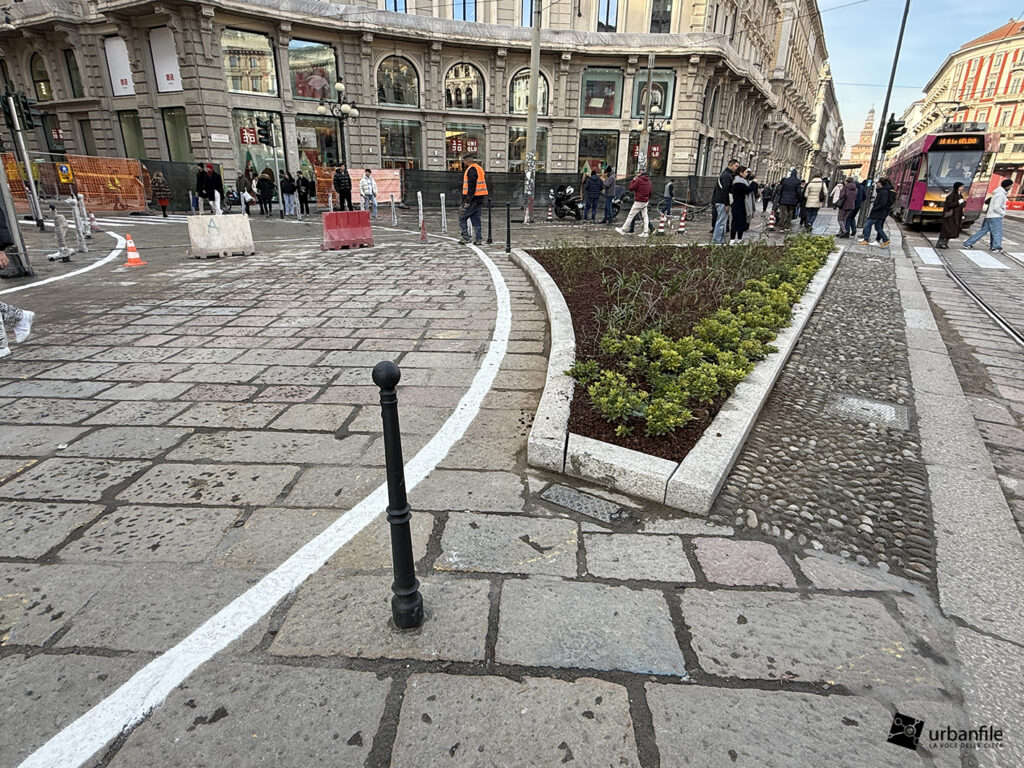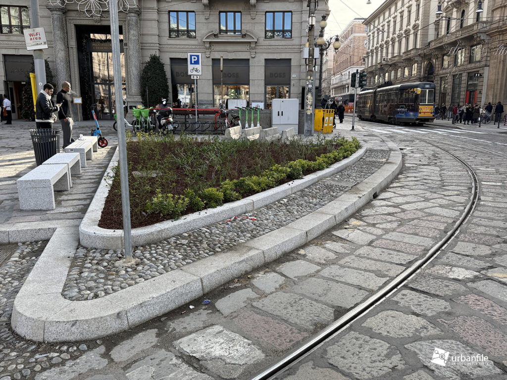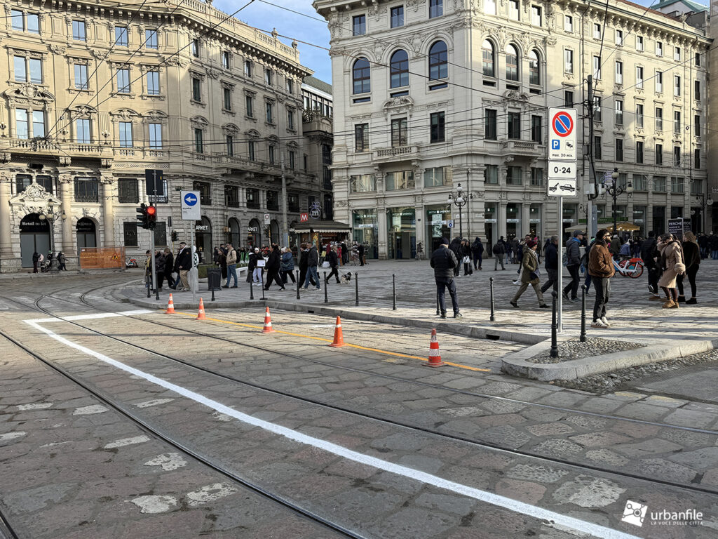 Sul lato verso la breve via Cordusio è stato mantenuto un passaggio carrabile all’interno della nuova area pedonale meridionale, creando una situazione un po’ “promiscua”. Un dislivello, come quello presente nell’area riservata a tram e taxi, avrebbe reso più percepibile il rischio. In alternativa, si è optato per una fitta presenza di paletti (“parigine”) in metallo, che speriamo resistano nel tempo. In precedenza, qui, un semaforo regolava l’alternanza tra pedoni e veicoli.