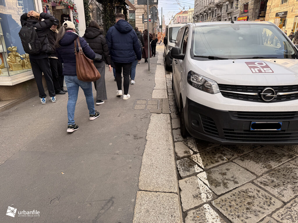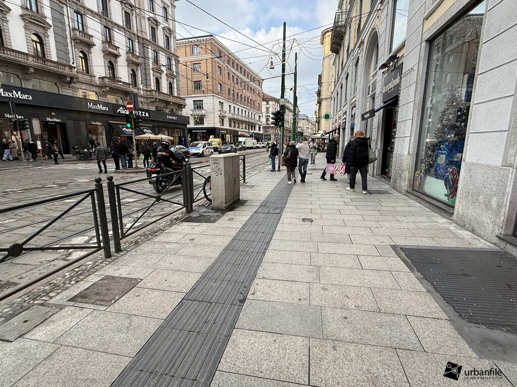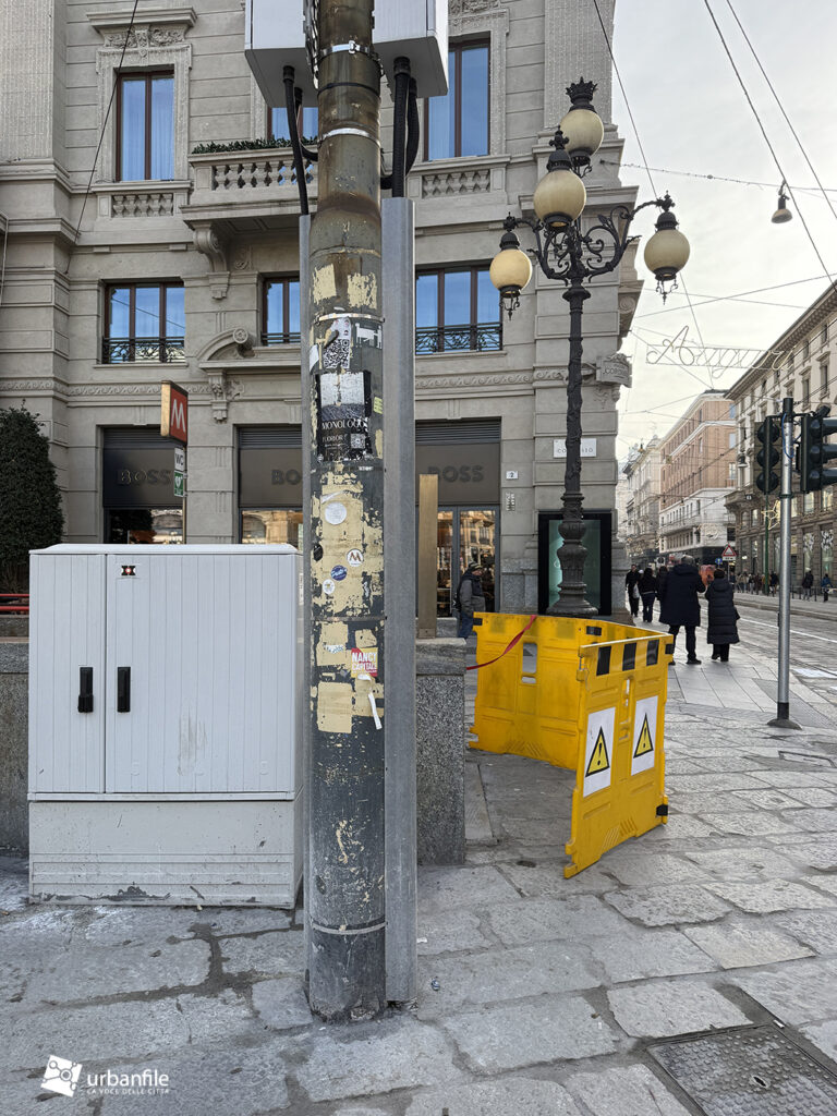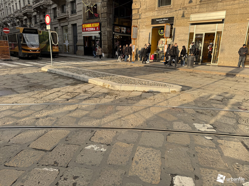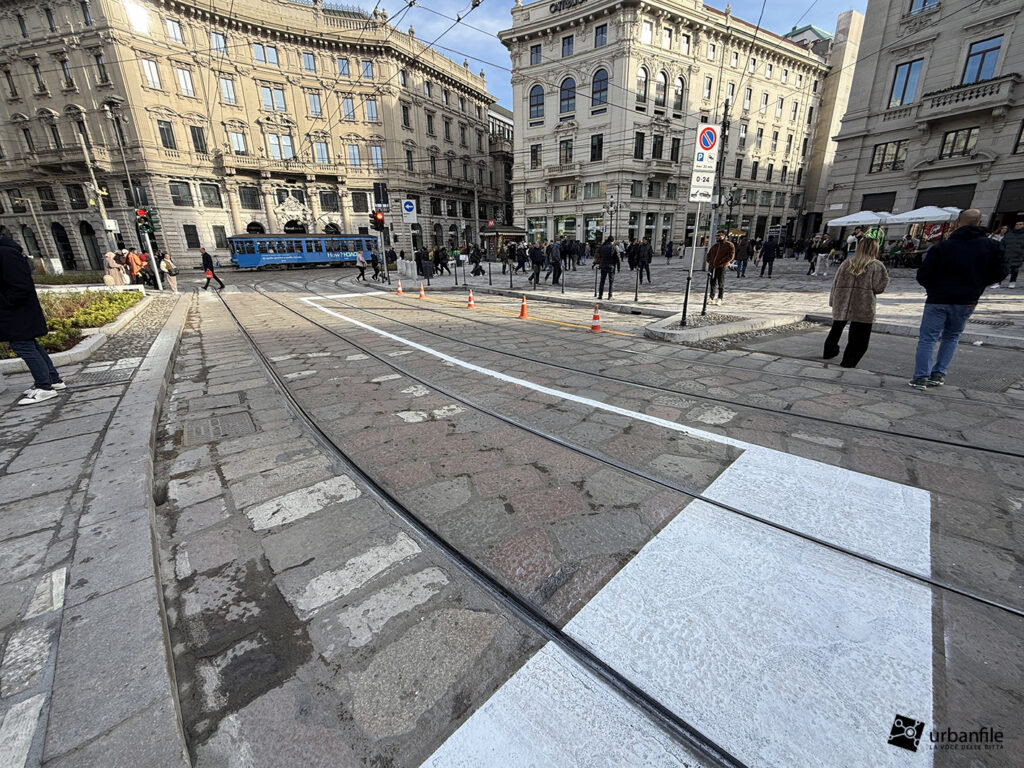 Sul lato verso la breve via Cordusio è stato mantenuto un passaggio carrabile all’interno della nuova area pedonale meridionale, creando una situazione un po’ “promiscua”. Un dislivello, come quello presente nell’area riservata a tram e taxi, avrebbe reso più percepibile il rischio. In alternativa, si è optato per una fitta presenza di paletti (“parigine”) in metallo, che speriamo resistano nel tempo. In precedenza, qui, un semaforo regolava l’alternanza tra pedoni e veicoli.