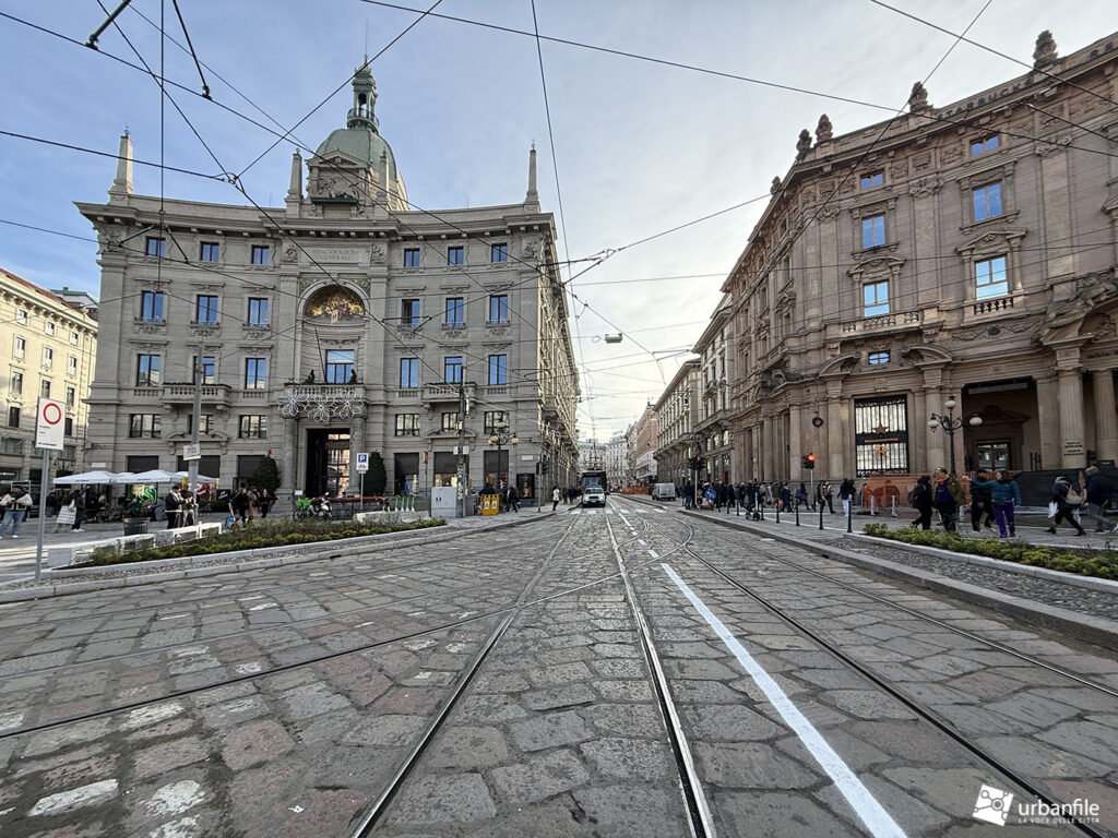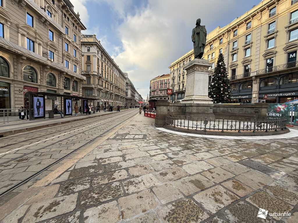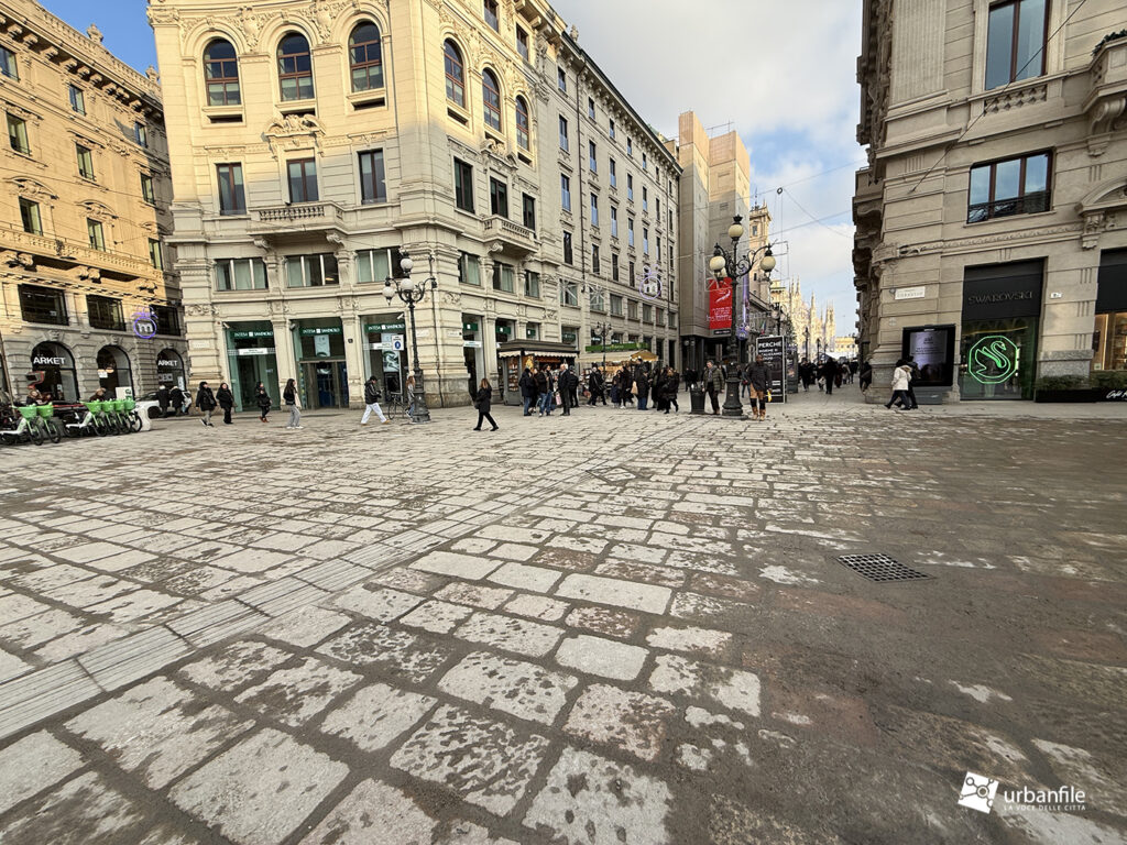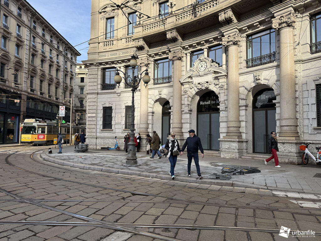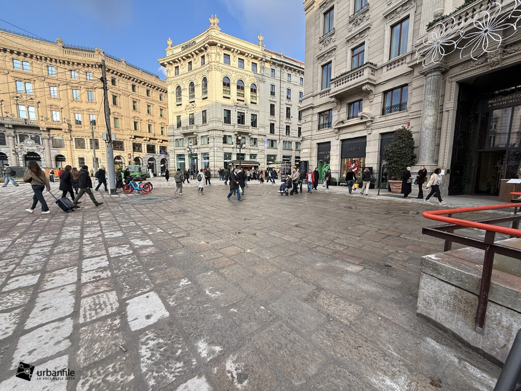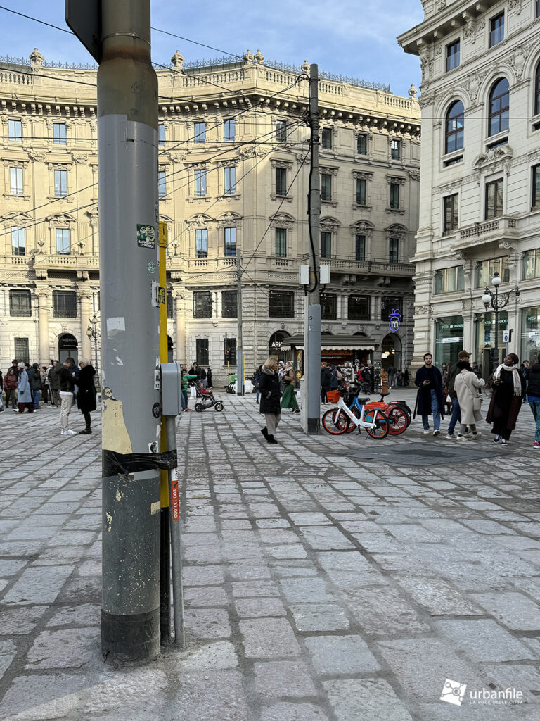 Raggiungiamo quindi l’ellittica piazza Cordusio. L’intervento era senza dubbio necessario: la piazza era diventata un parcheggio improvvisato per ogni tipo di mezzo, un luogo di attraversamento più che di sosta.