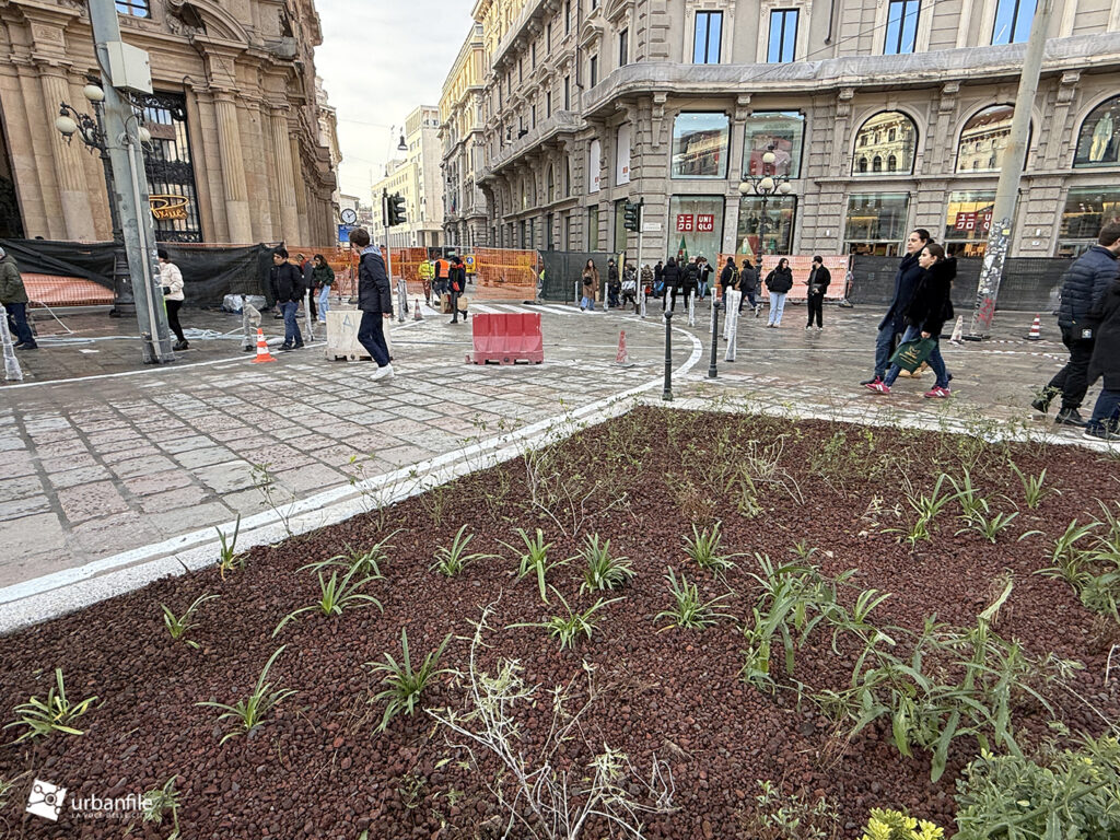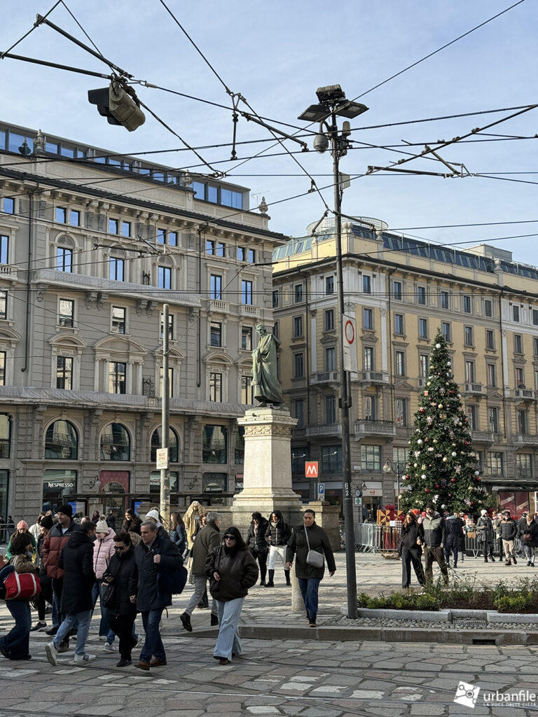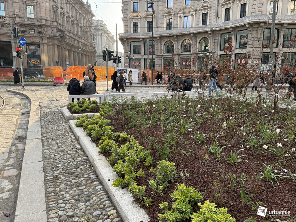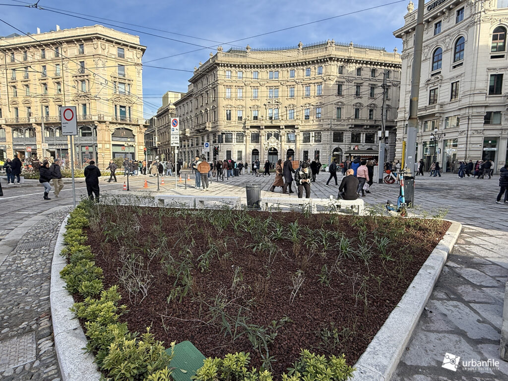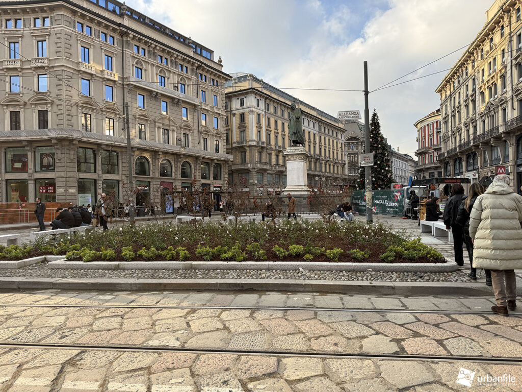Dicembre 2025. Presentato definitivamente (dopo alcuni anni di studi e lavori – 2024) ad aprile di quest’anno e avviato subito dopo, con un cambio di direzione a lavori avviati sul verde da inserire nella piazza, il progetto di riqualificazione di piazza Cordusio si è concluso in circa sei mesi e a tempo record – non avremmo mai sperato tanto. La piazza è stata finalmente liberata dalle cesate di cantiere (mancano solo piccoli ritocchi qua e là) ed è tornata fruibile.