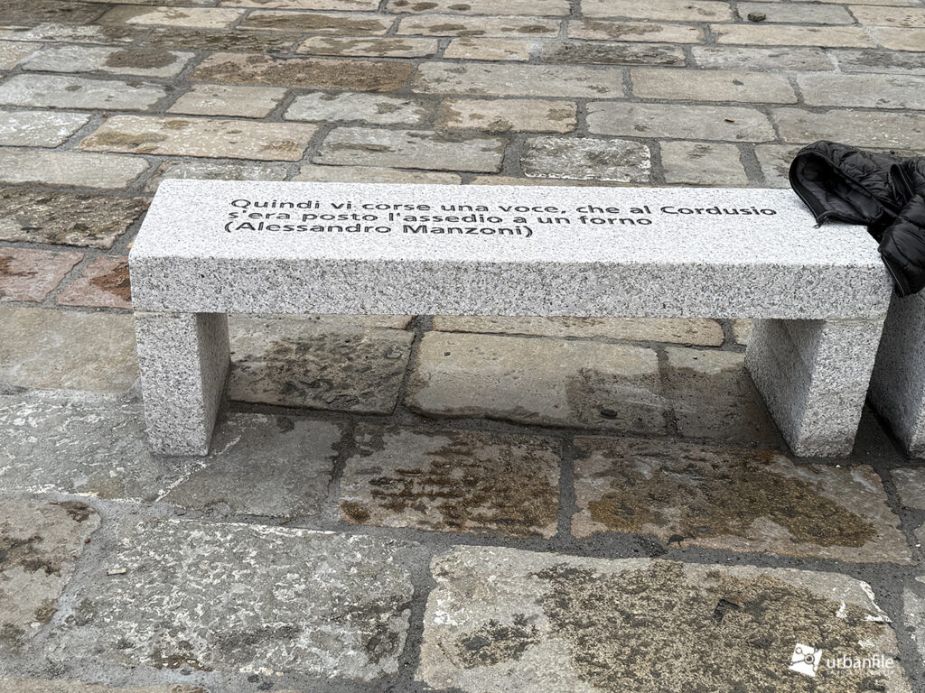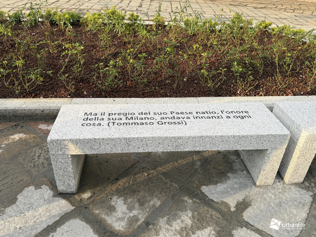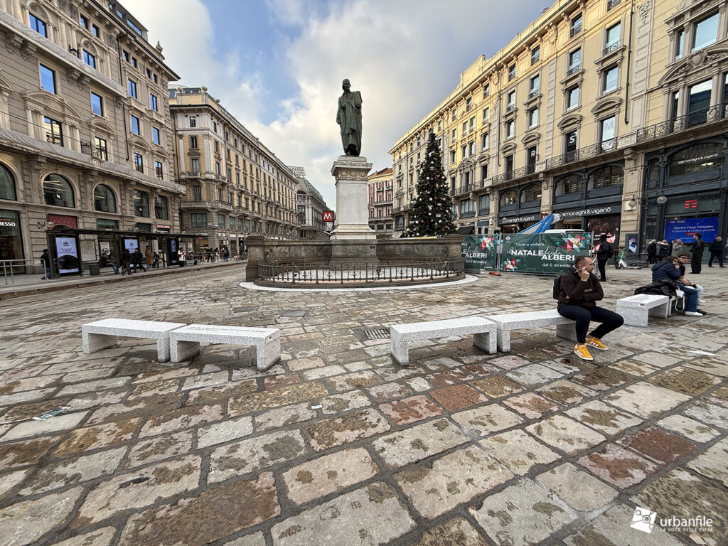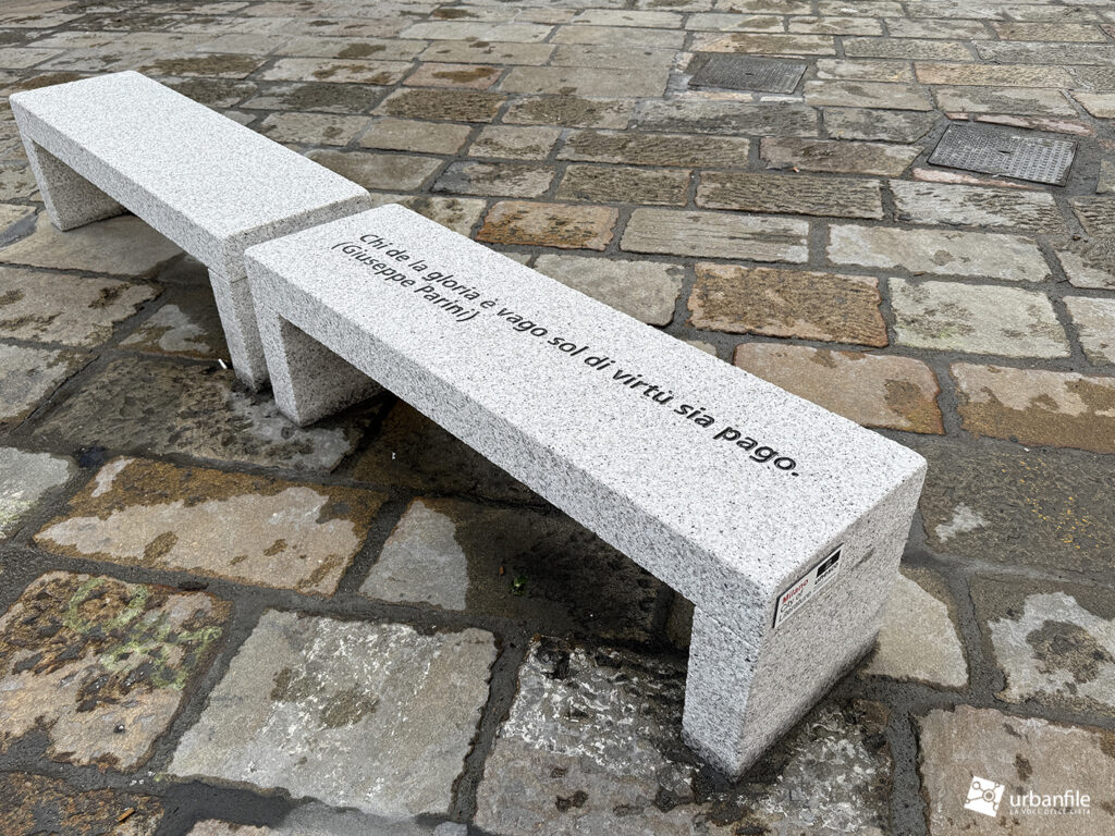 In piazza sono finalmente arrivate anche le panchine: 28 panche in granito, quattro delle quali riportano incisioni letterarie. Davanti alla statua di Parini si legge: «Chi de la gloria è vago sol di virtù sia pago». Poco più in là Manzoni ricorda: «Al Cordusio s’era posto l’assedio a un forno». Grossi scrive: «L’onore della sua dolce Milano andava innanzi a ogni cosa», mentre Verri annota: «Alberigo Conte governava nell’865, di alloggio in Curia Ducis, dove è ora il Cordùs».