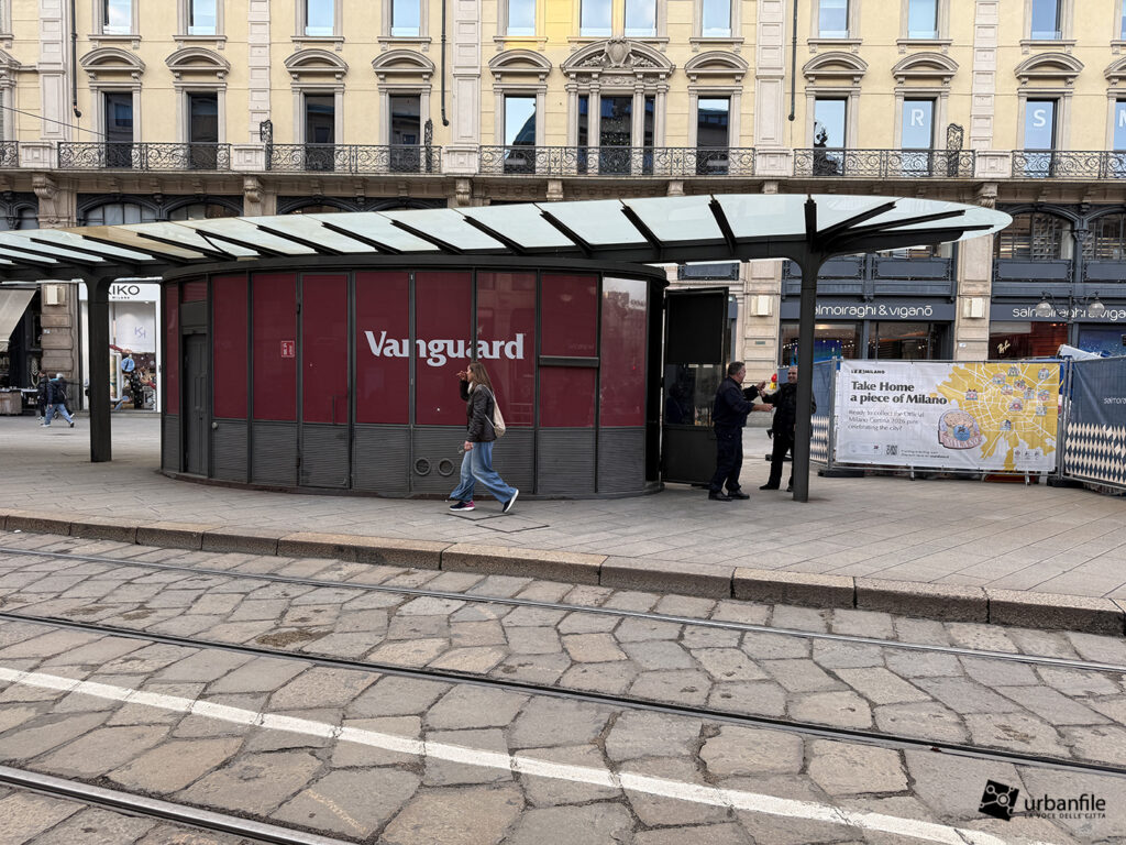 Accanto alla pensilina ATM compare infine un nuovo segno a terra, una piccola “rivelazione geometrica”: il punto esatto dal quale, ruotando su se stessi, si allineano Duomo, Castello e Galleria.