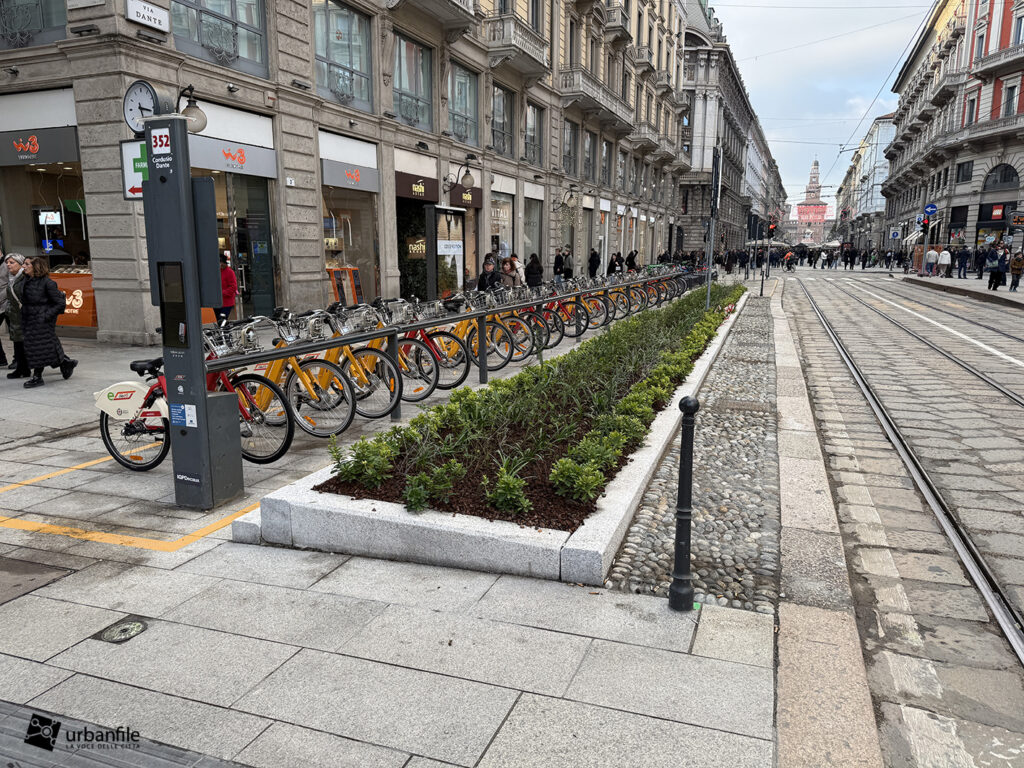 Molto riuscito, invece, l’ampliamento dei marciapiedi all’inizio di via Dante, dove l’isola della pensilina tranviaria è stata unita all’area dei negozi ed è stata realizzata una lunga aiuola. Forse le rastrelliere per le biciclette avrebbero potuto trovare posto altrove: con l’affollamento, questo tratto rischia di diventare un imbuto complicato.