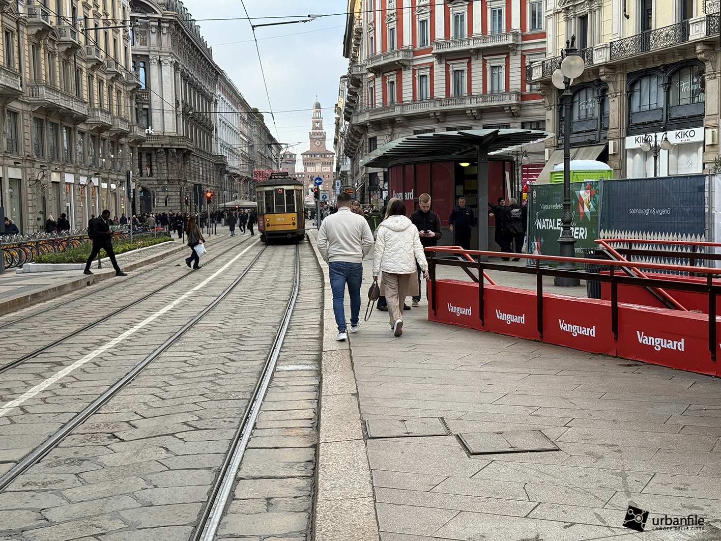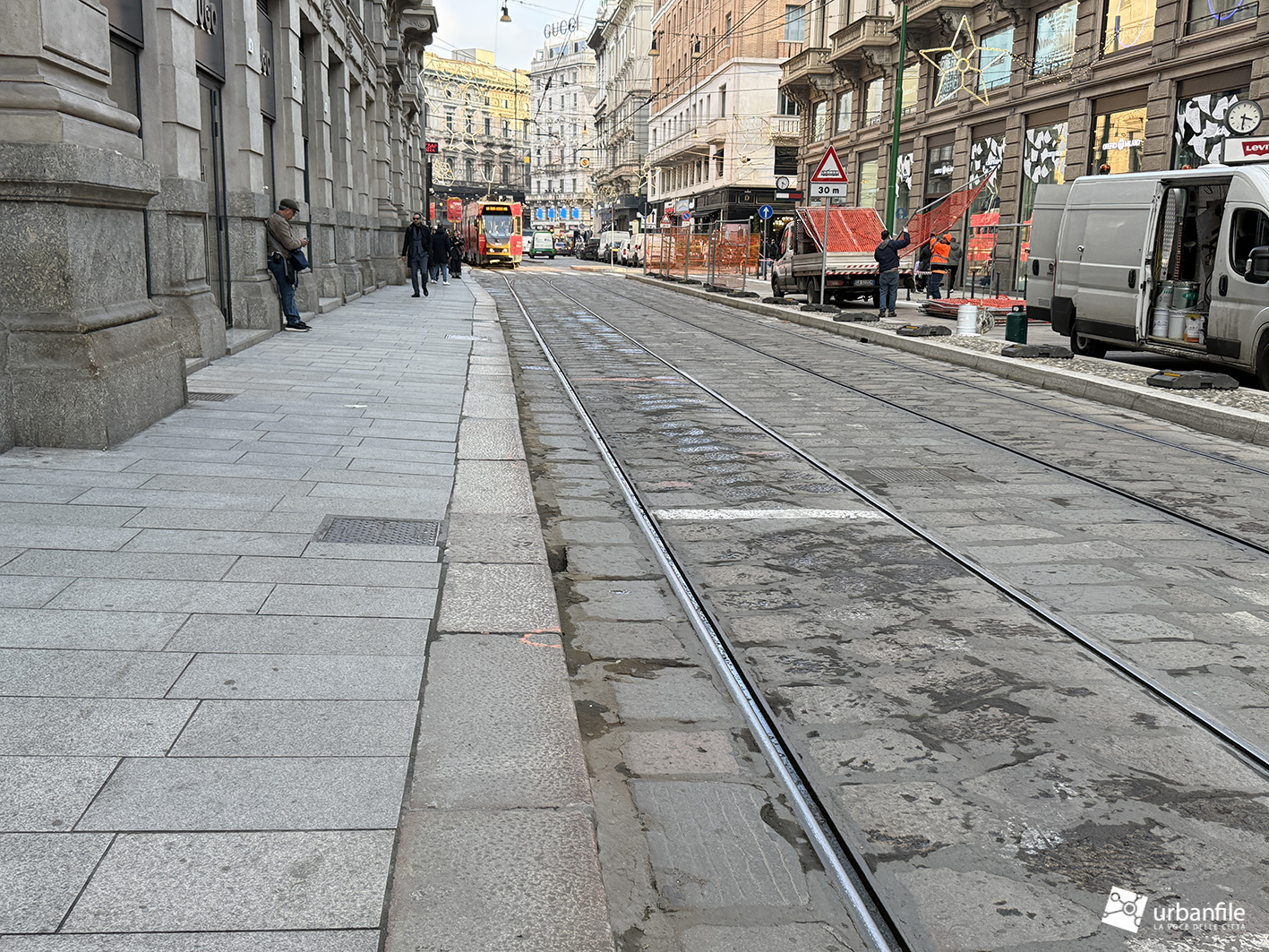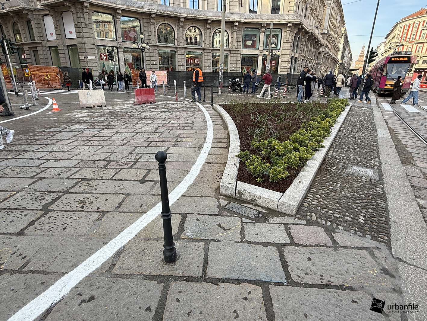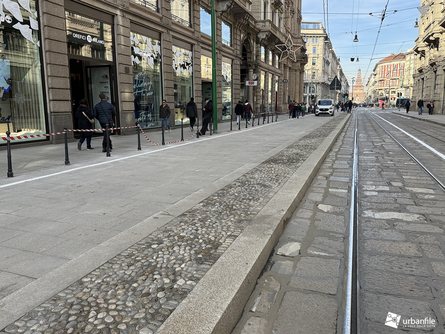 Partiamo proprio da via Orefici, che forse meritava qualcosa in più. Quantomeno una completa piastrellatura e una sistemazione definitiva dei marciapiedi. Il cantiere del lato dispari, infatti, è stato rinviato a dopo le Olimpiadi: oggi la pavimentazione in pietra interessa tutto il lato pari e solo parzialmente quello dispari, da piazza Cordusio a via Cesare Cantù. Peccato non siano stati spostati i binari secondo il progetto iniziale: ciò avrebbe consentito di allargare entrambi i marciapiedi, rendendo la via più ordinata e sicura. Le rotaie, invece, restano addossate al lato pari, dove il marciapiede, nel punto più stretto, misura circa un metro.