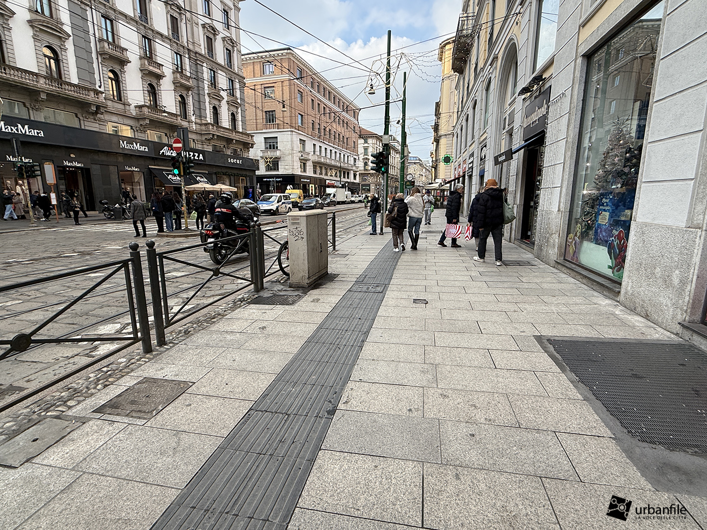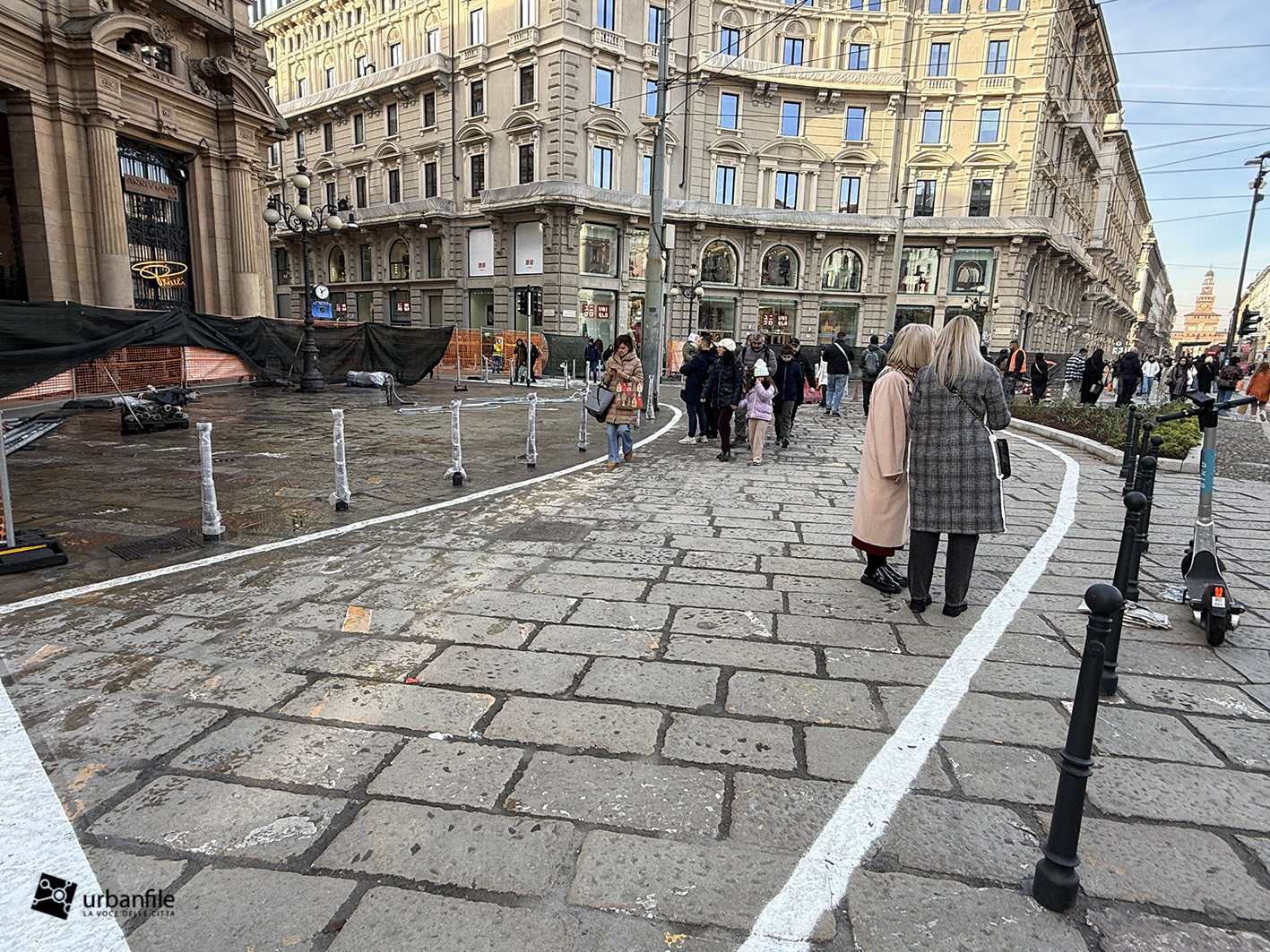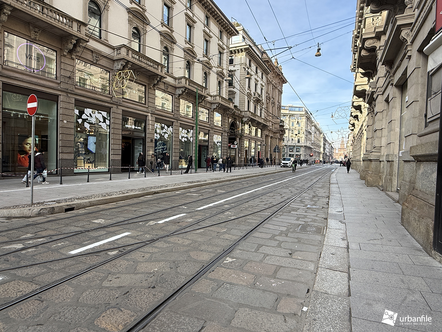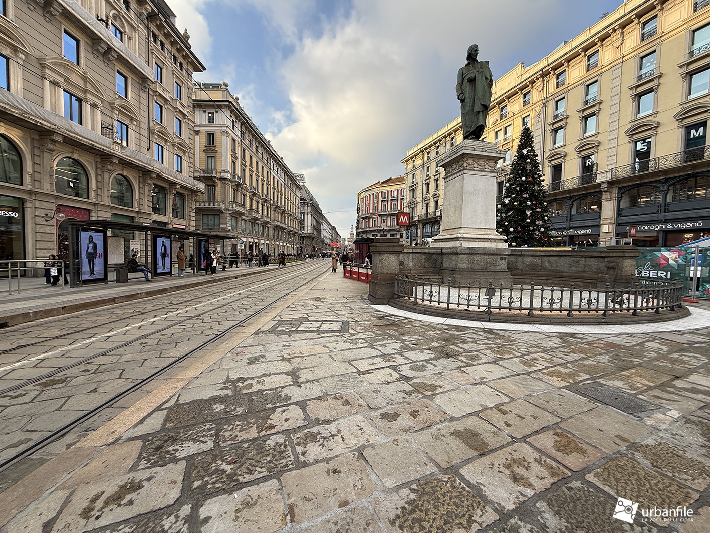 Partiamo proprio da via Orefici, che forse meritava qualcosa in più. Quantomeno una completa piastrellatura e una sistemazione definitiva dei marciapiedi. Il cantiere del lato dispari, infatti, è stato rinviato a dopo le Olimpiadi: oggi la pavimentazione in pietra interessa tutto il lato pari e solo parzialmente quello dispari, da piazza Cordusio a via Cesare Cantù. Peccato non siano stati spostati i binari secondo il progetto iniziale: ciò avrebbe consentito di allargare entrambi i marciapiedi, rendendo la via più ordinata e sicura. Le rotaie, invece, restano addossate al lato pari, dove il marciapiede, nel punto più stretto, misura circa un metro.