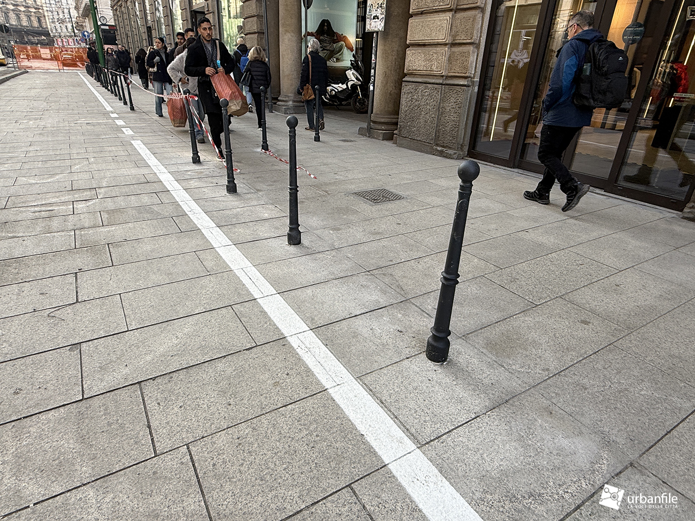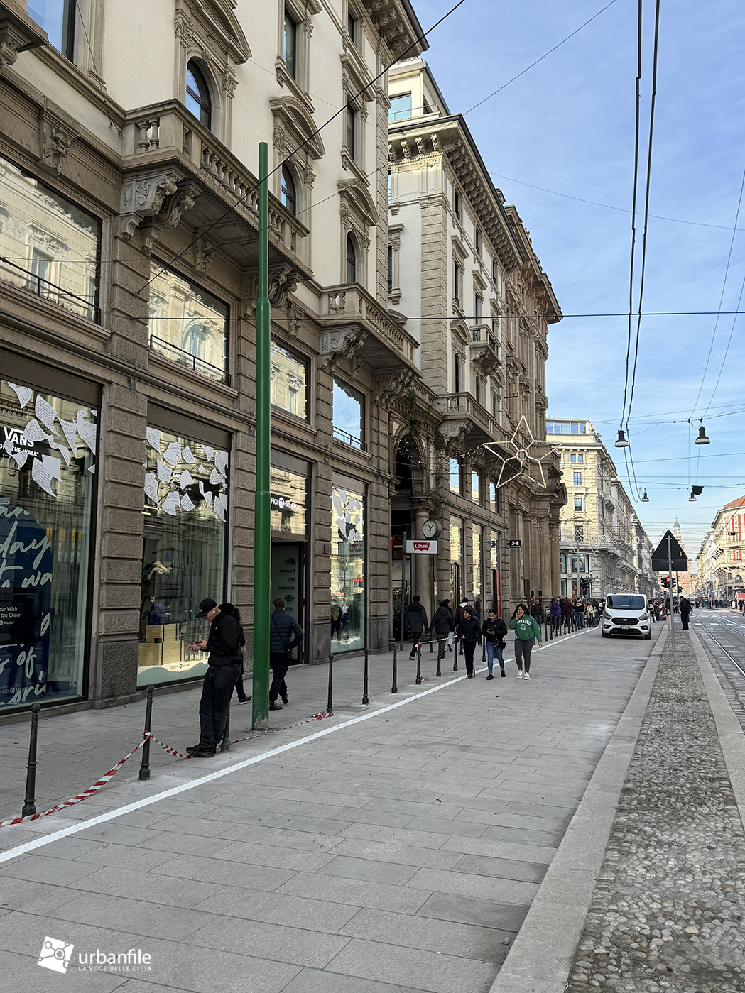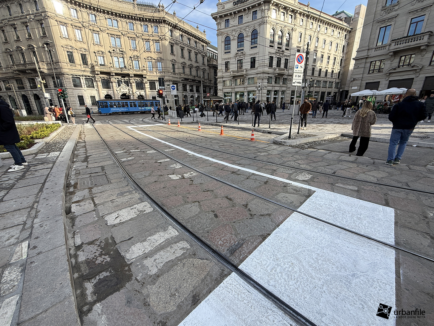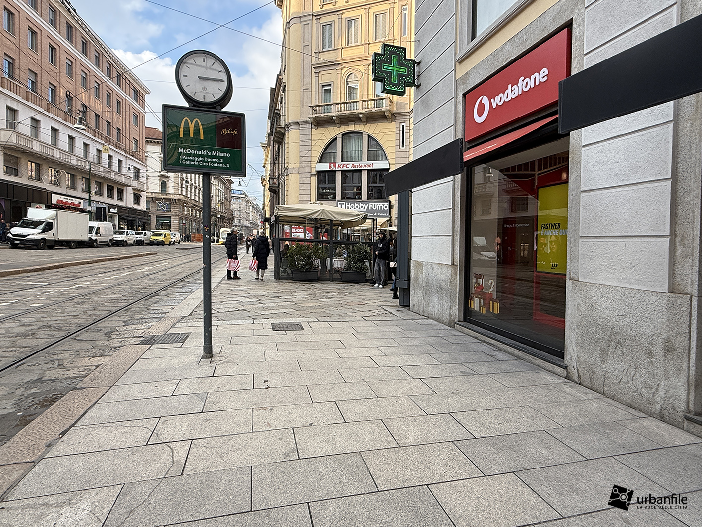 Partiamo proprio da via Orefici, che forse meritava qualcosa in più. Quantomeno una completa piastrellatura e una sistemazione definitiva dei marciapiedi. Il cantiere del lato dispari, infatti, è stato rinviato a dopo le Olimpiadi: oggi la pavimentazione in pietra interessa tutto il lato pari e solo parzialmente quello dispari, da piazza Cordusio a via Cesare Cantù. Peccato non siano stati spostati i binari secondo il progetto iniziale: ciò avrebbe consentito di allargare entrambi i marciapiedi, rendendo la via più ordinata e sicura. Le rotaie, invece, restano addossate al lato pari, dove il marciapiede, nel punto più stretto, misura circa un metro.