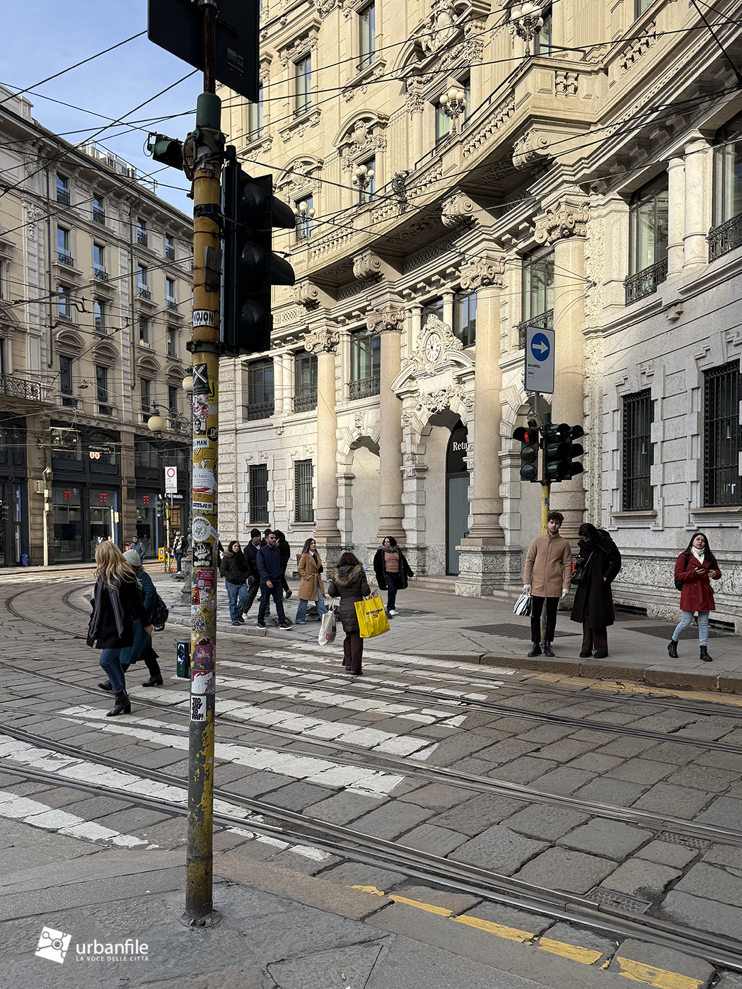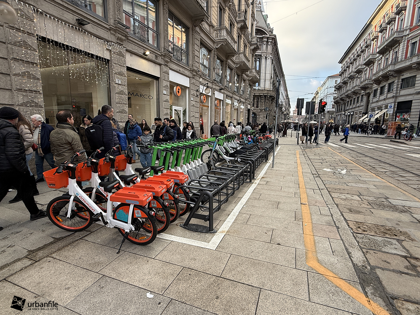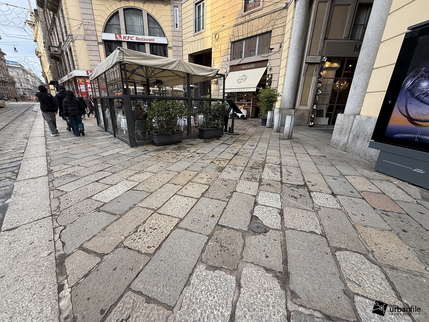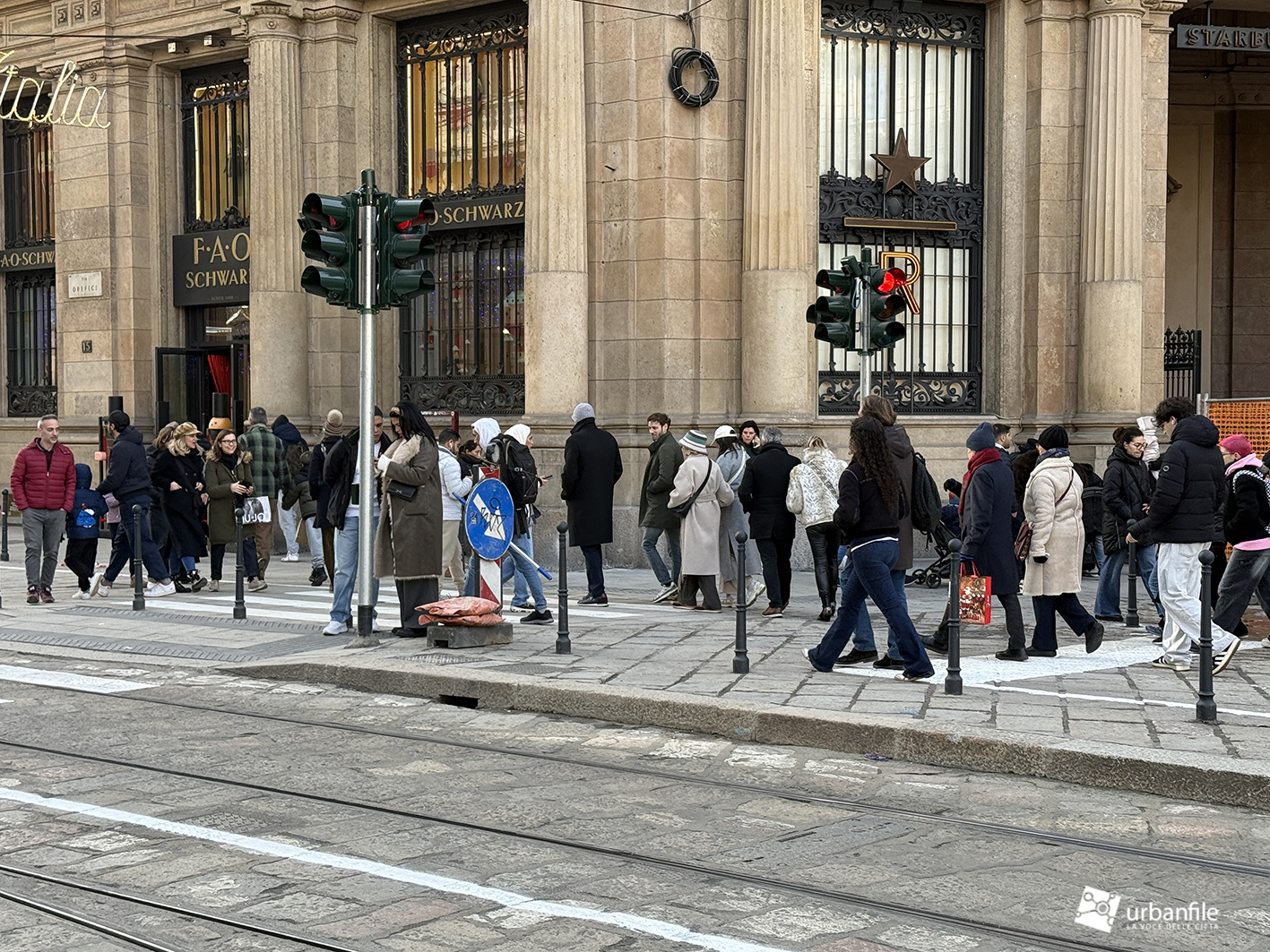Partiamo proprio da via Orefici, che forse meritava qualcosa in più. Quantomeno una completa piastrellatura e una sistemazione definitiva dei marciapiedi. Il cantiere del lato dispari, infatti, è stato rinviato a dopo le Olimpiadi: oggi la pavimentazione in pietra interessa tutto il lato pari e solo parzialmente quello dispari, da piazza Cordusio a via Cesare Cantù. Peccato non siano stati spostati i binari secondo il progetto iniziale: ciò avrebbe consentito di allargare entrambi i marciapiedi, rendendo la via più ordinata e sicura. Le rotaie, invece, restano addossate al lato pari, dove il marciapiede, nel punto più stretto, misura circa un metro.
