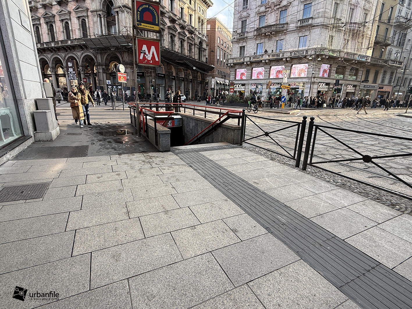 Sul lato verso la breve via Cordusio è stato mantenuto un passaggio carrabile all’interno della nuova area pedonale meridionale, creando una situazione un po’ “promiscua”. Un dislivello, come quello presente nell’area riservata a tram e taxi, avrebbe reso più percepibile il rischio. In alternativa, si è optato per una fitta presenza di paletti (“parigine”) in metallo, che speriamo resistano nel tempo. In precedenza, qui, un semaforo regolava l’alternanza tra pedoni e veicoli.