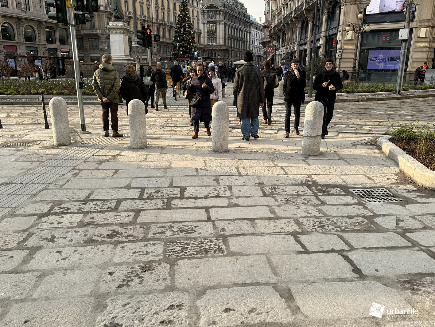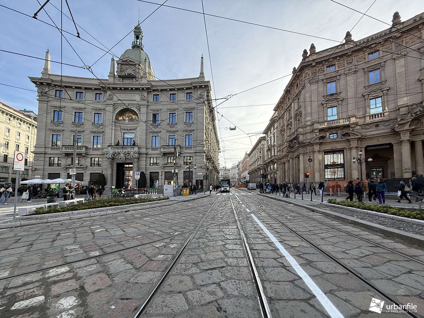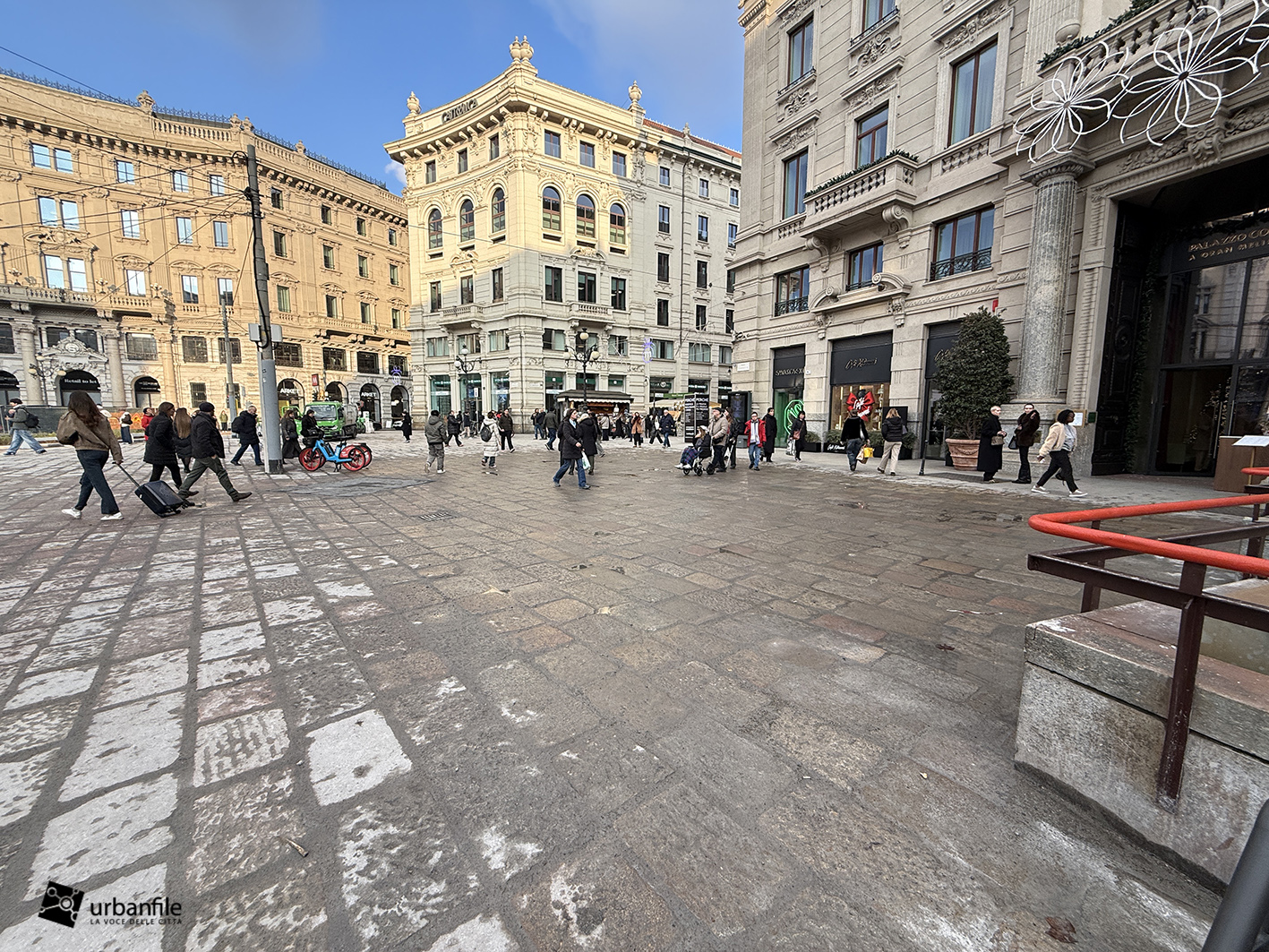 Veniamo ora al nostro sopralluogo, effettuato tra la folla dei giorni pre-natalizi. L’intervento complessivo – dal costo di quasi quattro milioni di euro, finanziato per oltre metà da Generali Real Estate e per il resto da Hines – ha interessato circa 6.000 metri quadrati tra piazza Cordusio, via Cordusio, un tratto di via Orefici e l’inizio di via Dante.