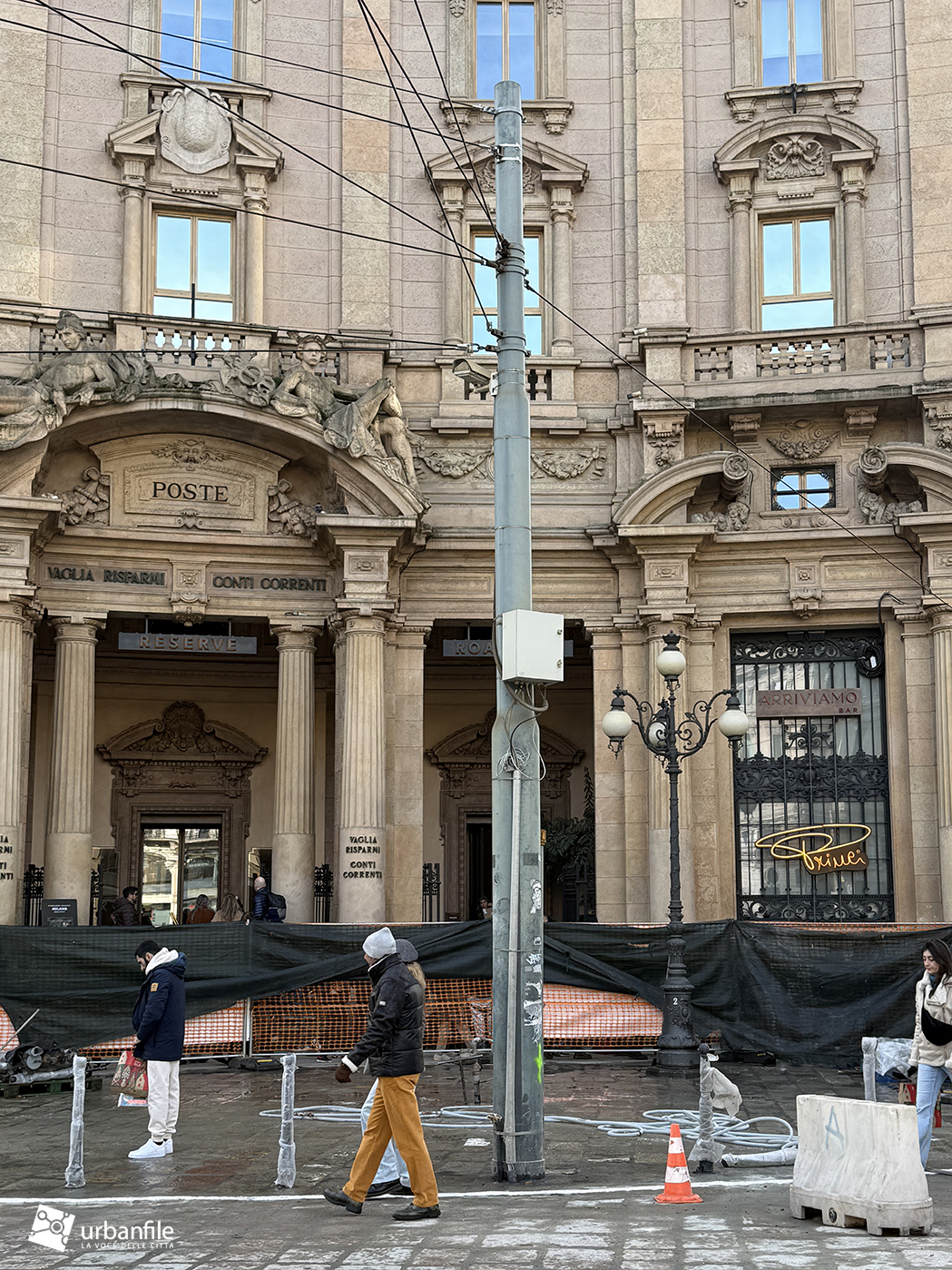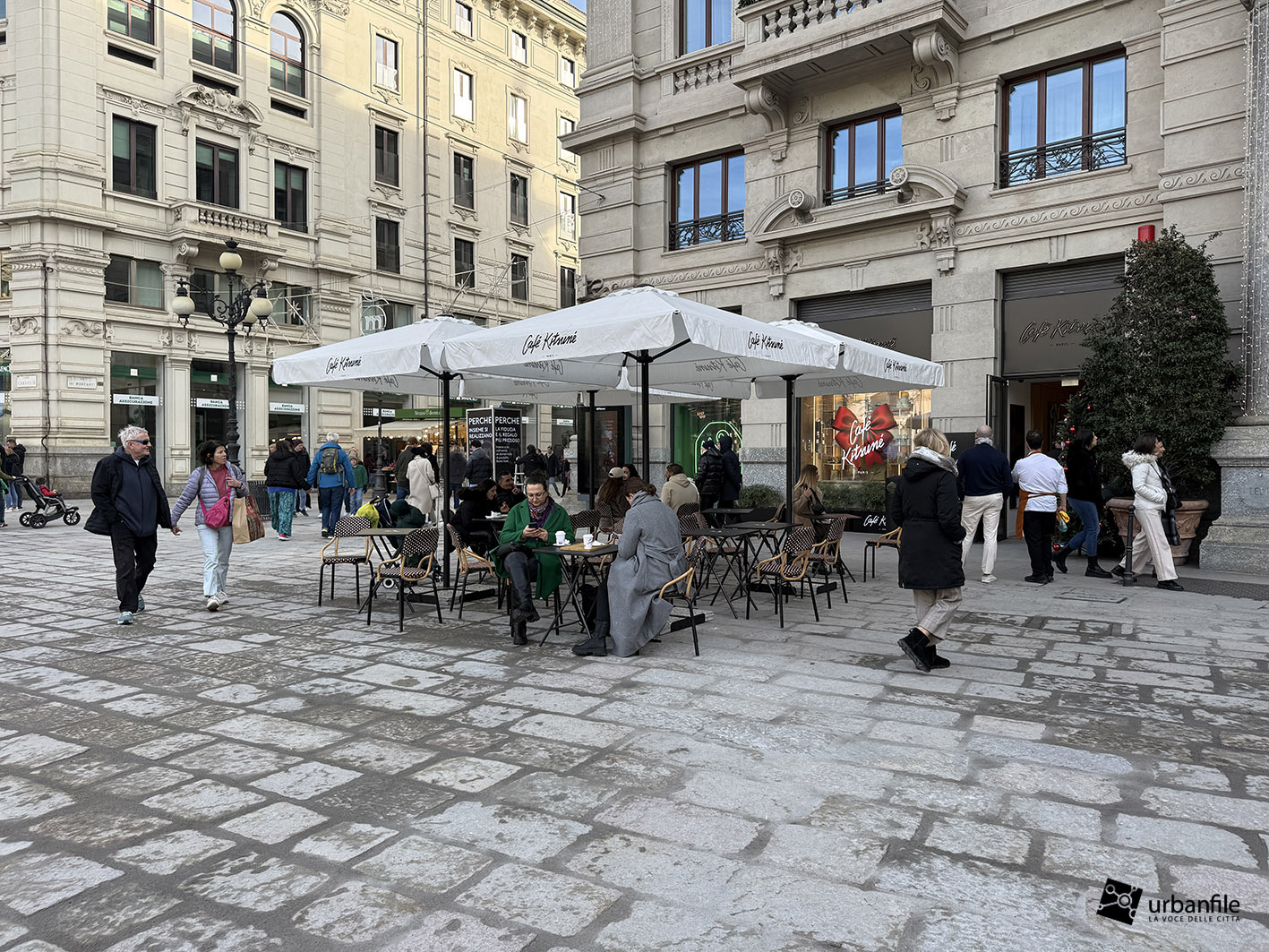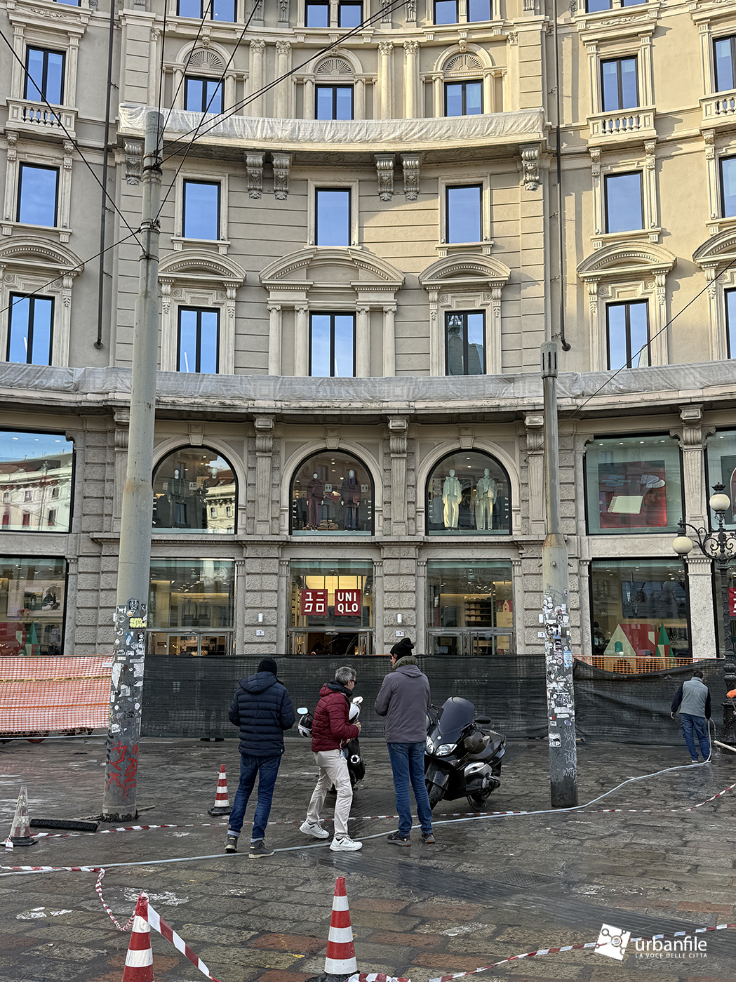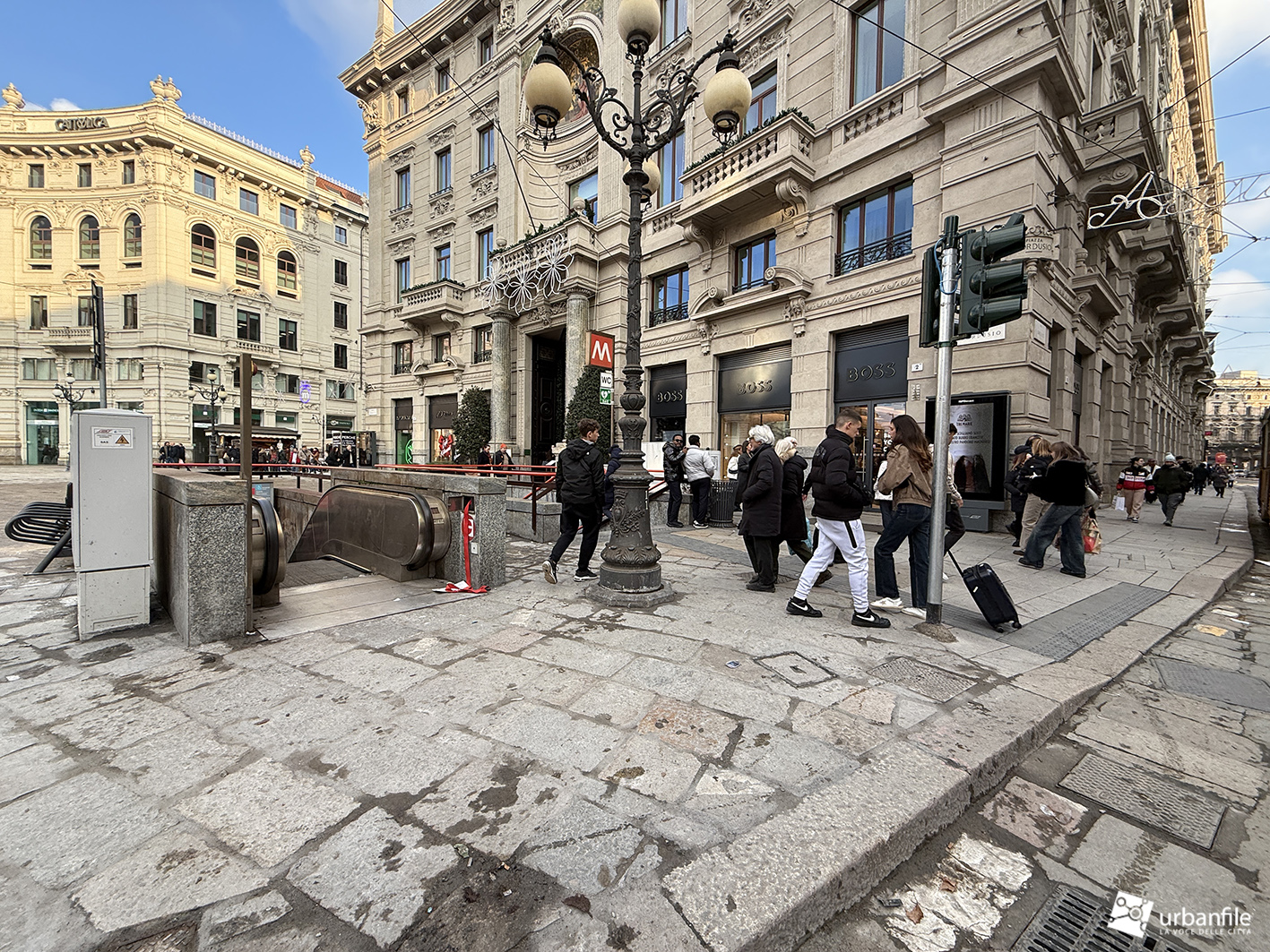 Veniamo ora al nostro sopralluogo, effettuato tra la folla dei giorni pre-natalizi. L’intervento complessivo – dal costo di quasi quattro milioni di euro, finanziato per oltre metà da Generali Real Estate e per il resto da Hines – ha interessato circa 6.000 metri quadrati tra piazza Cordusio, via Cordusio, un tratto di via Orefici e l’inizio di via Dante.